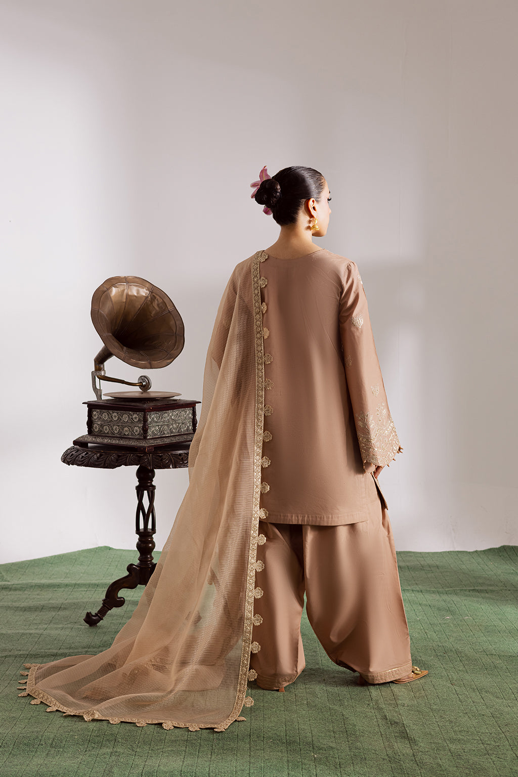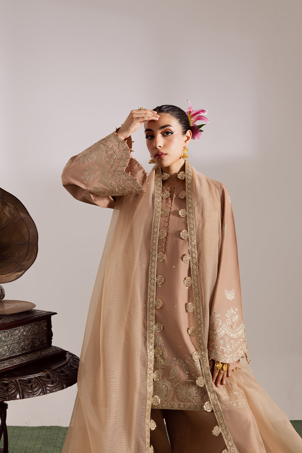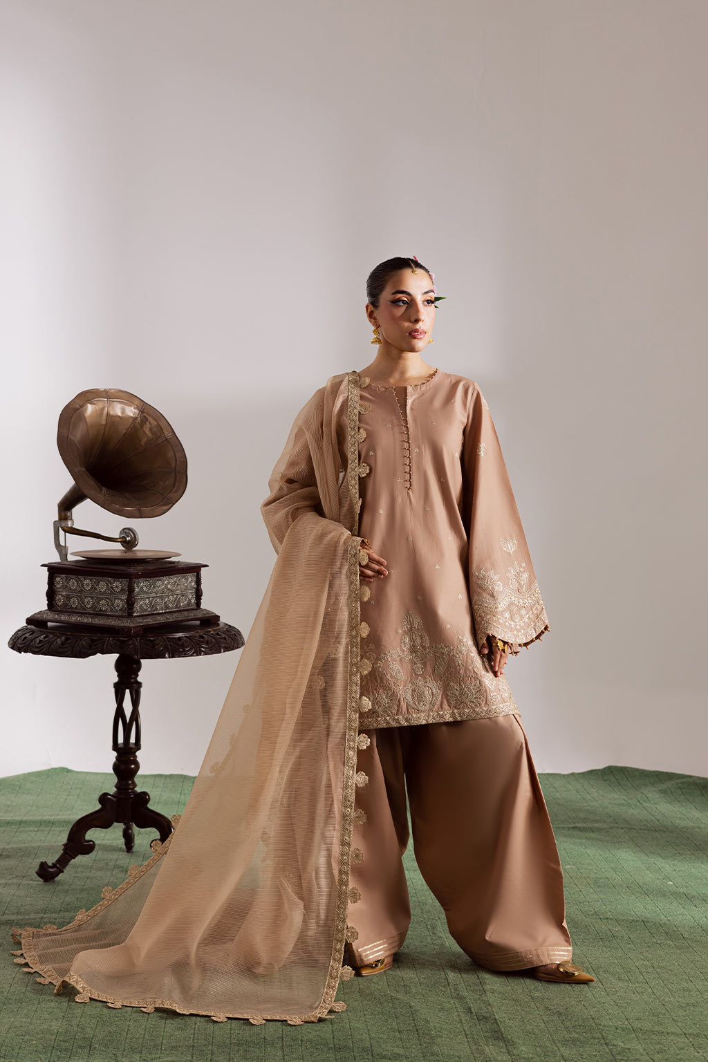Beige embroidered cotton shirt with farshi shalwar and khadi slub dupatta featuring four sided embroidered borders