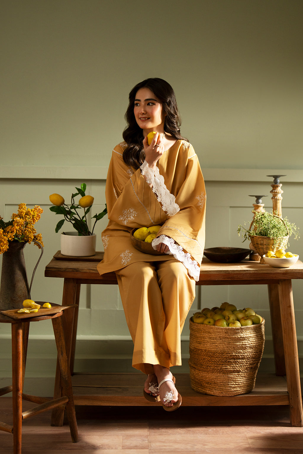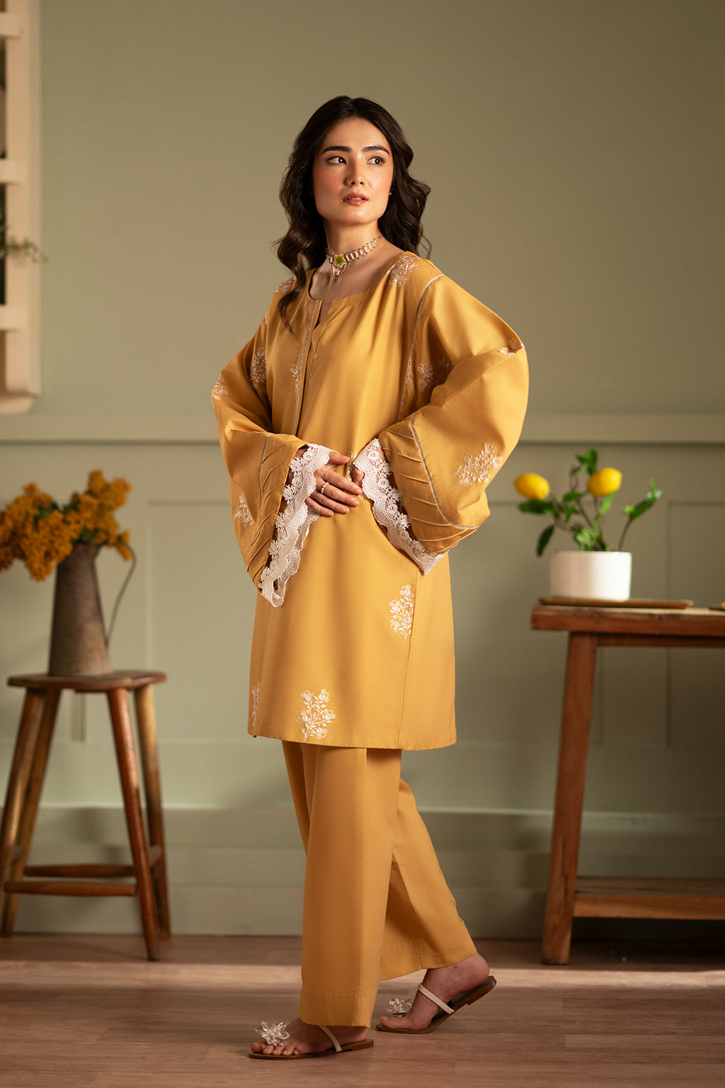 Straight short shirt with culottes. Motifs embroidery on the front of the shirt. The sleeves have lace near the opening.