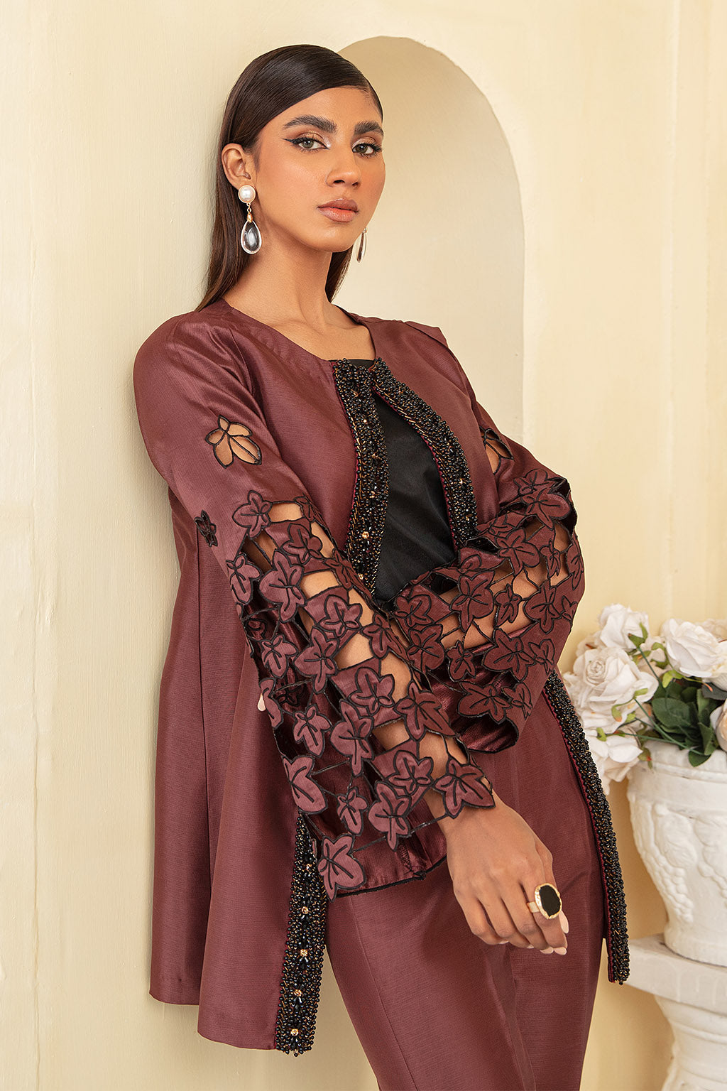 - An Exquisite 3-Pc Including Embellished Jacket Paired With Straight Pant & Inner (Adda work front placket Patti)