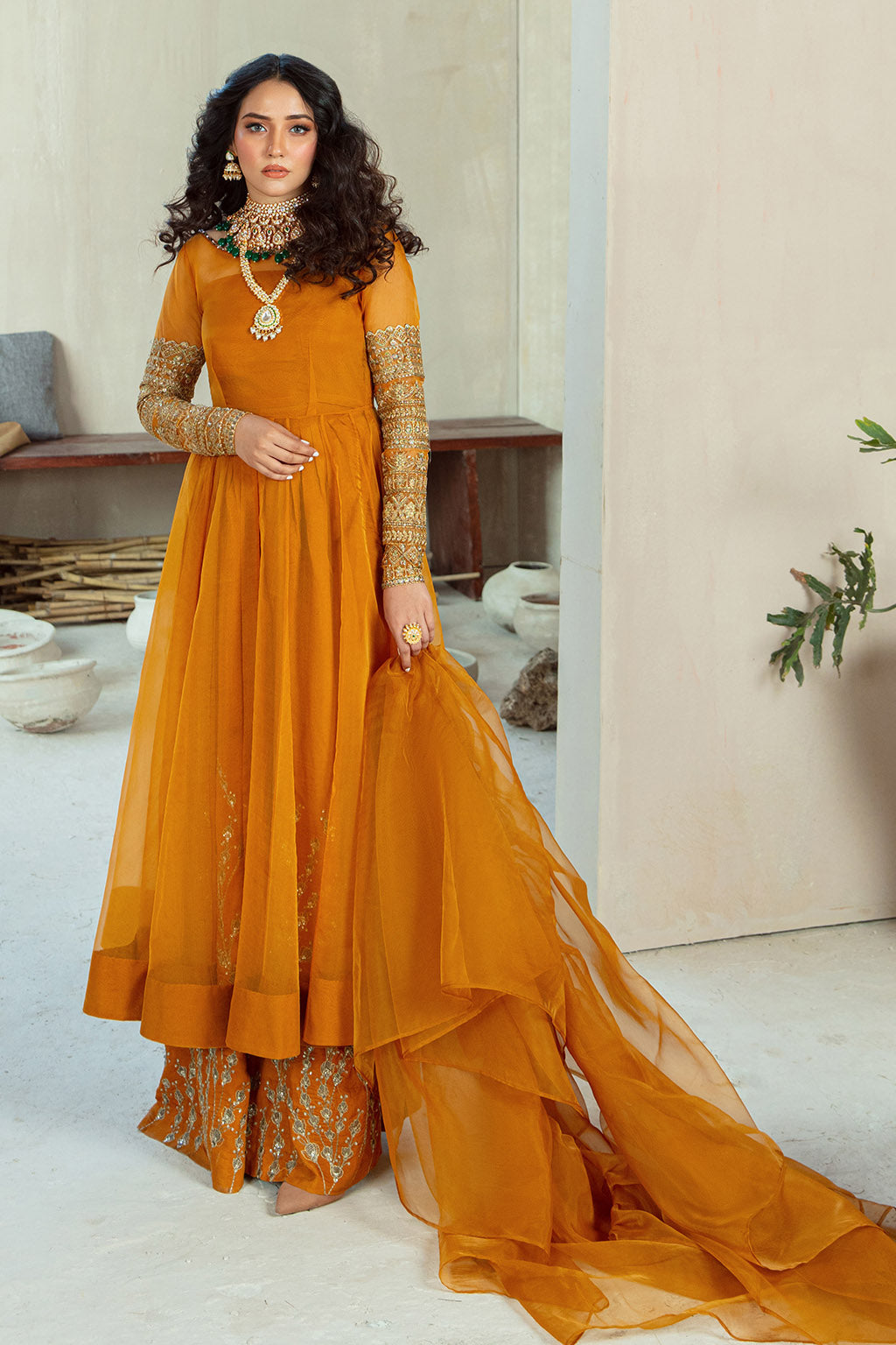 - Modern cutline front open organza paneled frock with heavy embroidered fitted sleeves