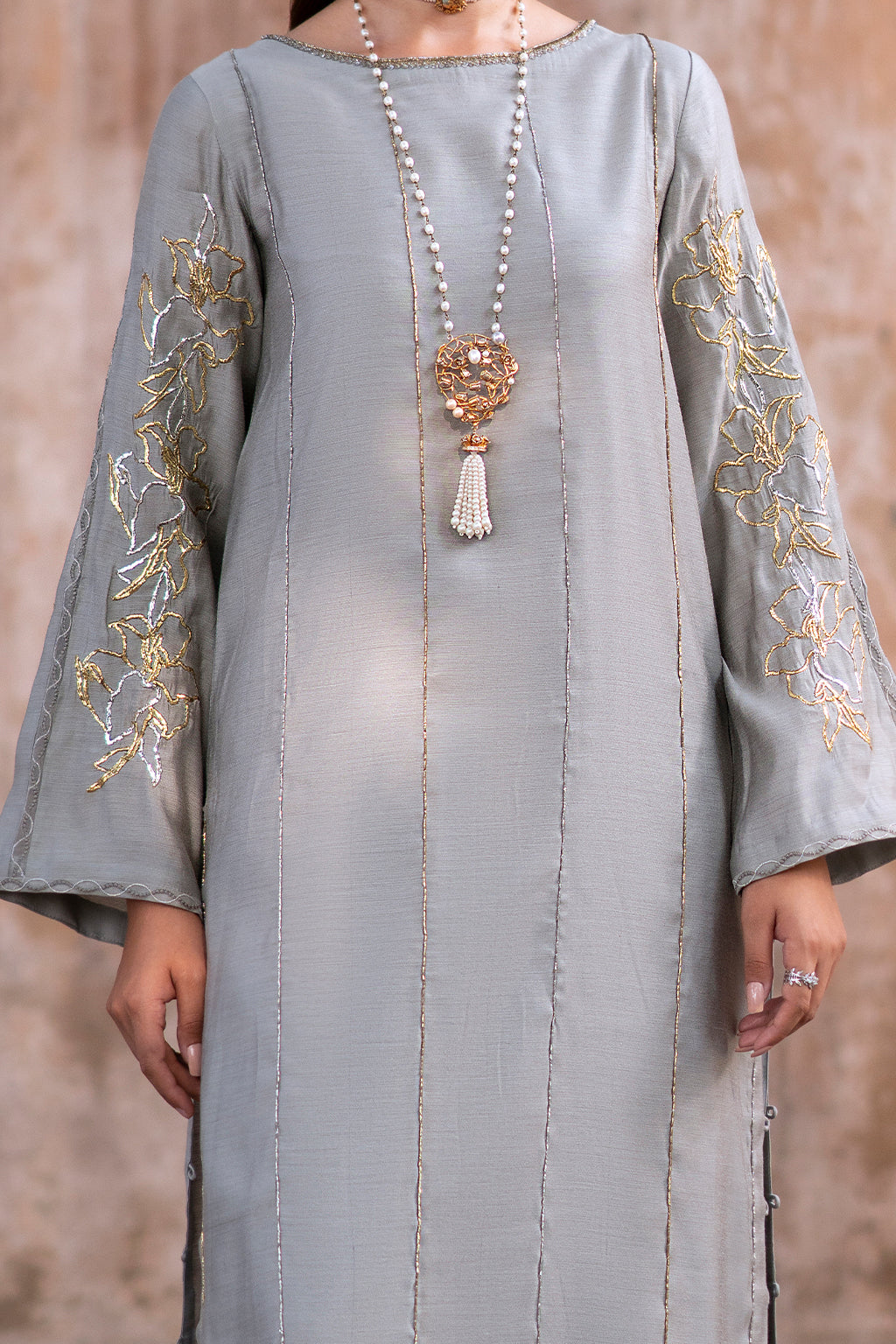Slate shirt with hand Embellishment on front and Mukaish work on sleeves, paired with trouser and organza dupatta