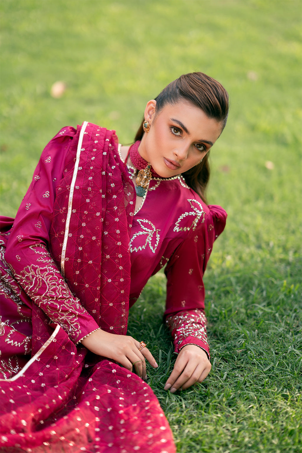 Berry colored raw silk with floral sequinned embroidered details paired with embroidered organza dupatta, paired with shalwar.