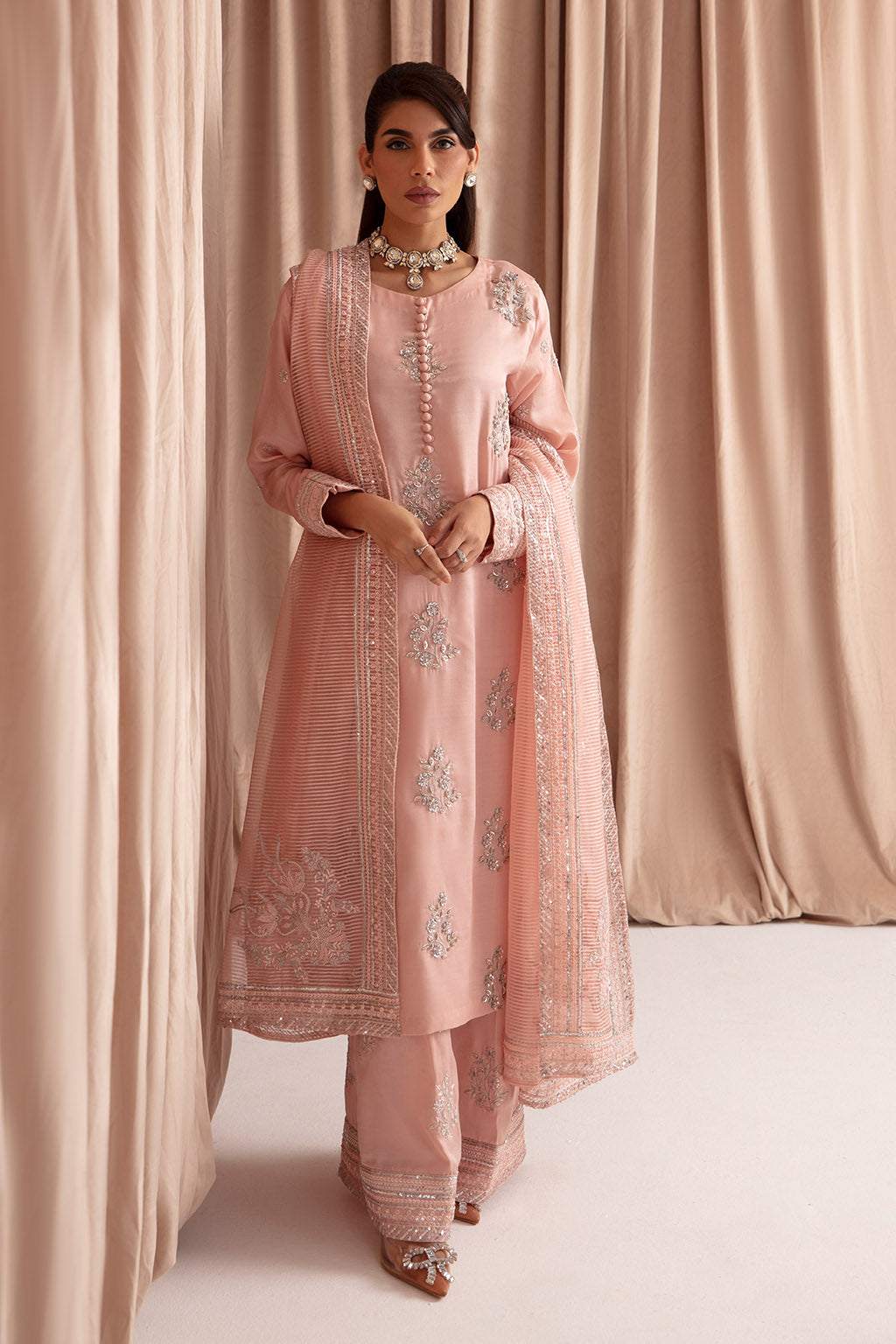 • Kattan silk pink hued ensemble adorned with intricate details.