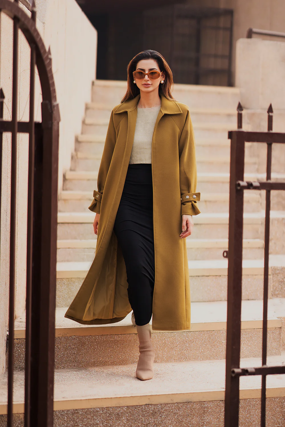 Mustard soft fine woollen fabric tailored full sleeves long coat