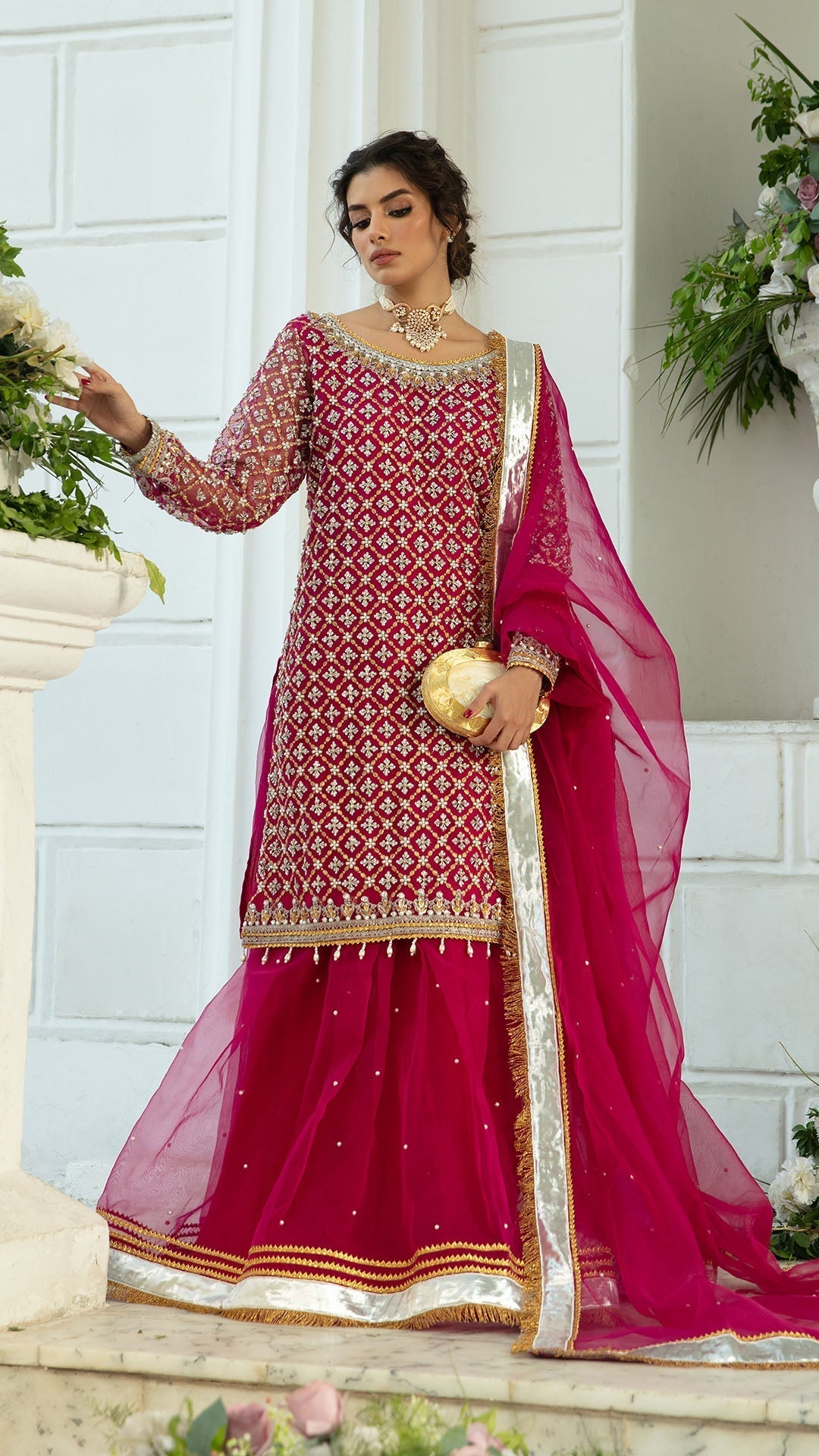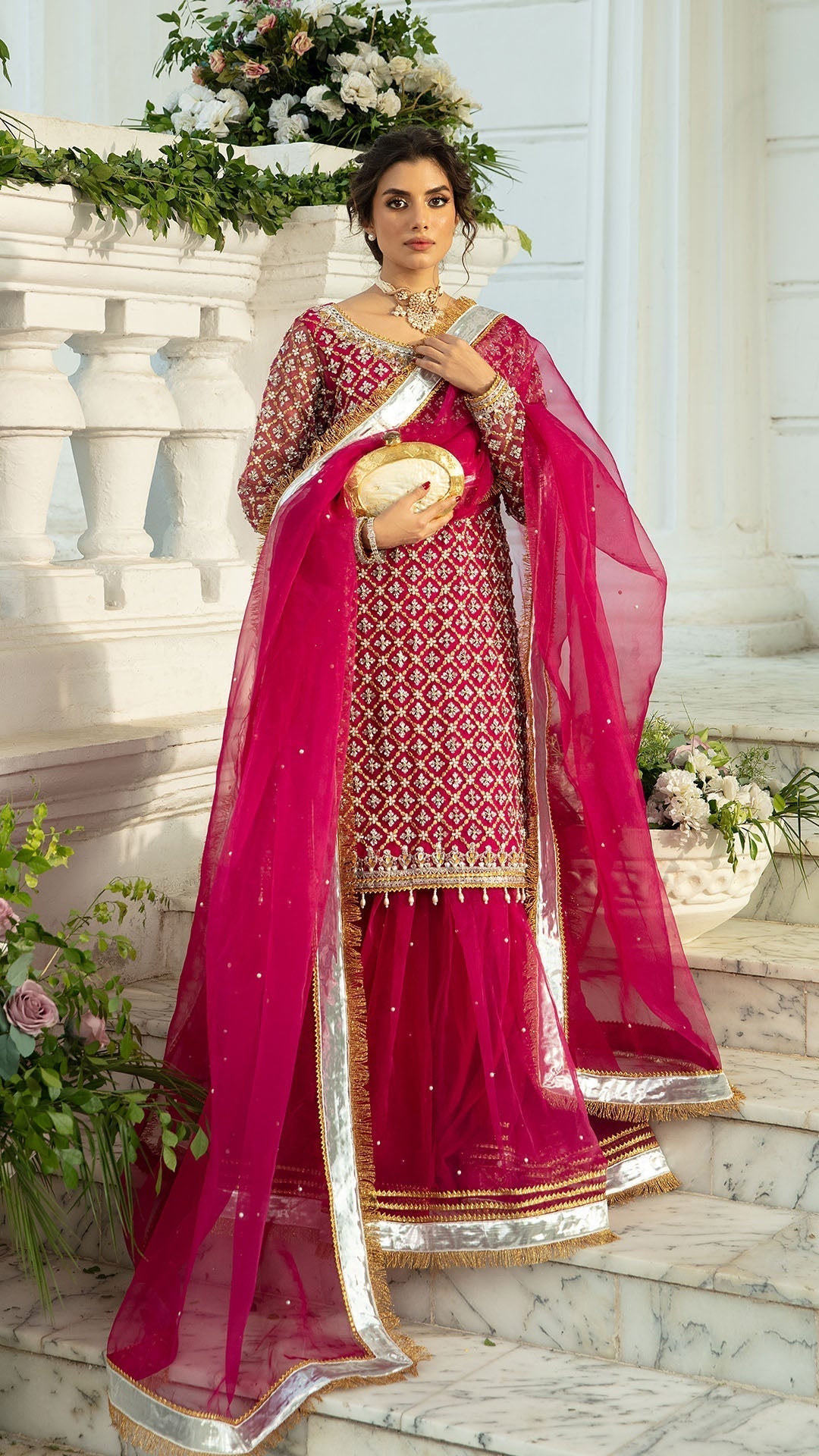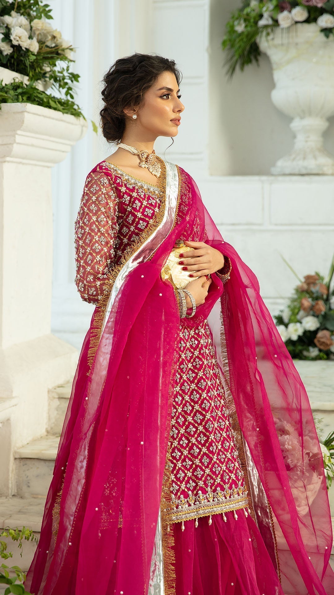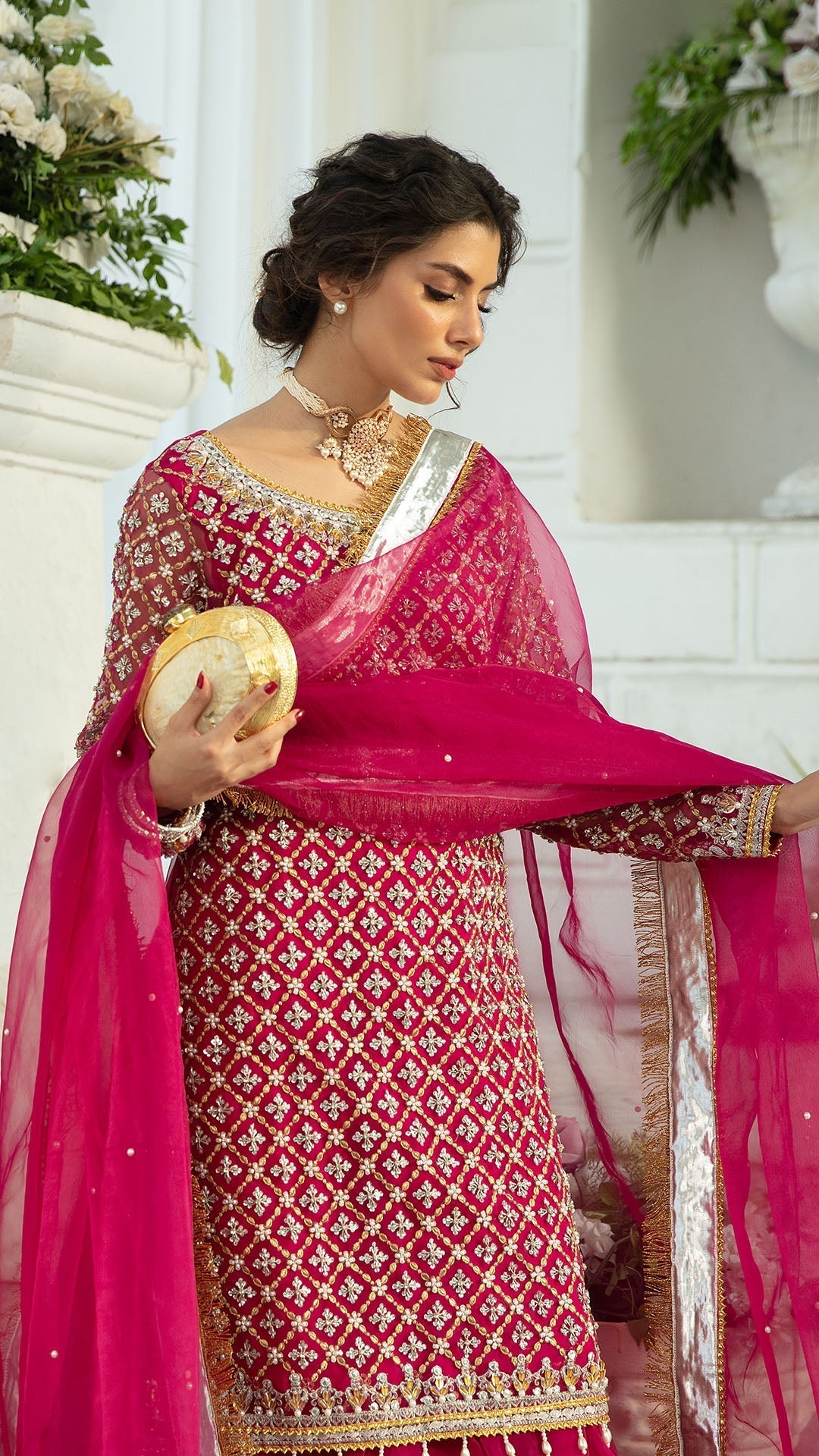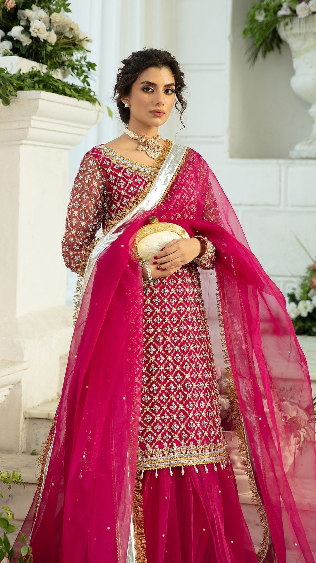• A 3 pcs hot pink outfit adorned with exquisite embroidery detail, paired up with matching Organza lehnga and dupatta comes with embroidered side extensions.