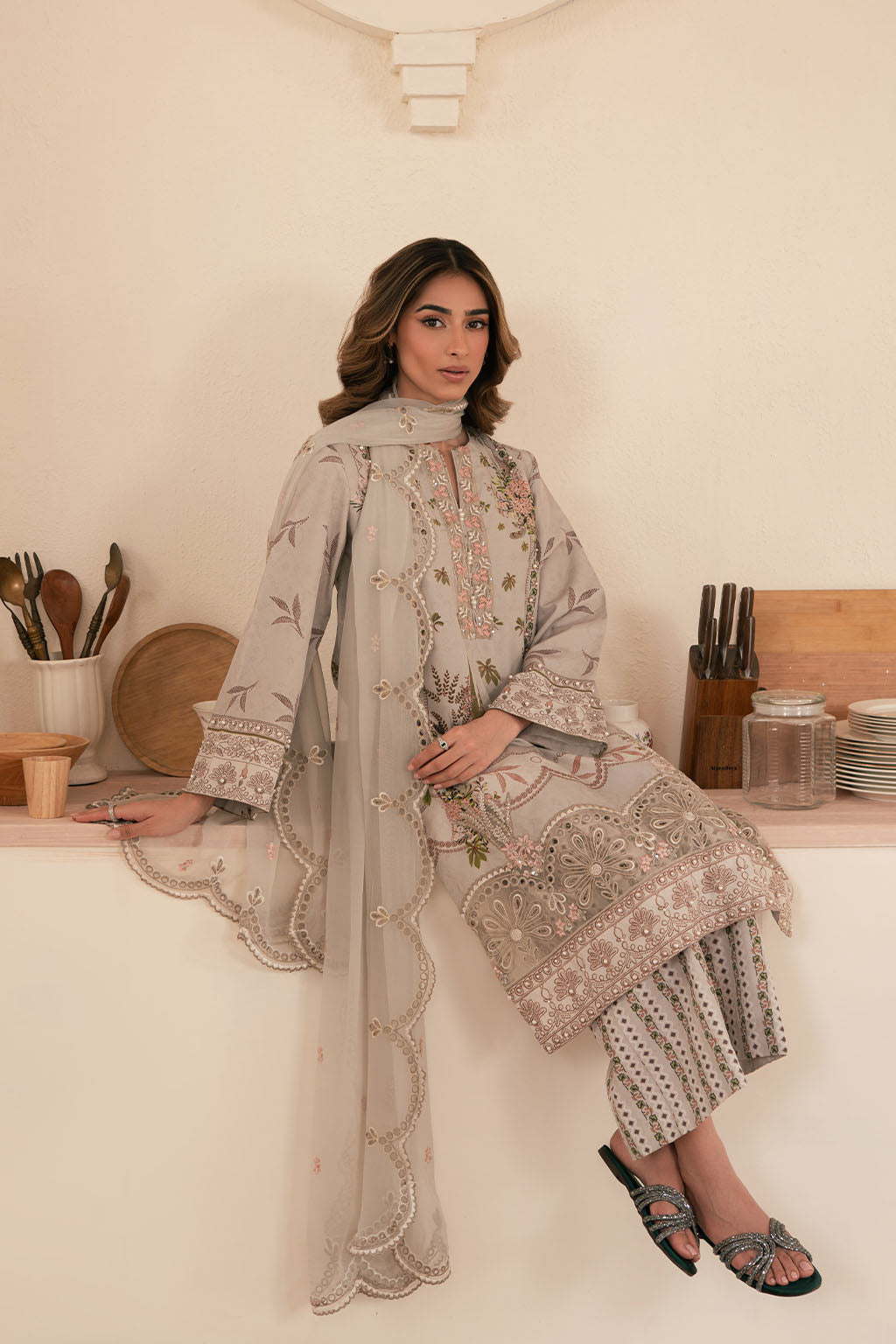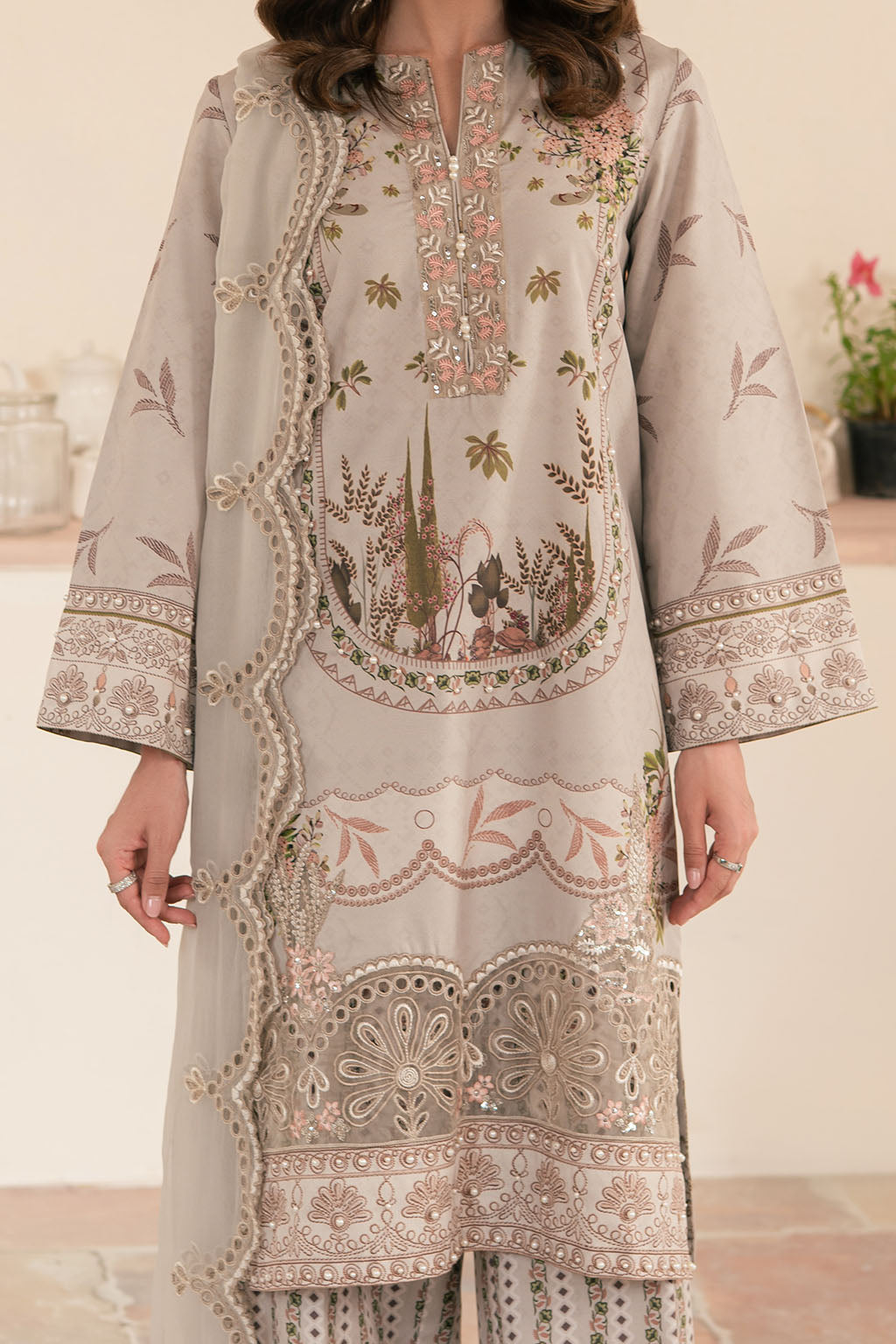 Printed lawn embroidered shirt, paired with printed lawn silk trouser & contrasting embroidered chiffon dupatta