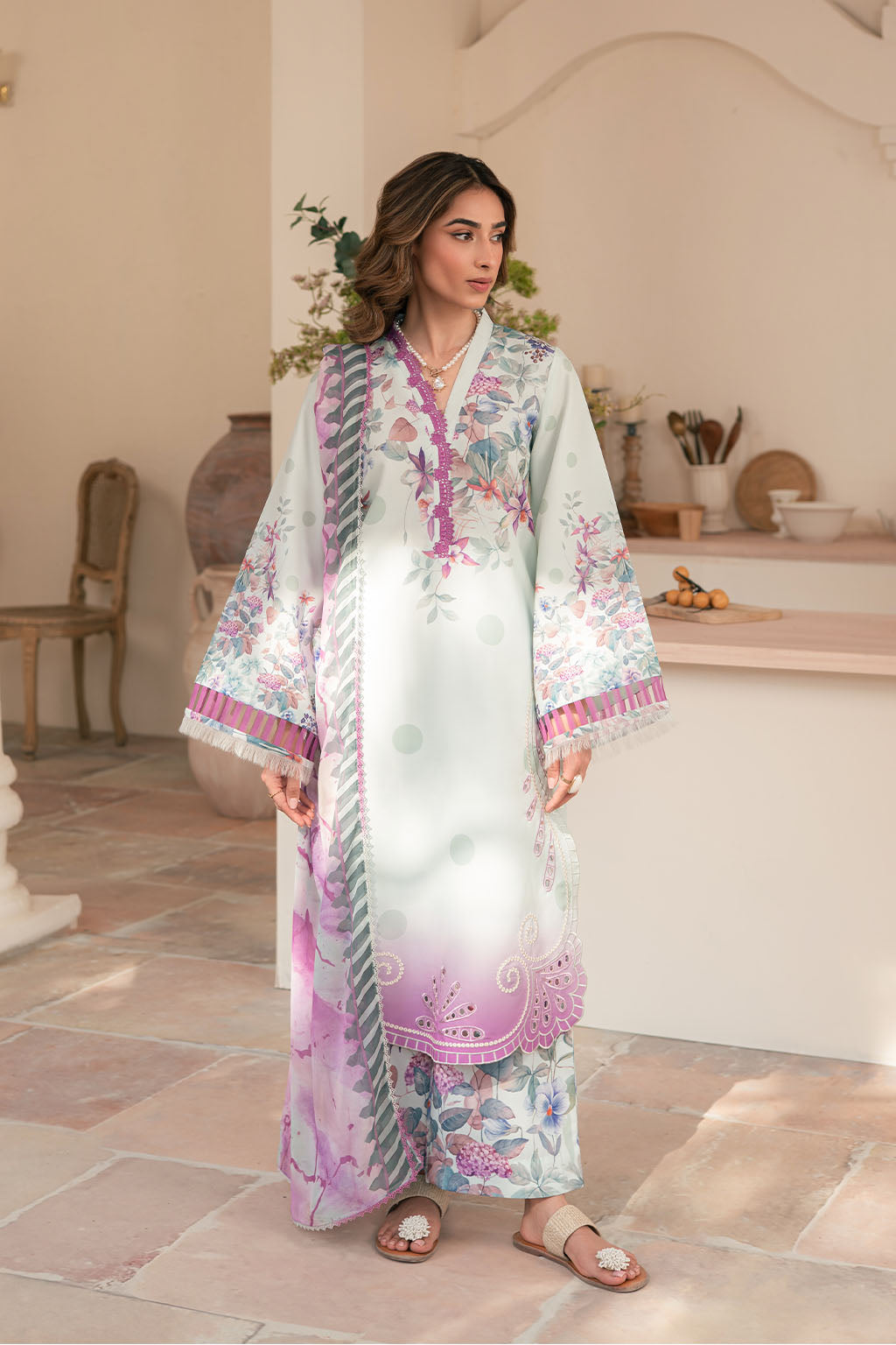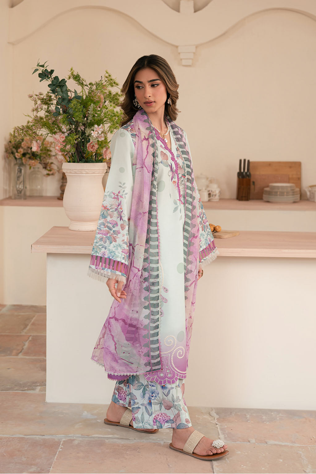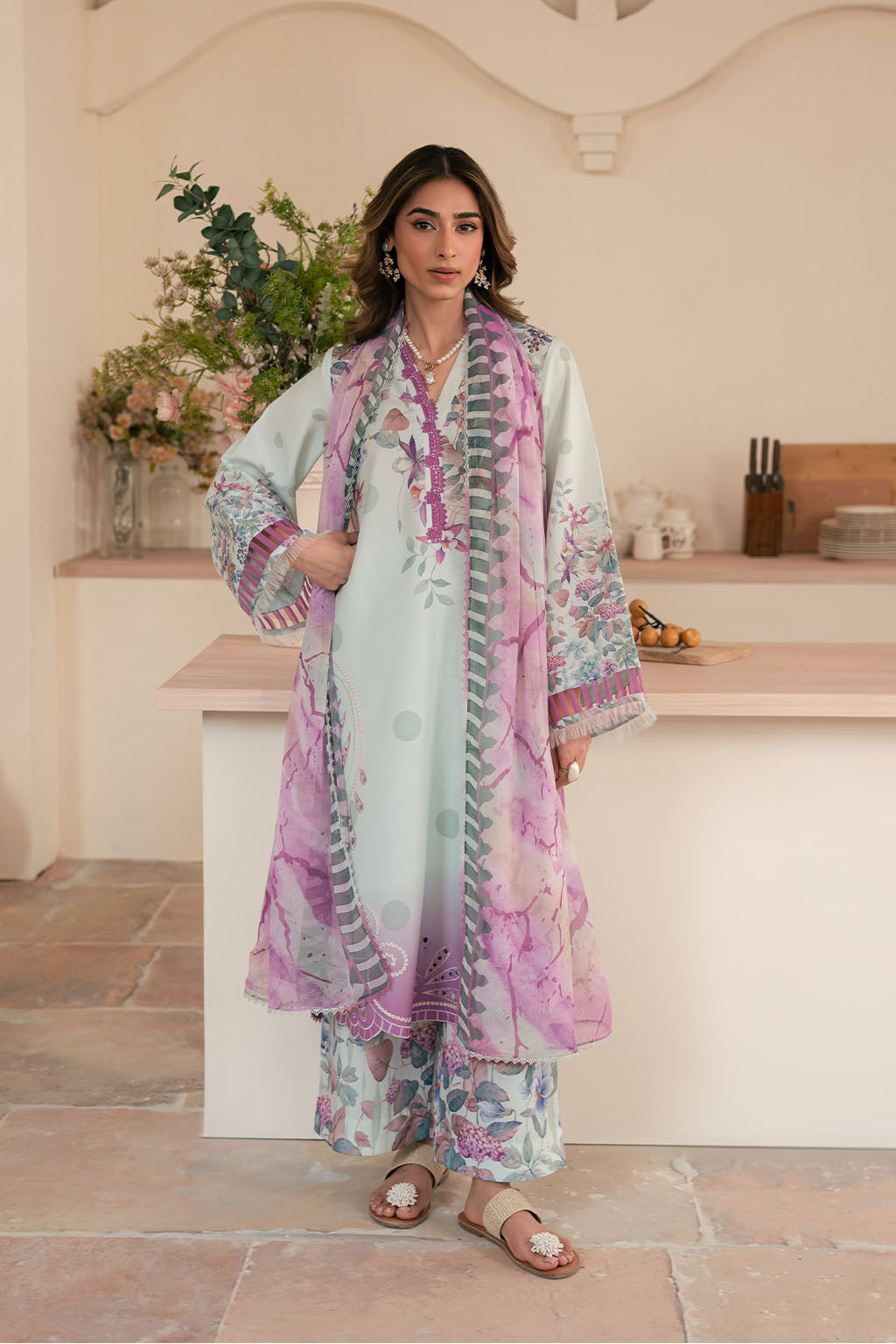Printed lawn silk embroidered shirt, paired with printed lawn silk trouser & chiffon dupatta