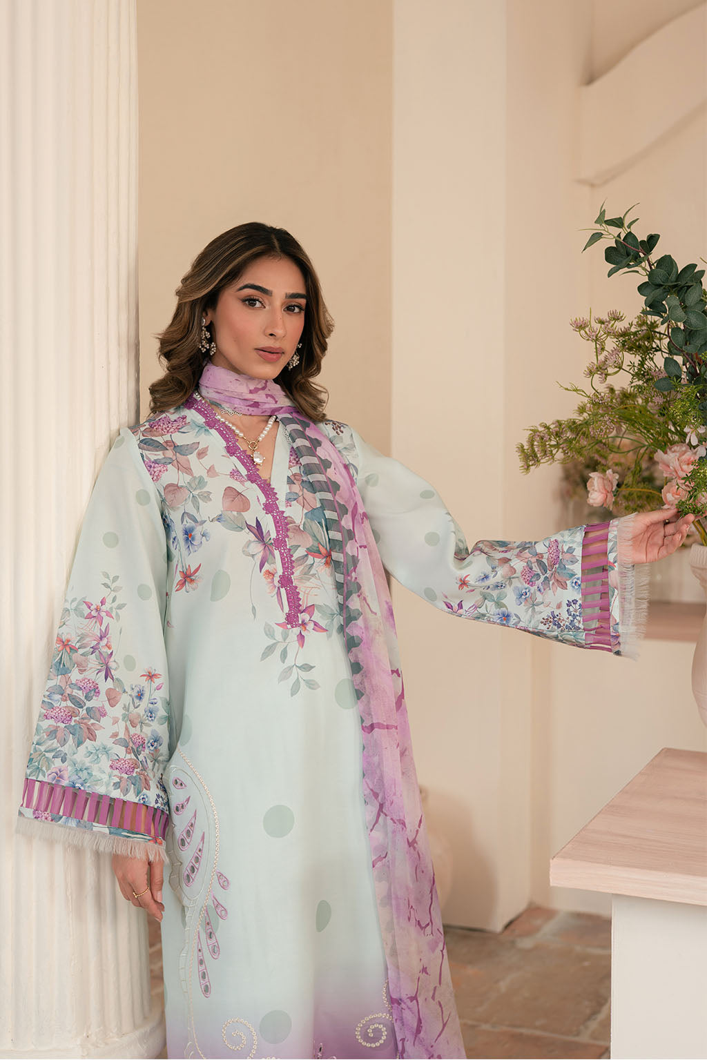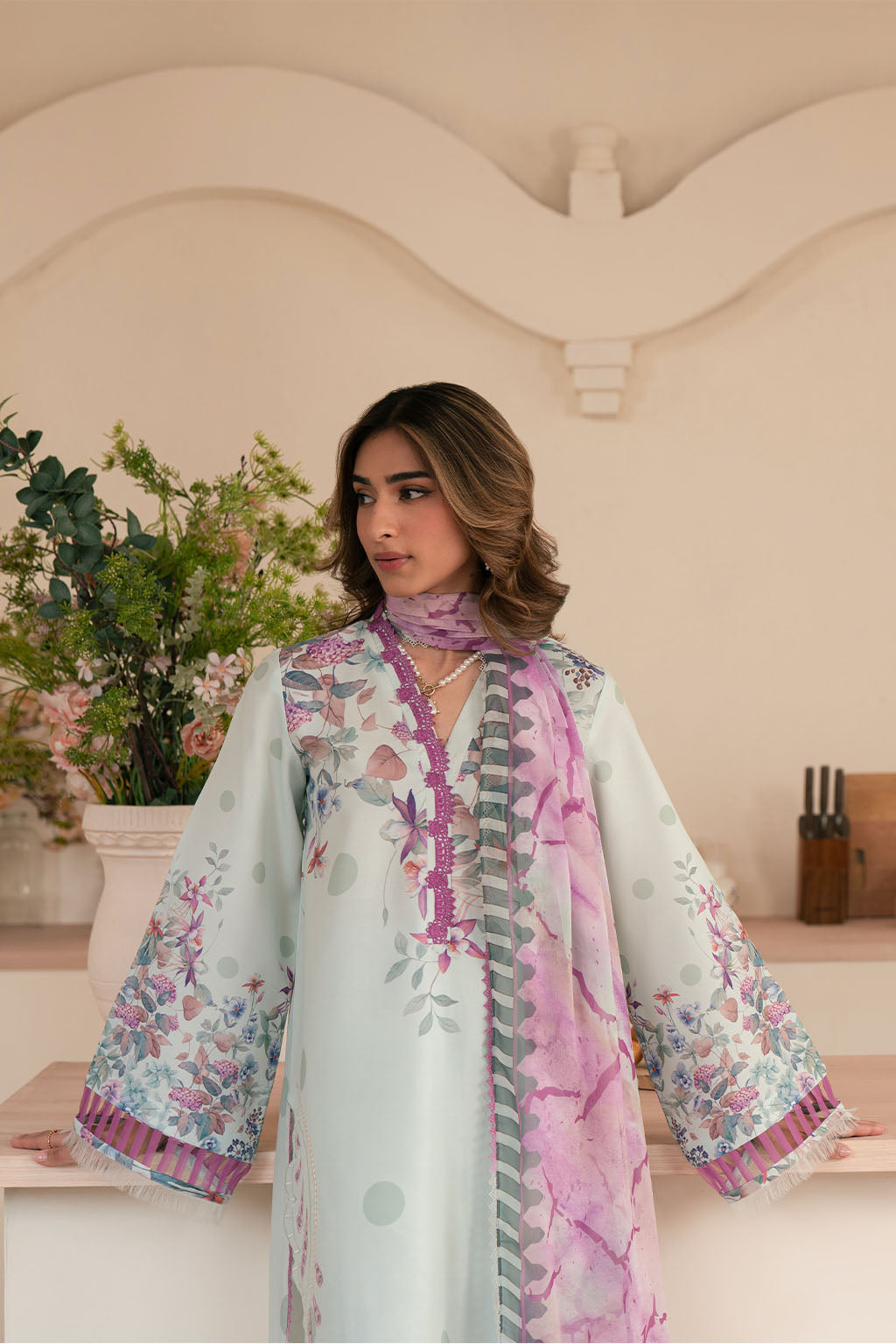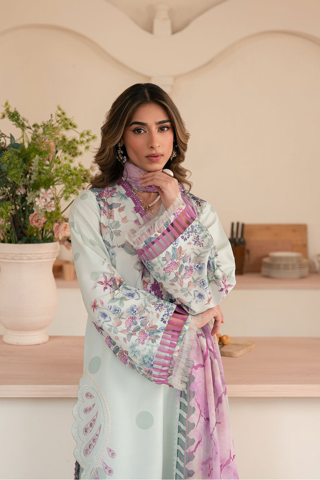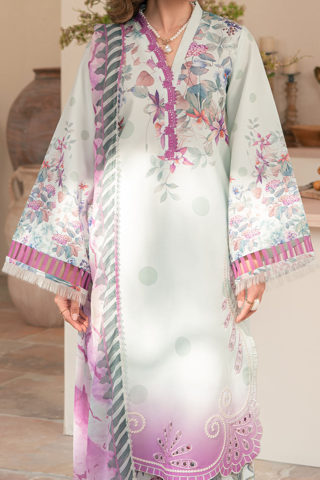 Printed lawn silk embroidered shirt, paired with printed lawn silk trouser & chiffon dupatta