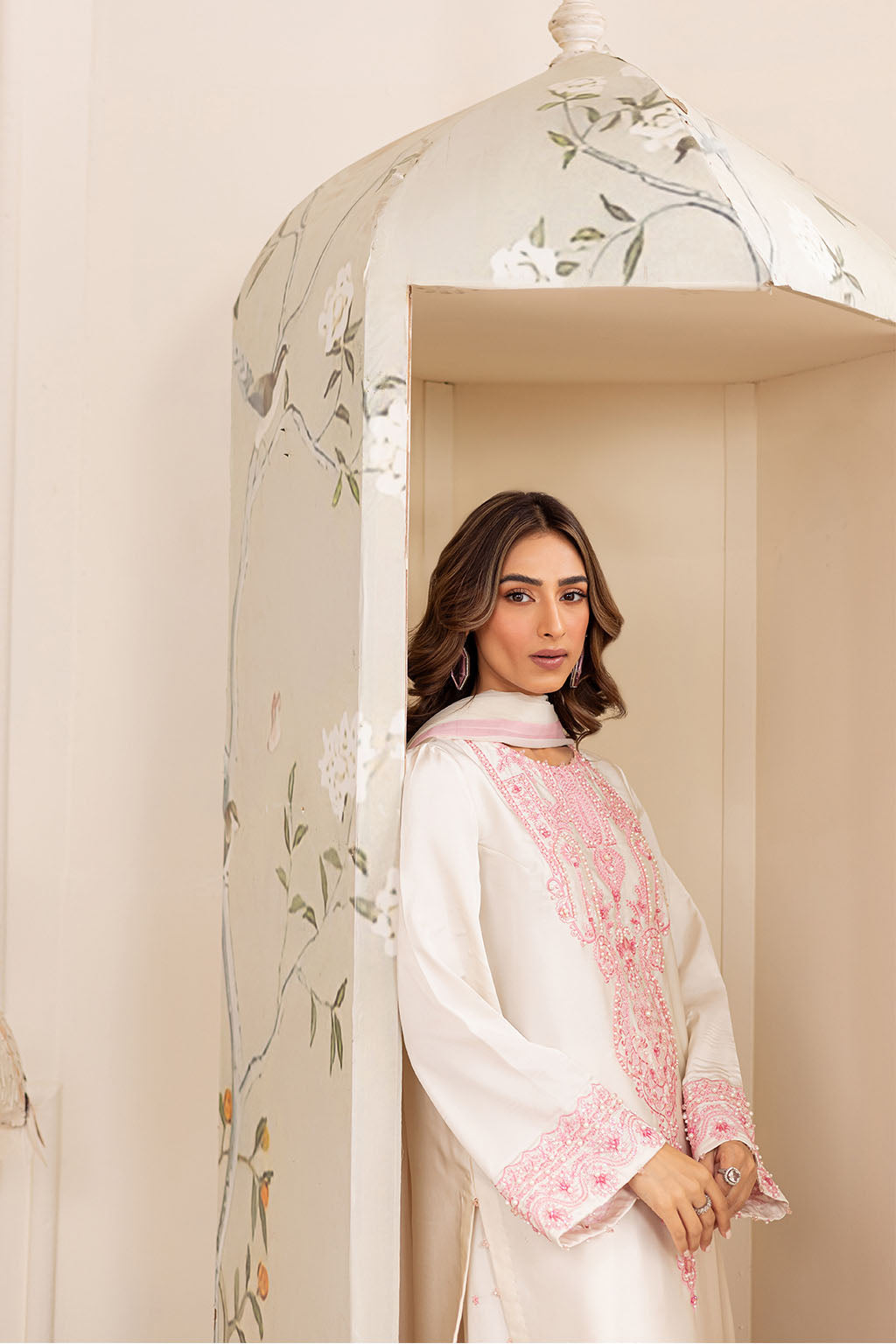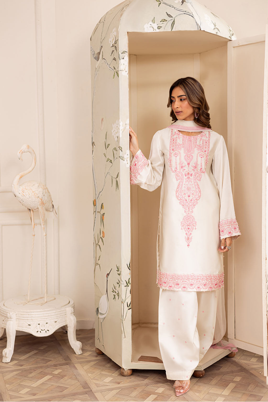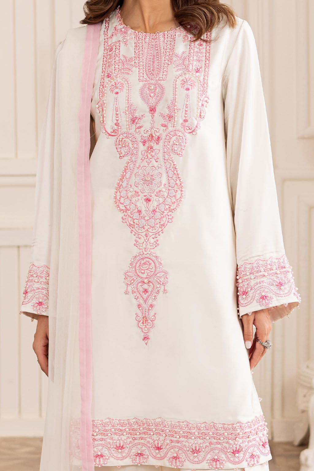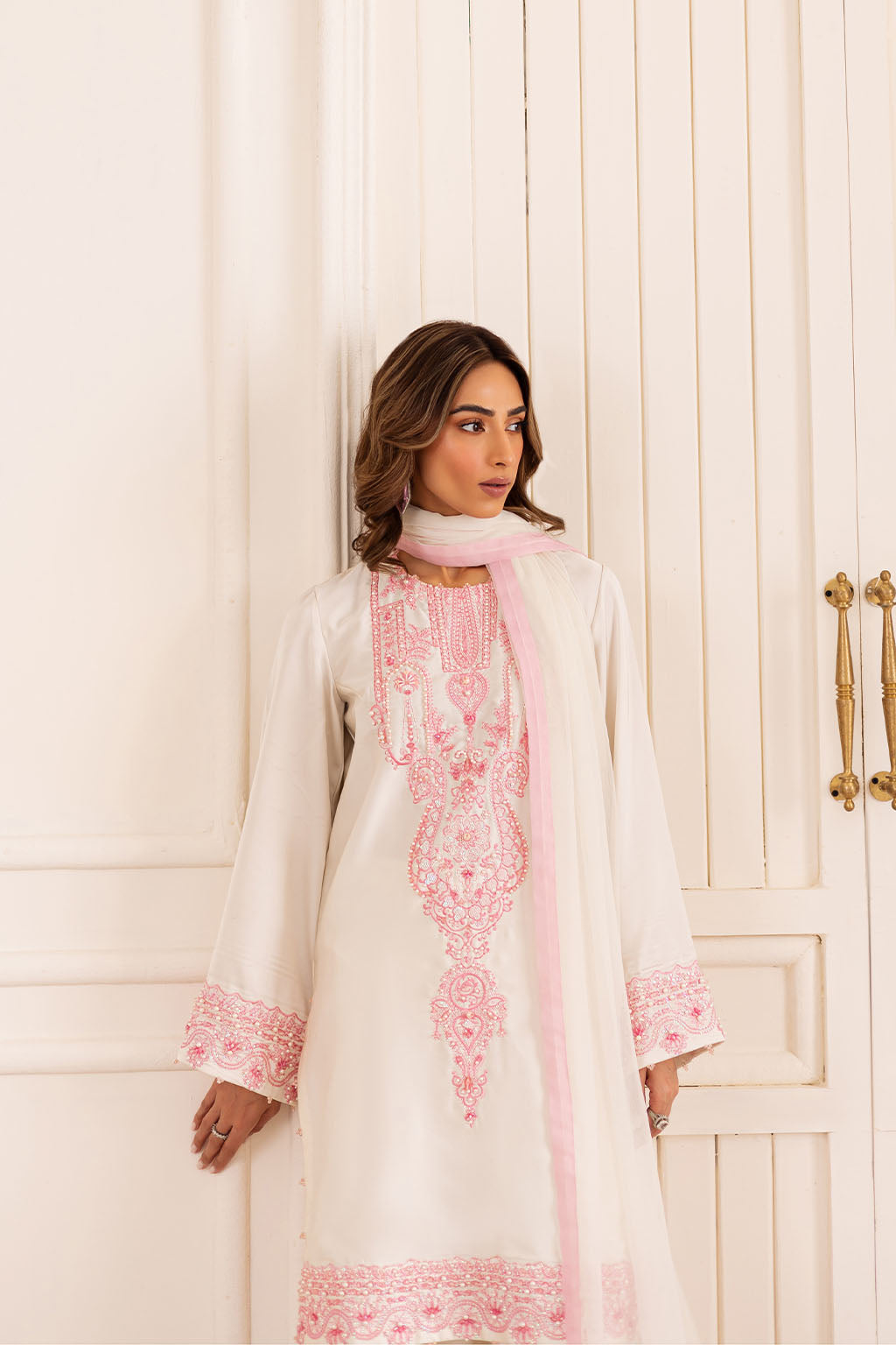 An off-white charmeuse embroidered and hand embellished shirt, paired with embroidered shalwar and chiffon dupatta