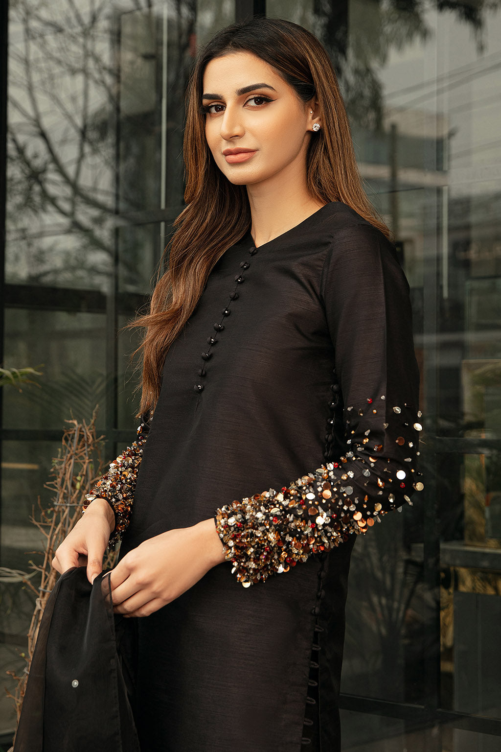 - An Exquisite Black Straight Shirt With Buttoned Detailed On The Front & Heavily Embellished Sleeves Paired With short Length Trouser & Organza Dupatta ‚ (Adda Work & Embroidery On Shirt)
