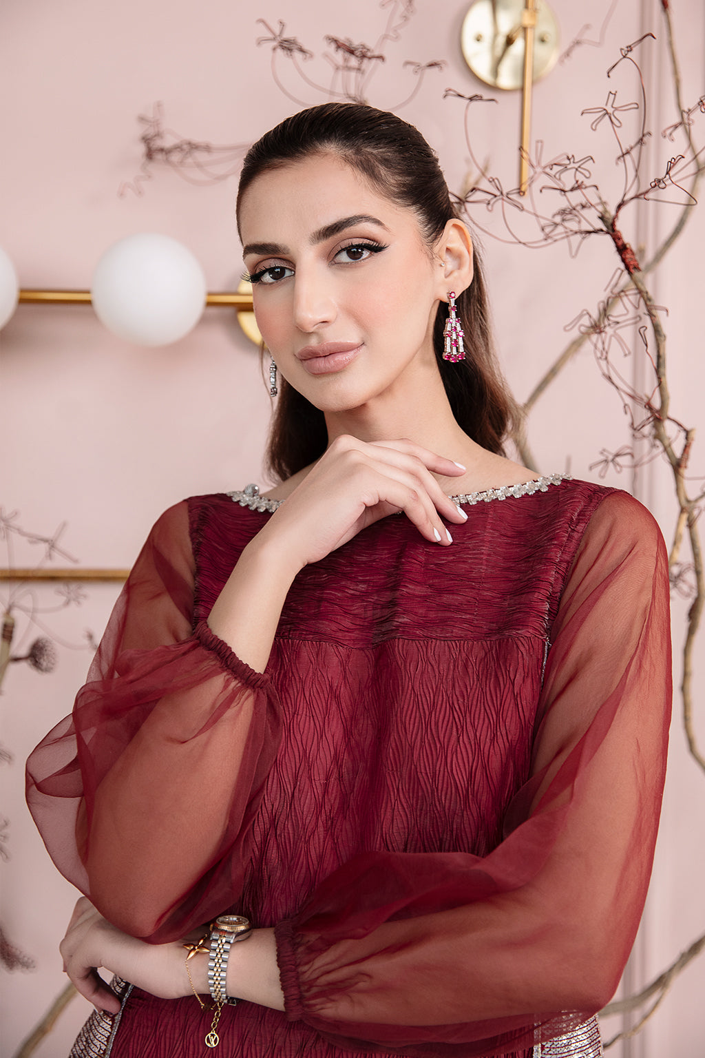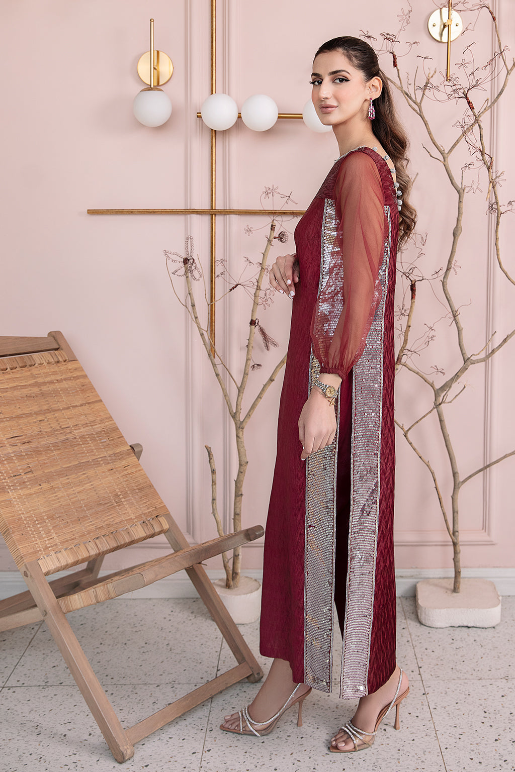 Deep maroon long shirt with hand embellished neckline, embroidered side panels, paired with cigarette pants and ruffles dupatta.