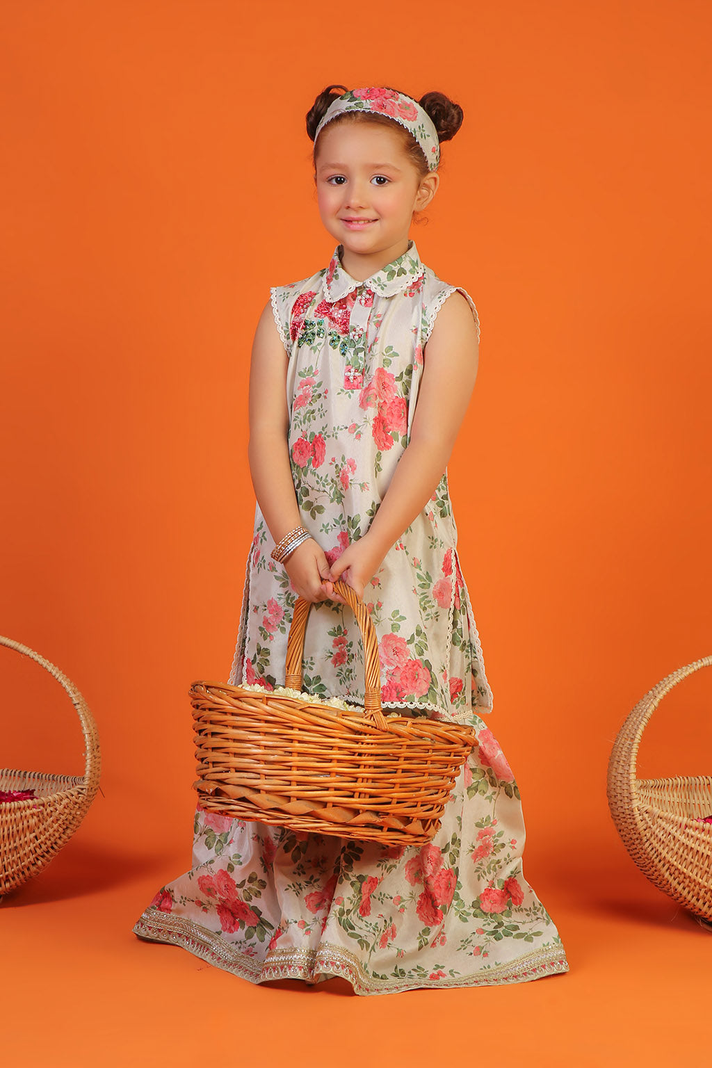 A gracefully elegant composition is layered over this classy ensemble rendered in floral print
