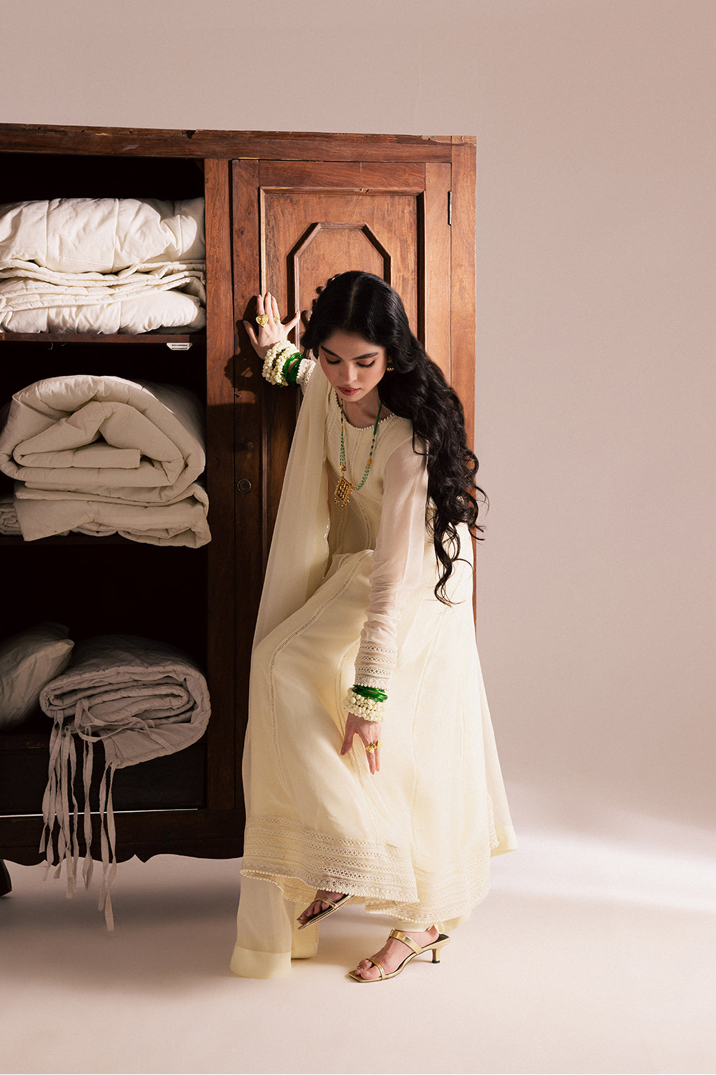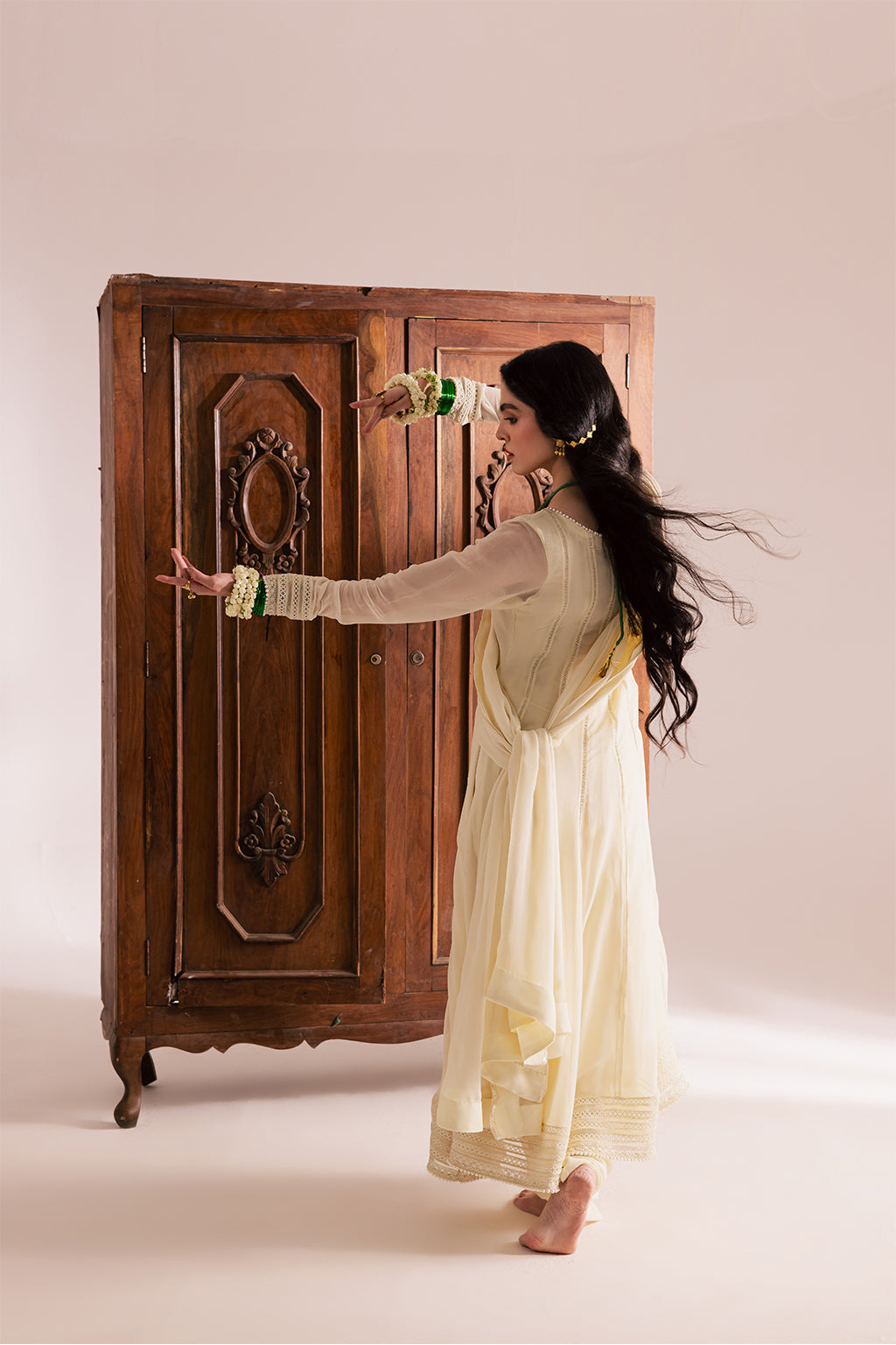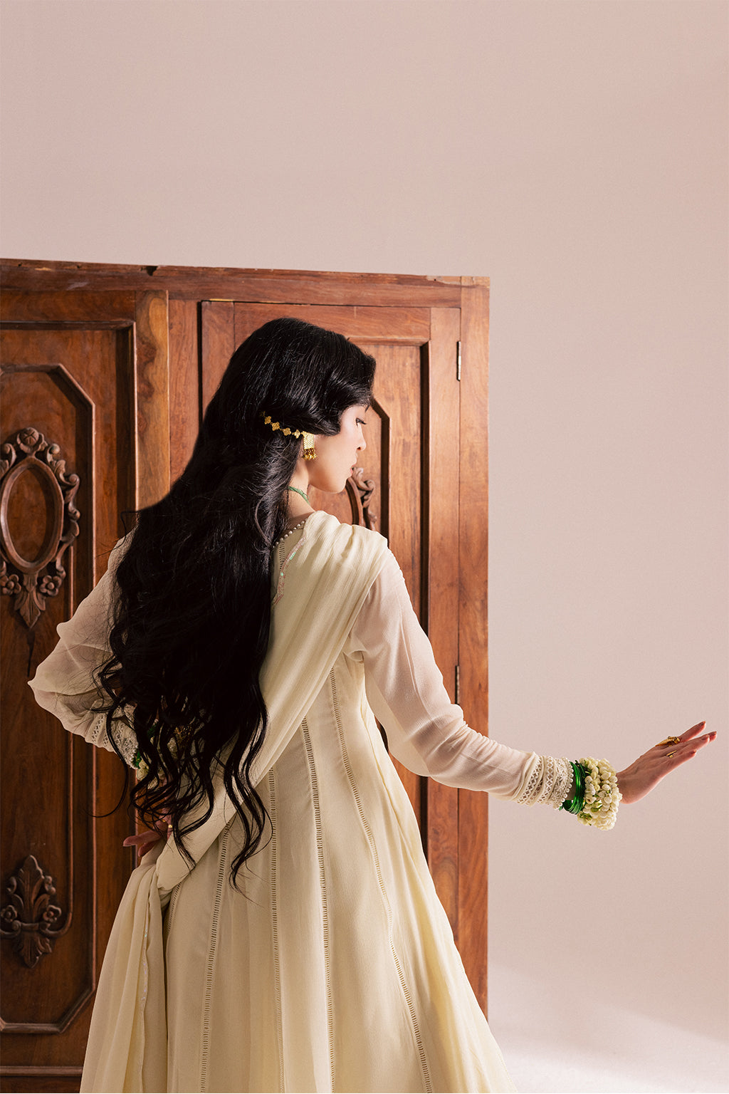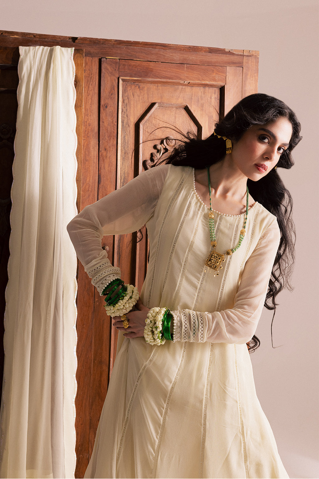 Plain white chiffon Anarkali adorned with lace and pearl detailing, paired with embroidered chiffon dupatta and raw silk churidar