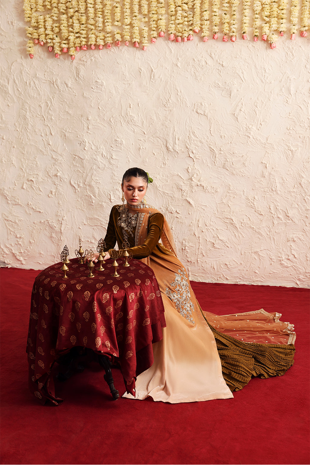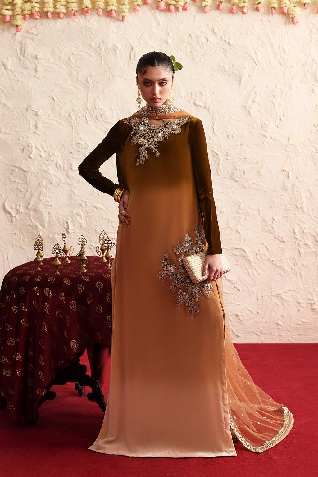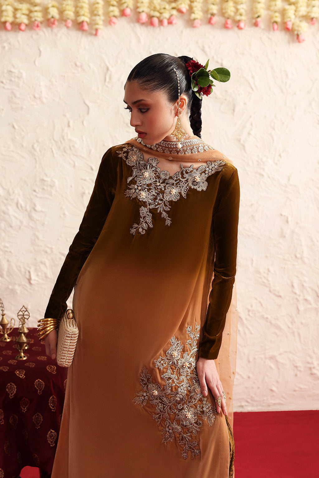 A gracefully crafted ombré in velvet, transitioning seamlessly in rich tones, adorned with meticulously detailed embroidered motifs that elevate the entire look with sophistication. The ensemble is complemented by a delicately embroidered net dupatta and perfectly coordinated trousers, creating a timeless and refined statement suitable for any festive or formal occasion.