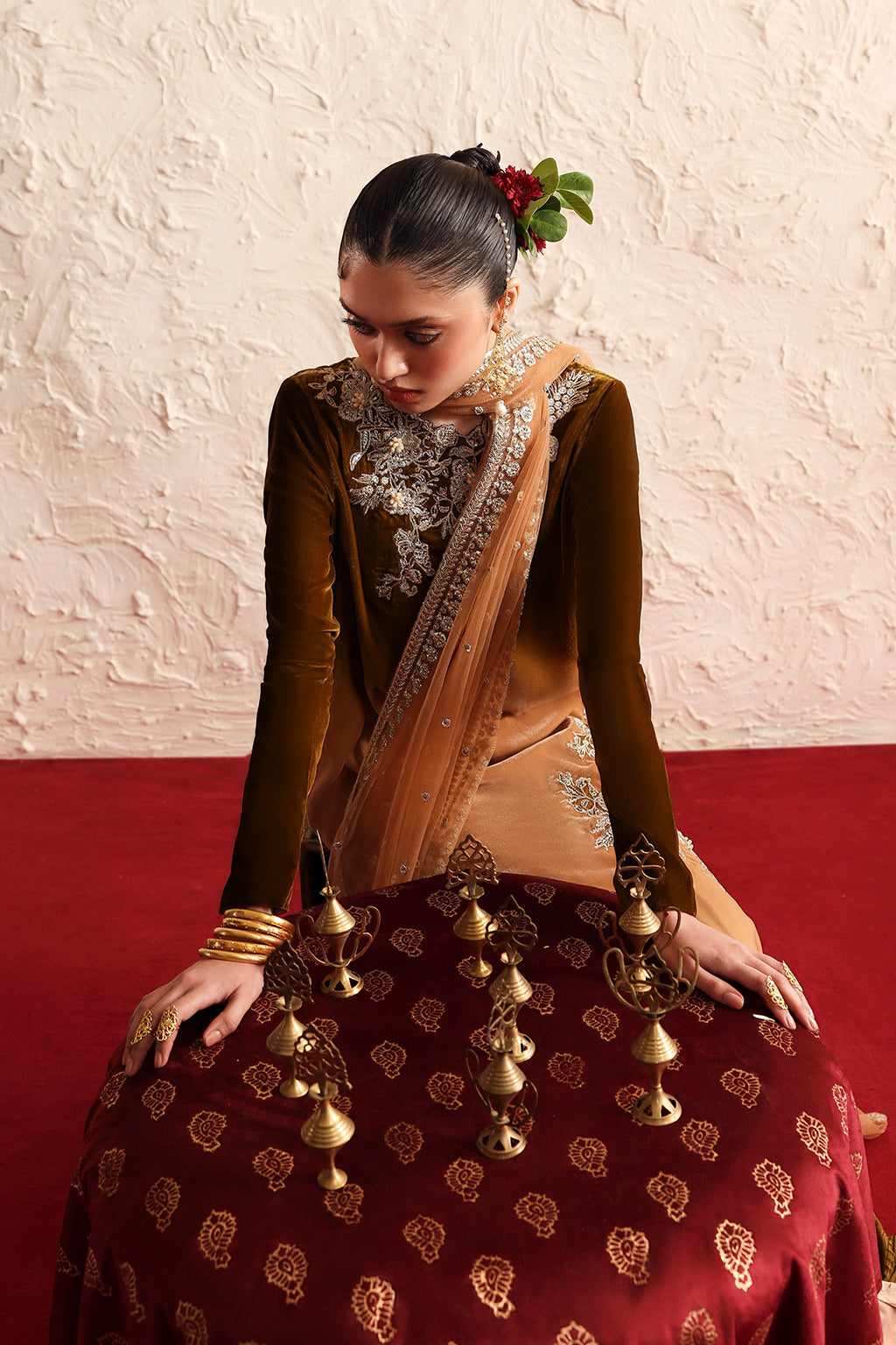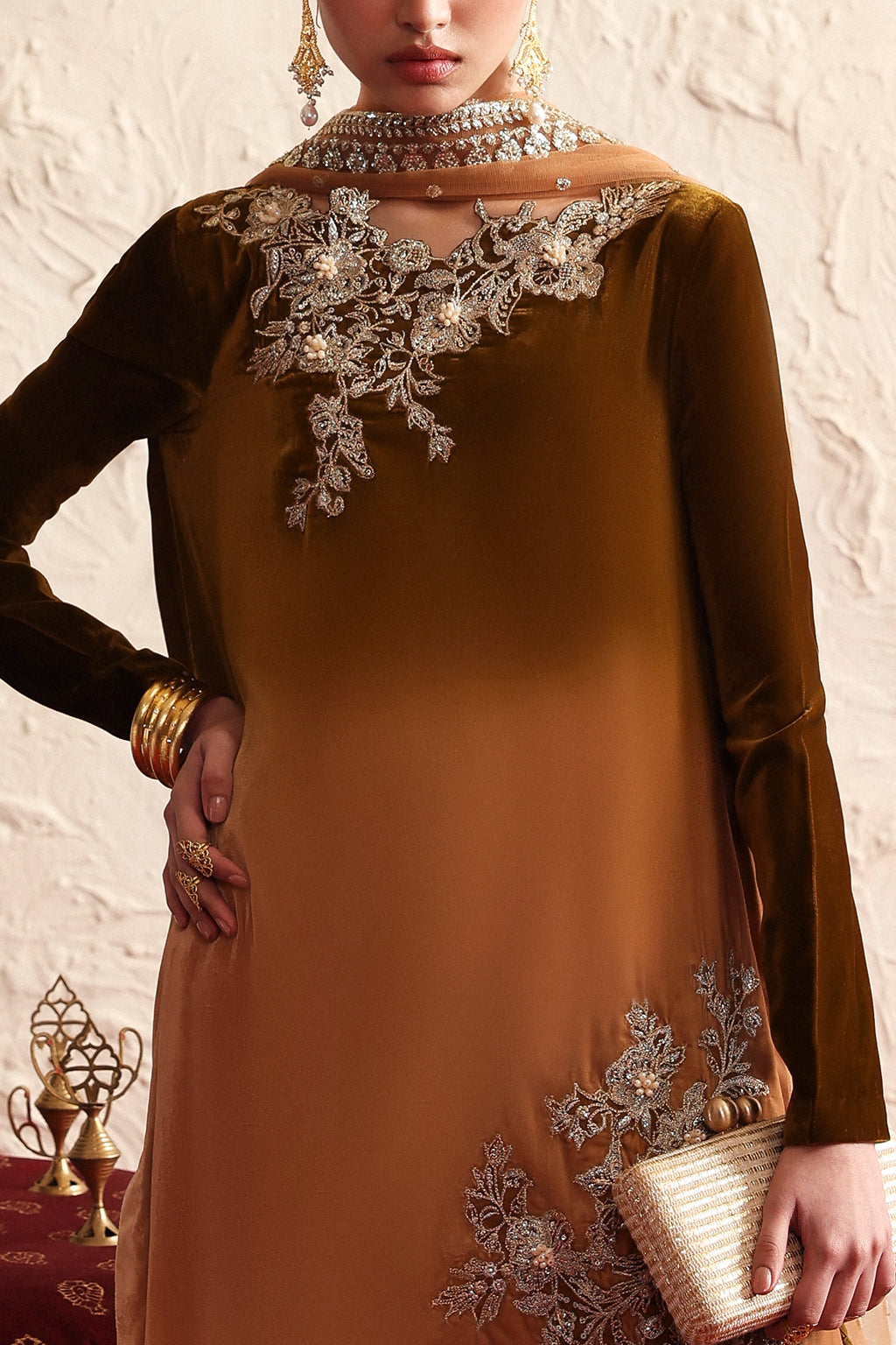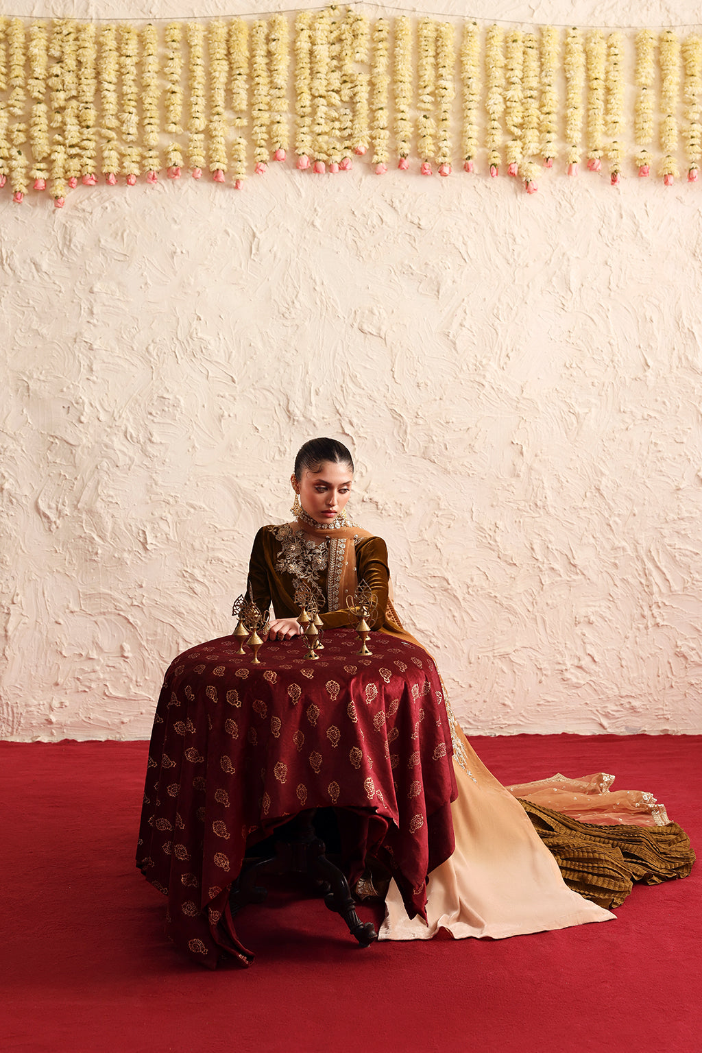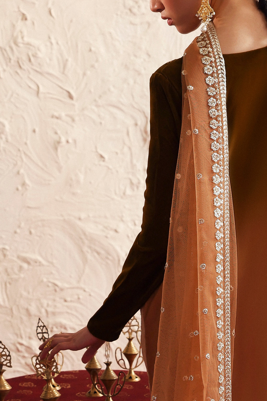 A gracefully crafted ombré in velvet, transitioning seamlessly in rich tones, adorned with meticulously detailed embroidered motifs that elevate the entire look with sophistication. The ensemble is complemented by a delicately embroidered net dupatta and perfectly coordinated trousers, creating a timeless and refined statement suitable for any festive or formal occasion.