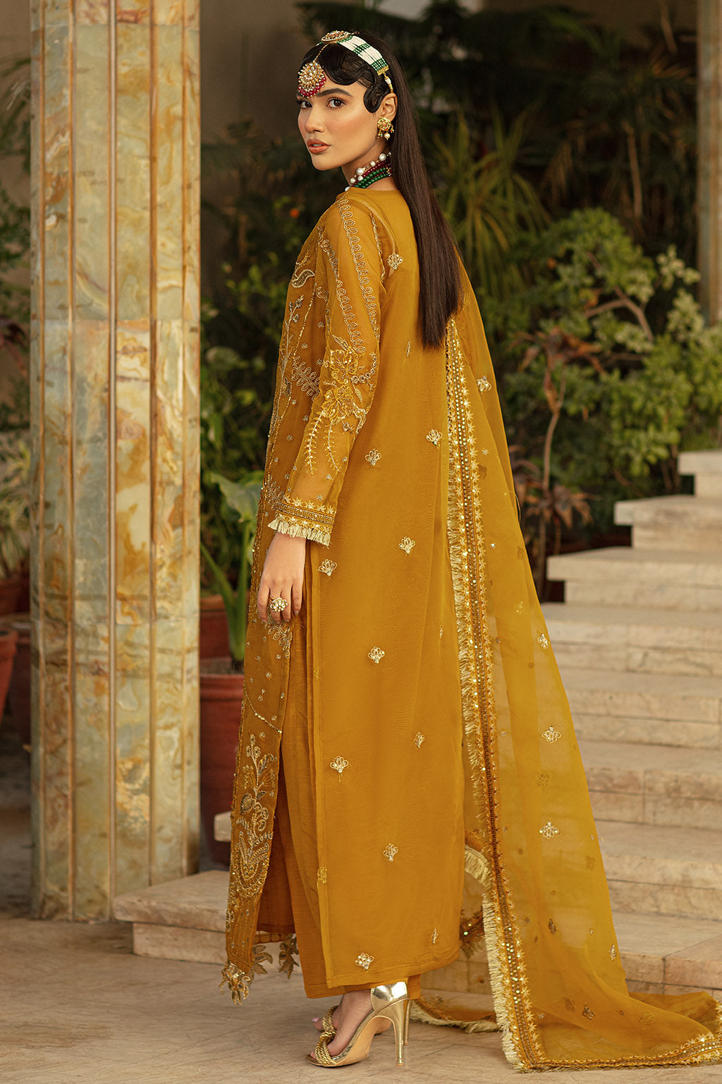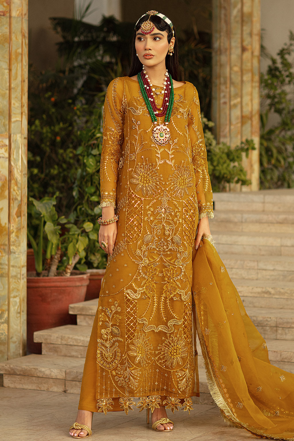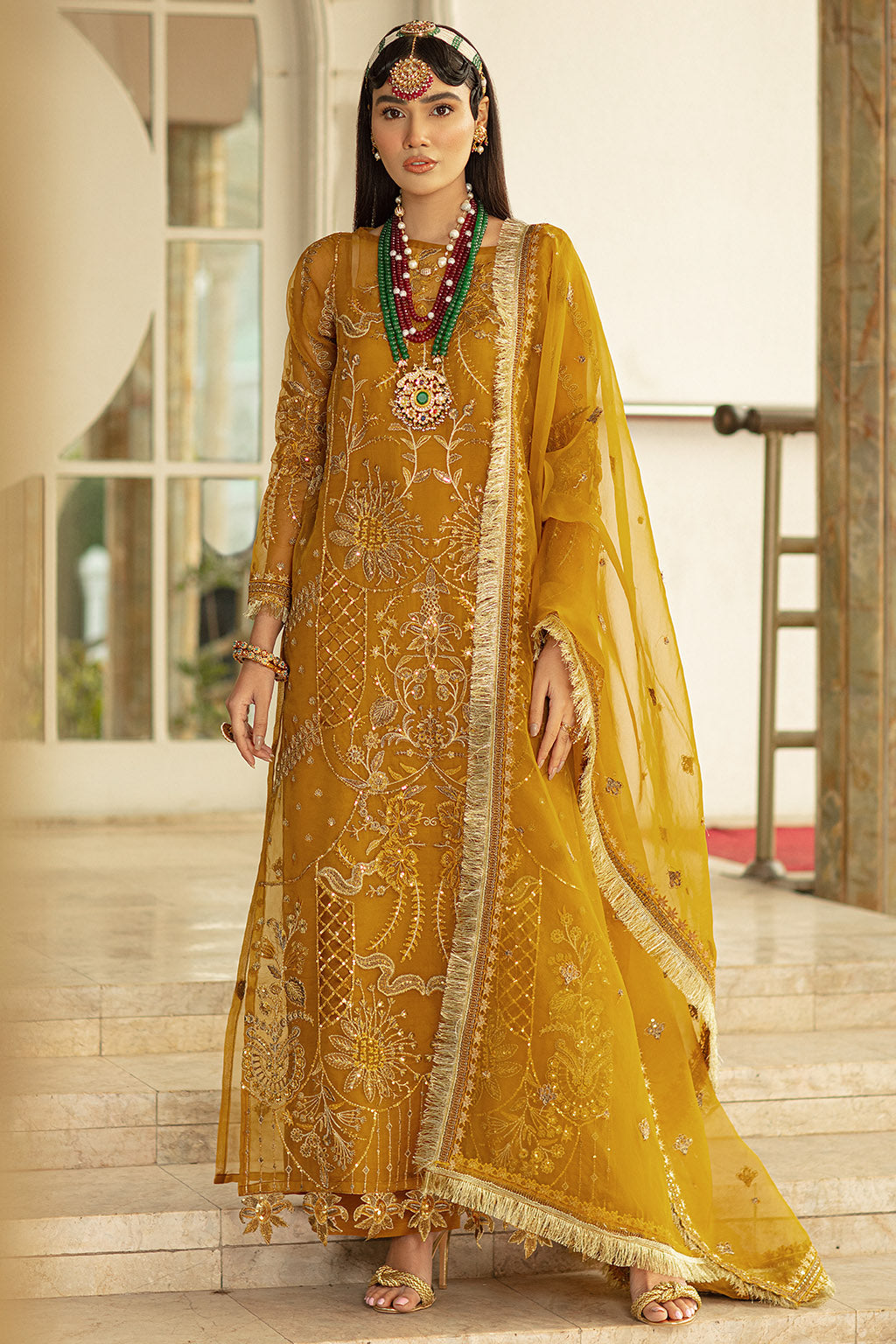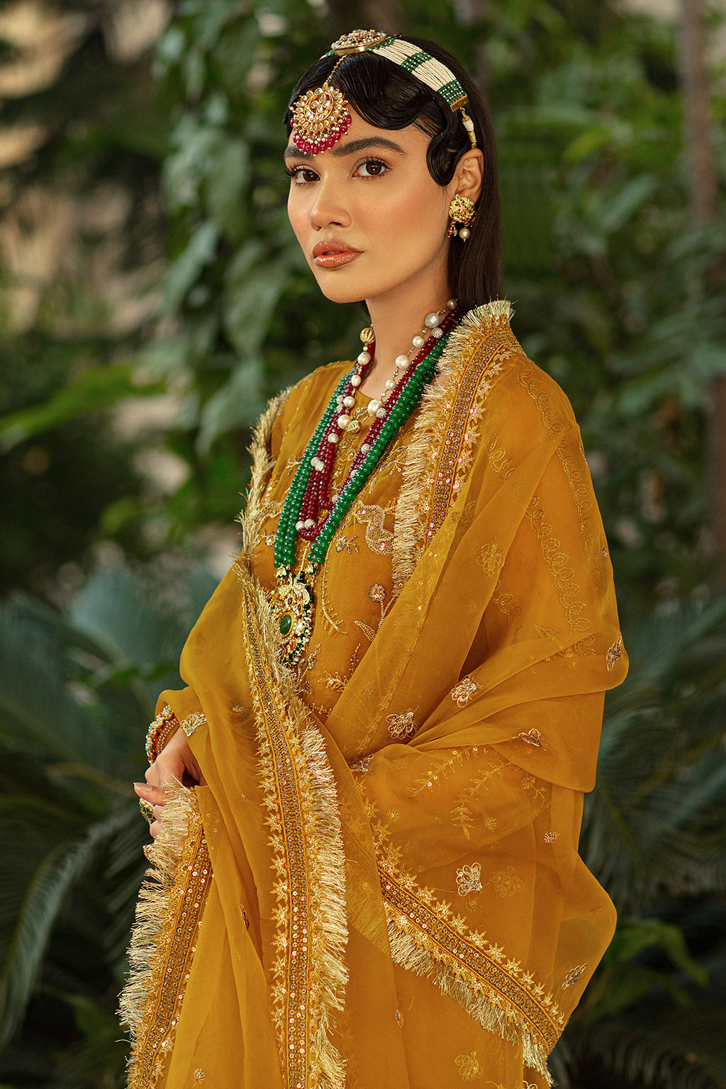 This a 4 piece beautiful yellow ensemble is adorned with stylized embellishments that shine against its base canvas. The pure organza top features enchanting cut work detailing mingle with raw silk pants and organza dupatta that elevates the entire look.