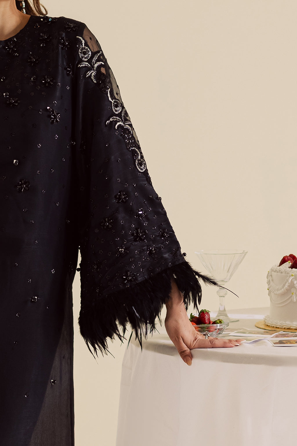A shimmery silk shirt adorned with intricate embroidery and hand embellishments, featuring soft fur detailing on the sleeves