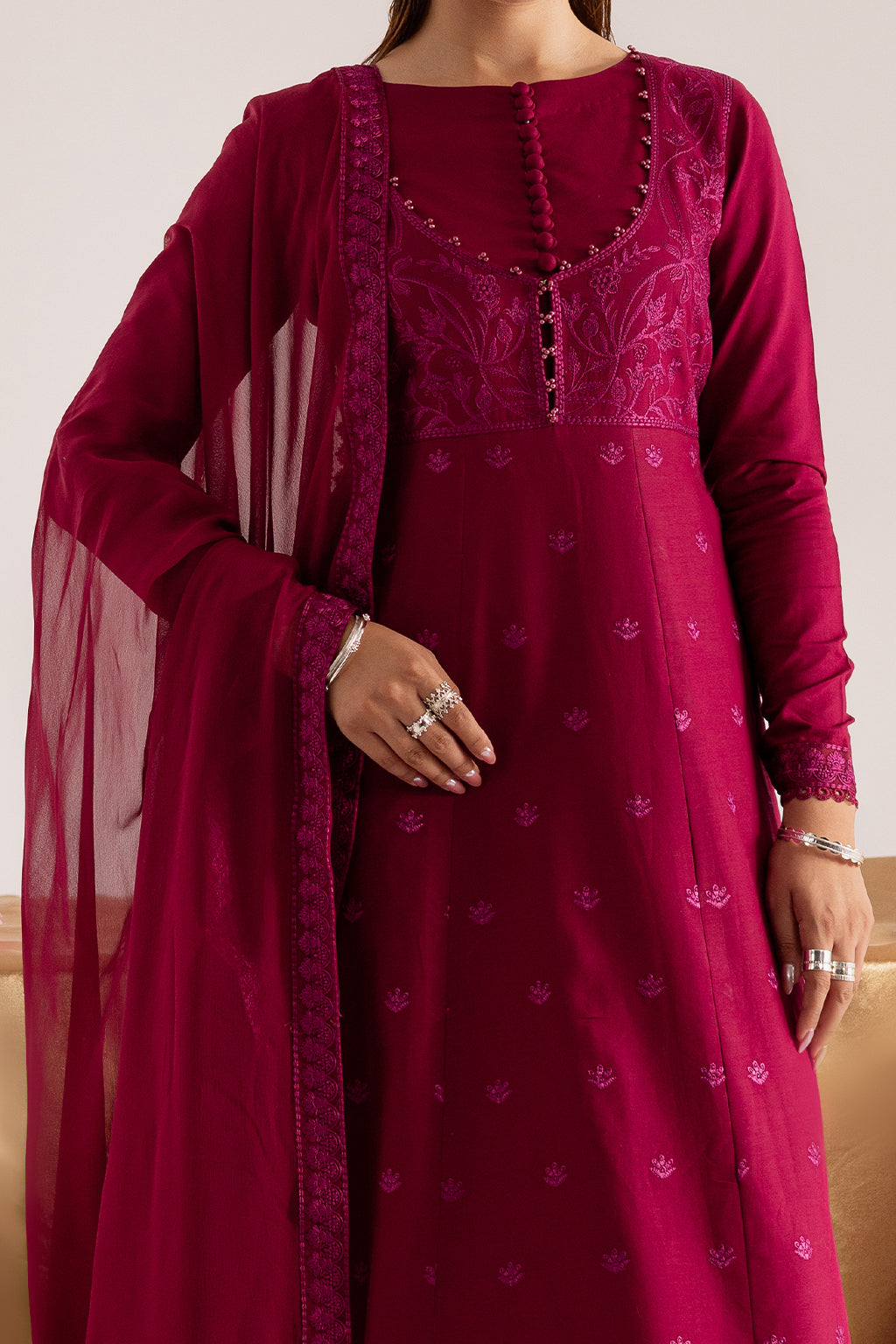 Dark hot pink embroidered cotton shirt with button and pearl accents, paired with embroidered trousers and a chiffon dupatta with four-sided borders.