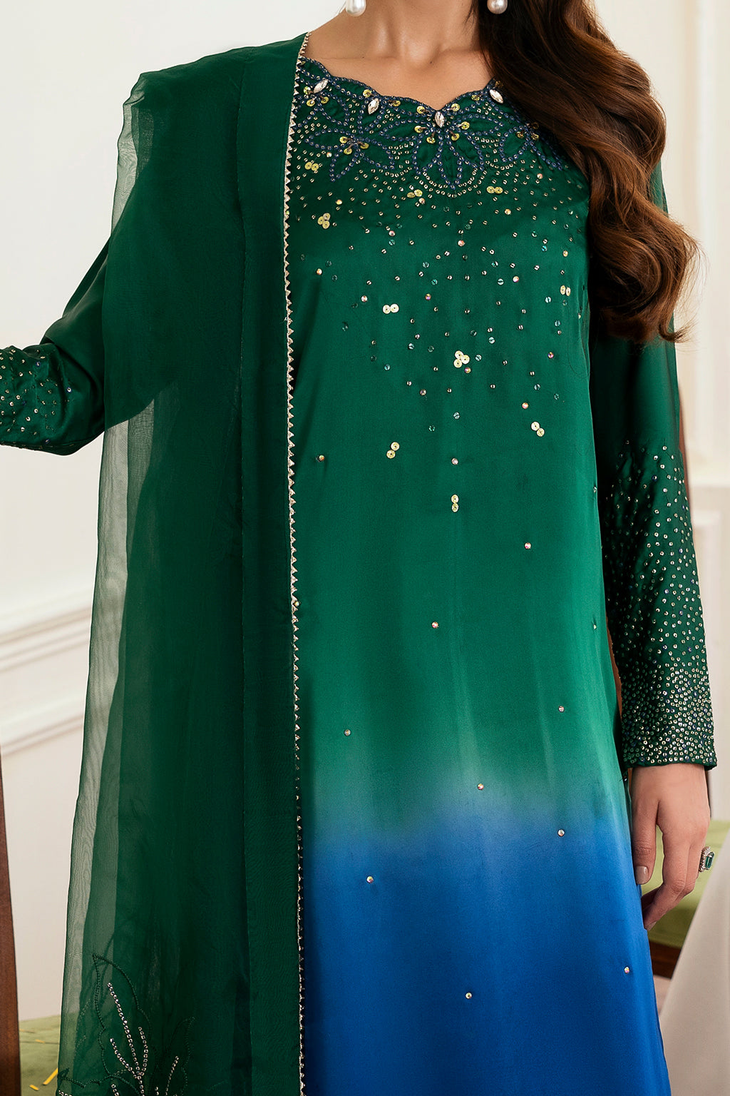 A two-tone Embroidered and hand embellished silk long shirt, paired with silk and organza layering flared trouser and embroidered organza dupatta