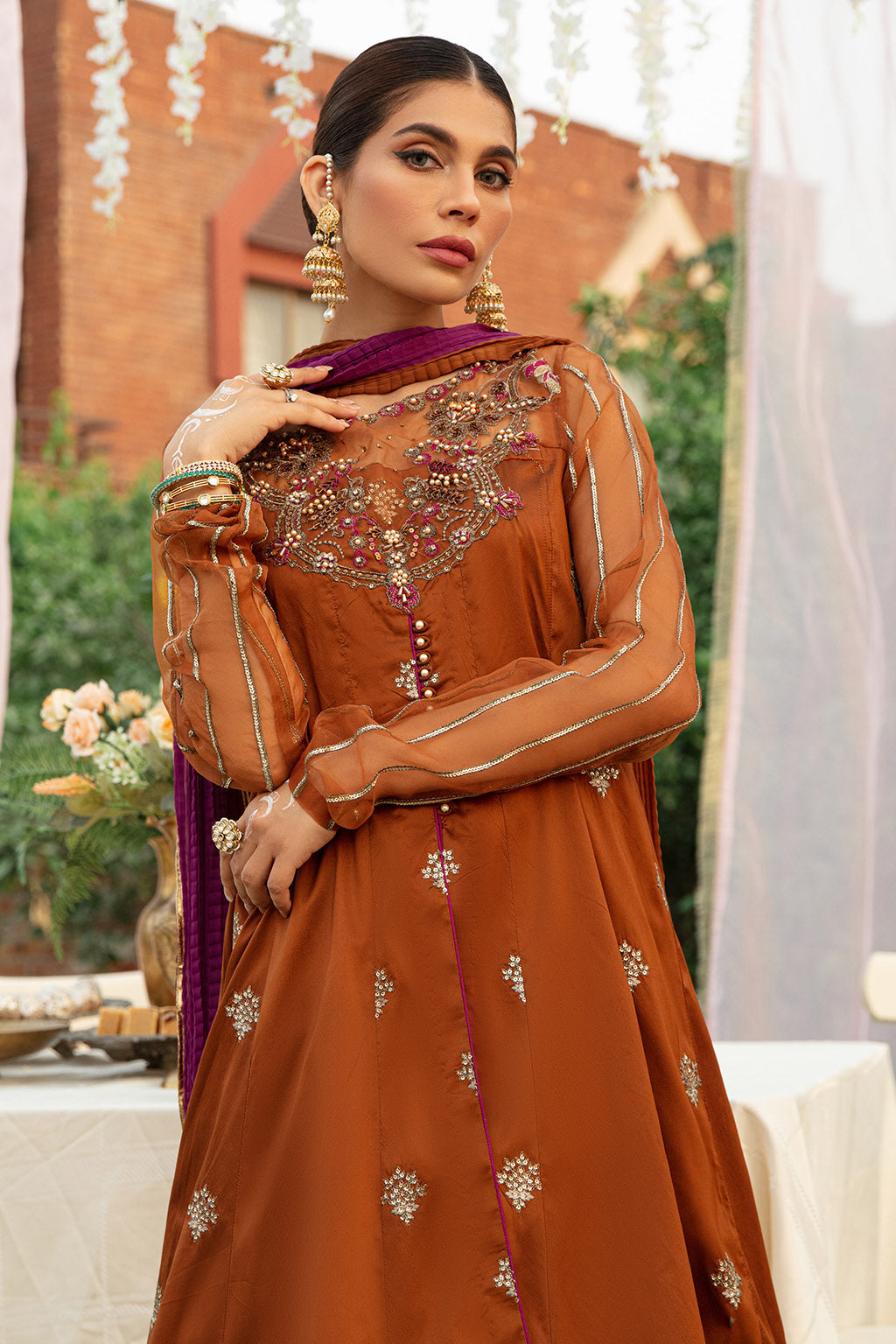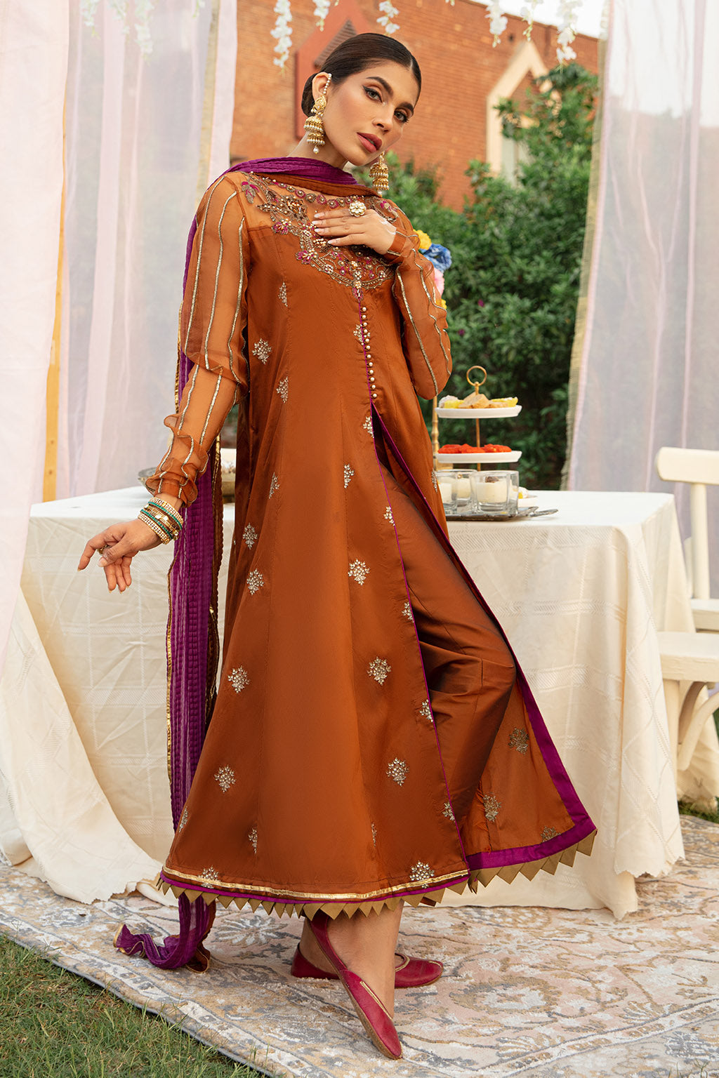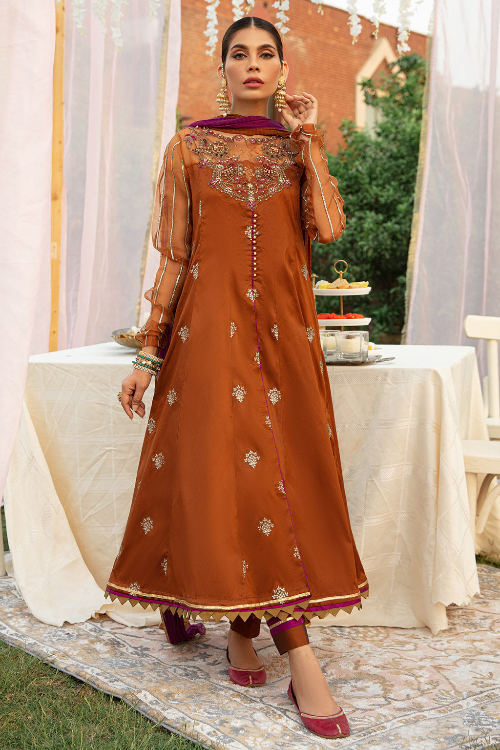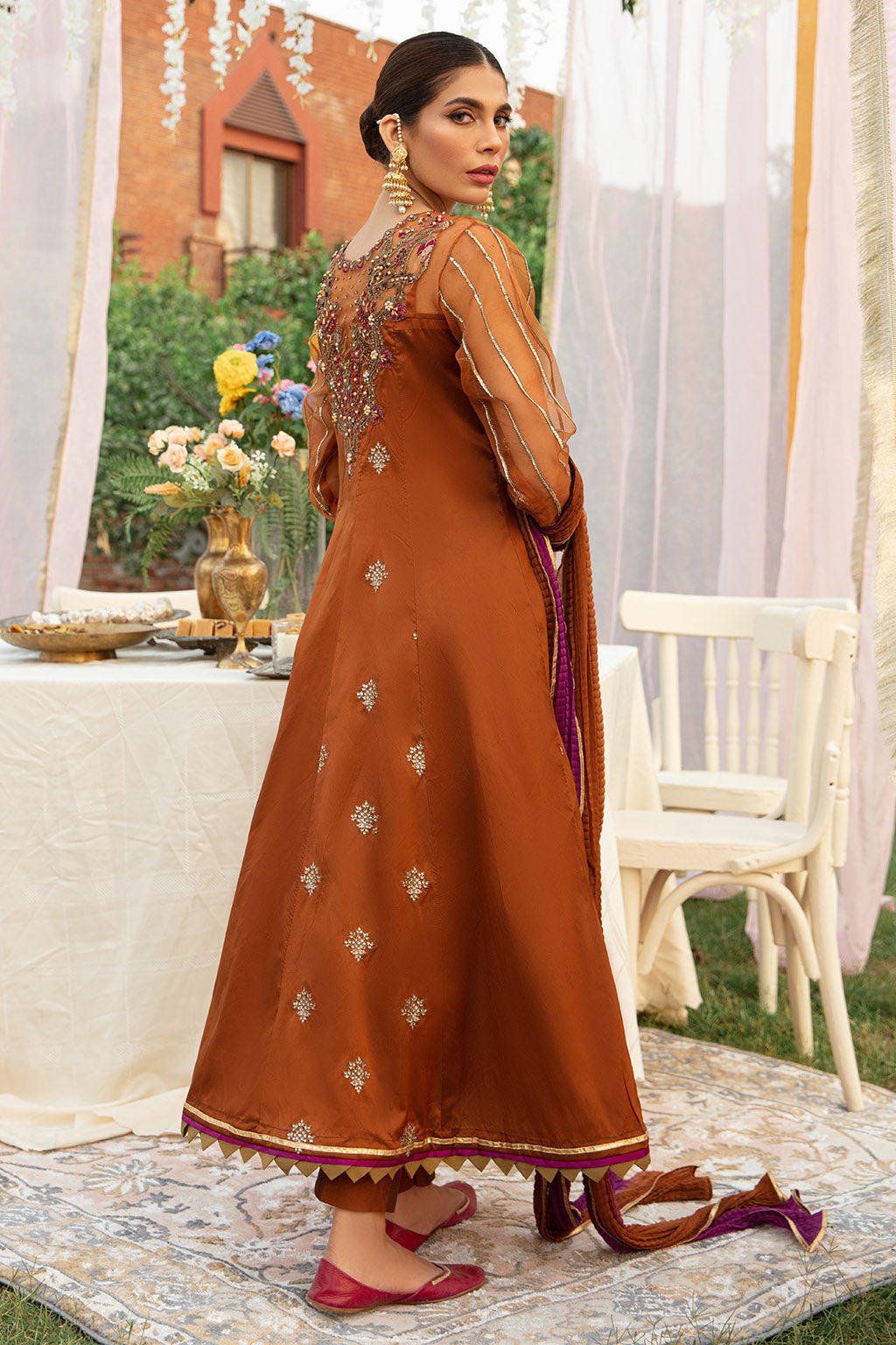 A ready to wear 3 piece kalidaar frock with incricate embroidery details paired with crushed dupatta and straight pants.