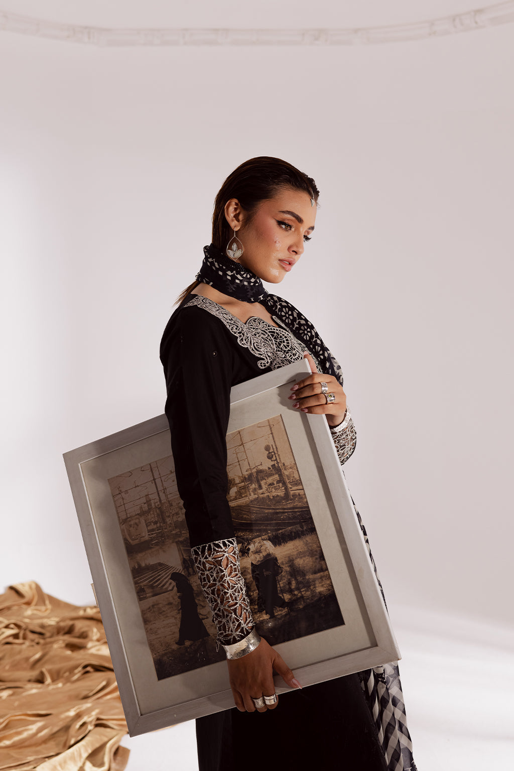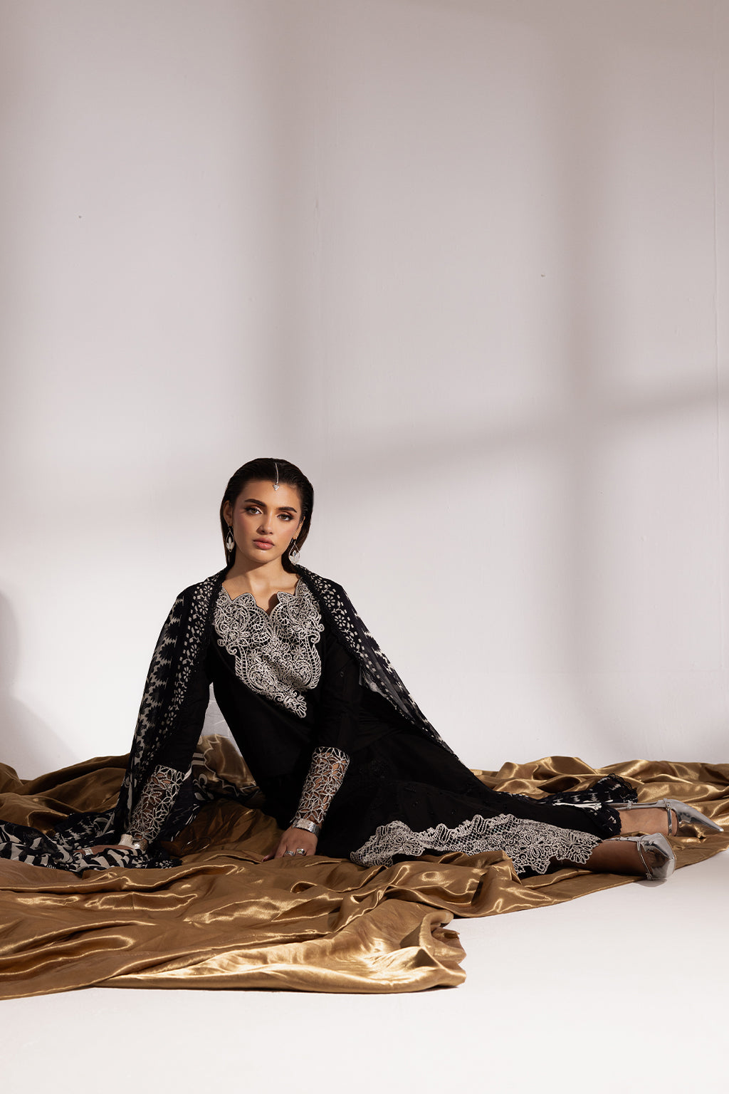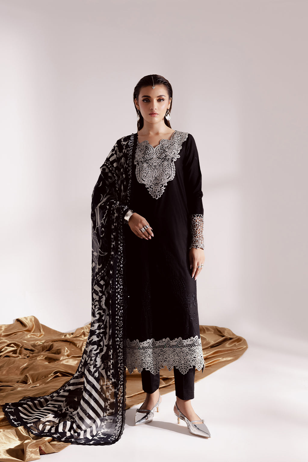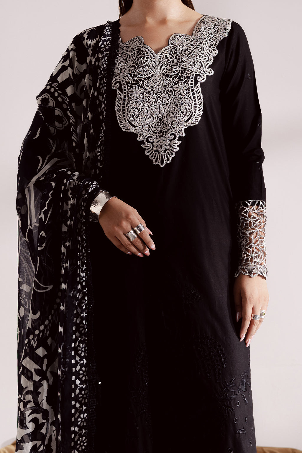 A chic black embroidered outfit featuring intricate thread work on necklines, sleeves and hem, paired with straight pants, a patterned dupatta