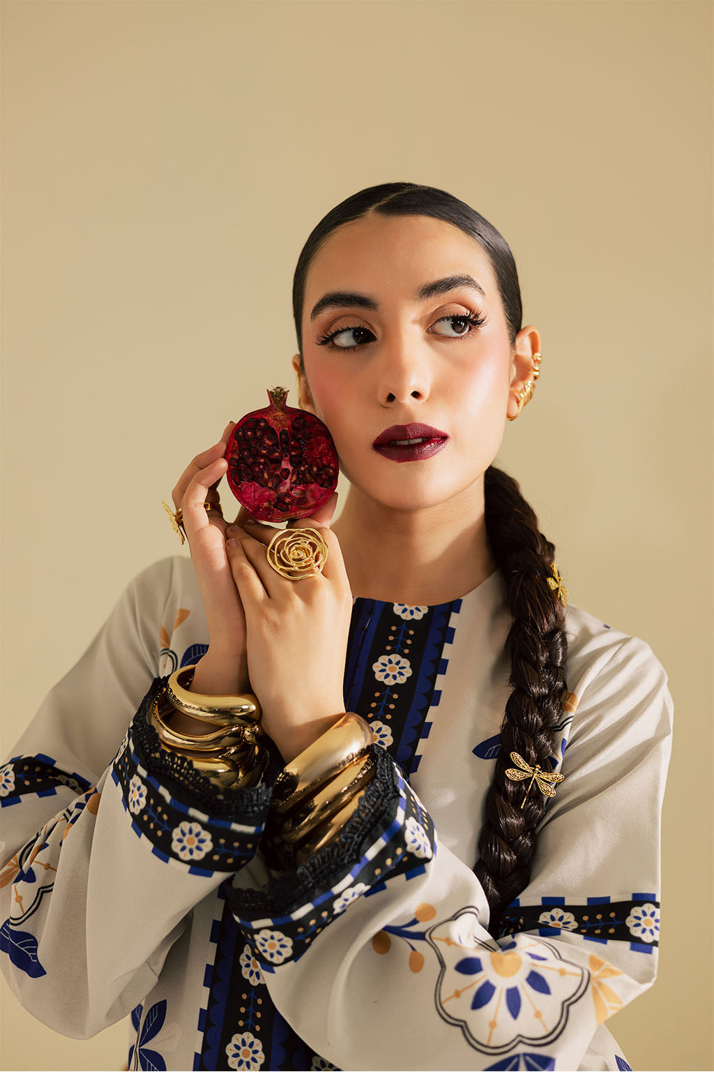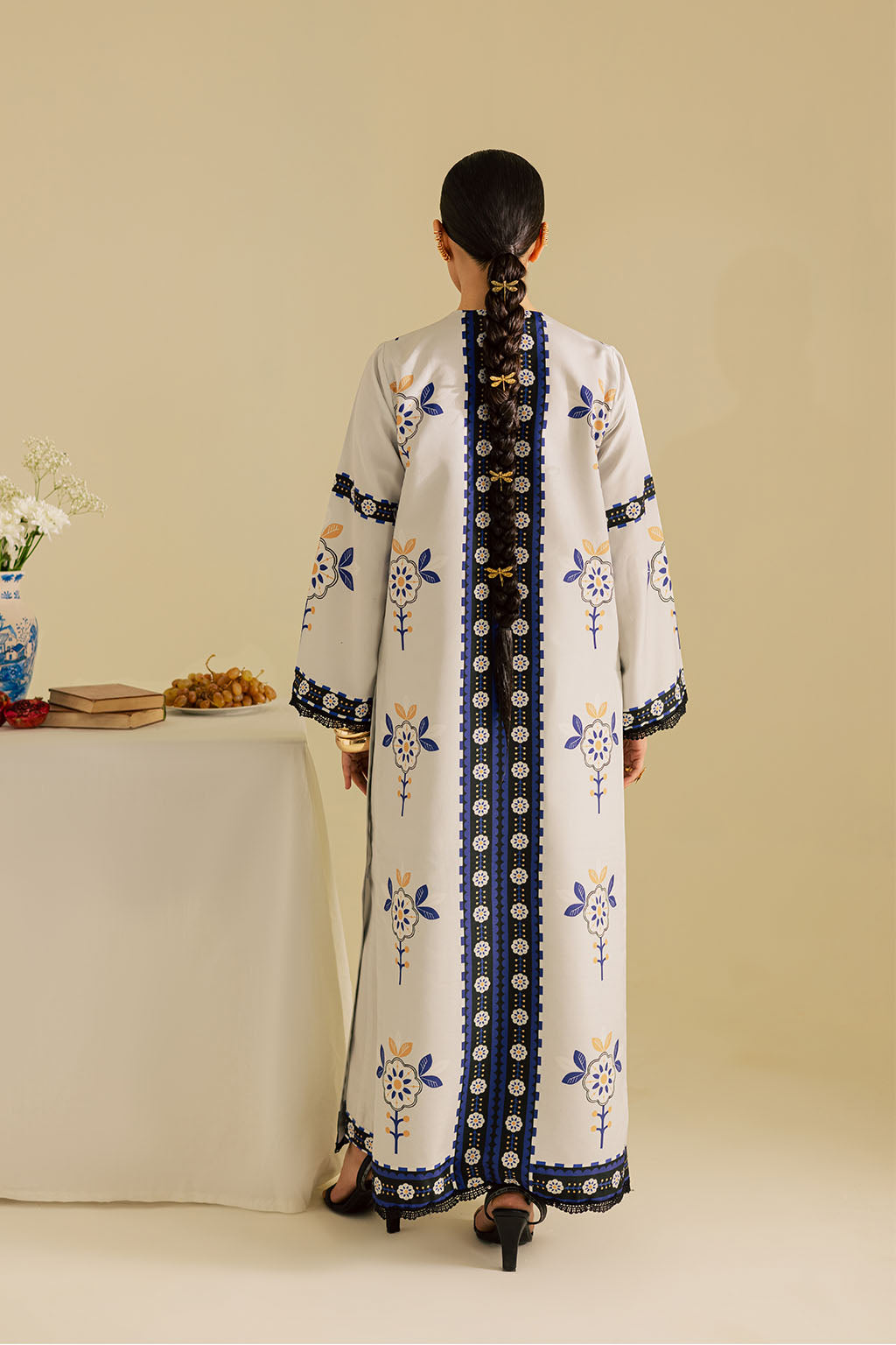 Printed long shirt with lace detailing on daman and sleeves, paired with straight pants