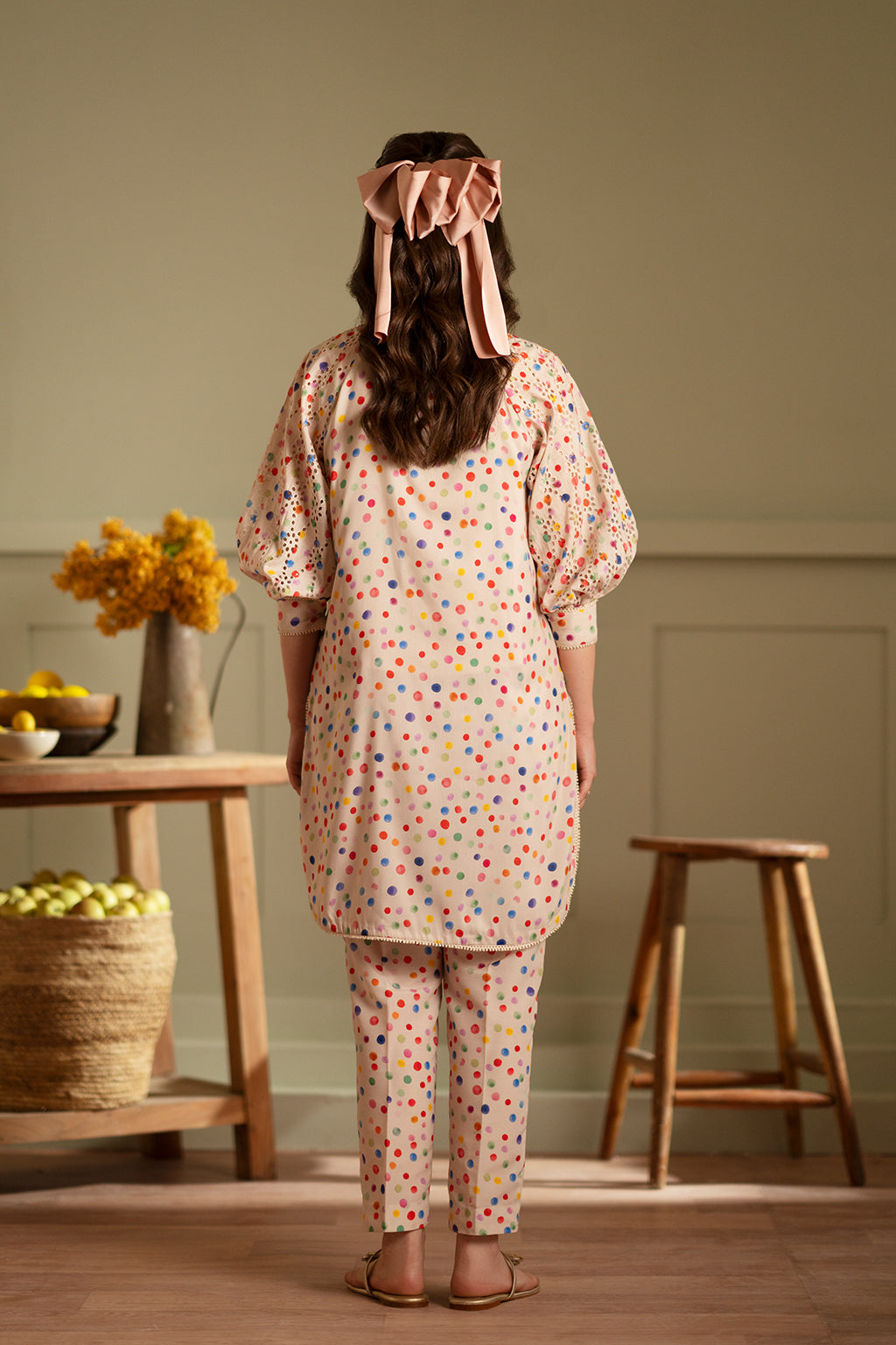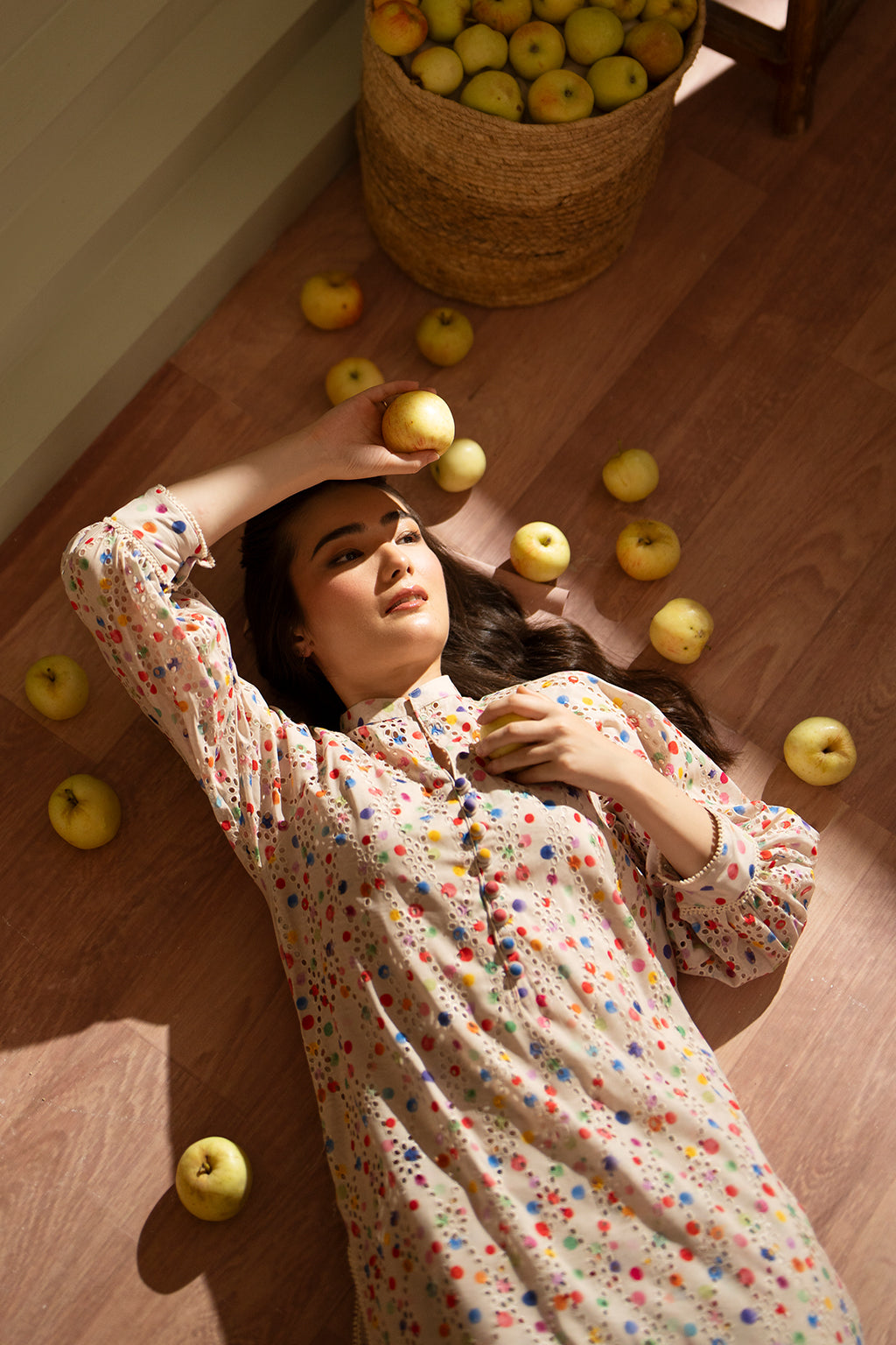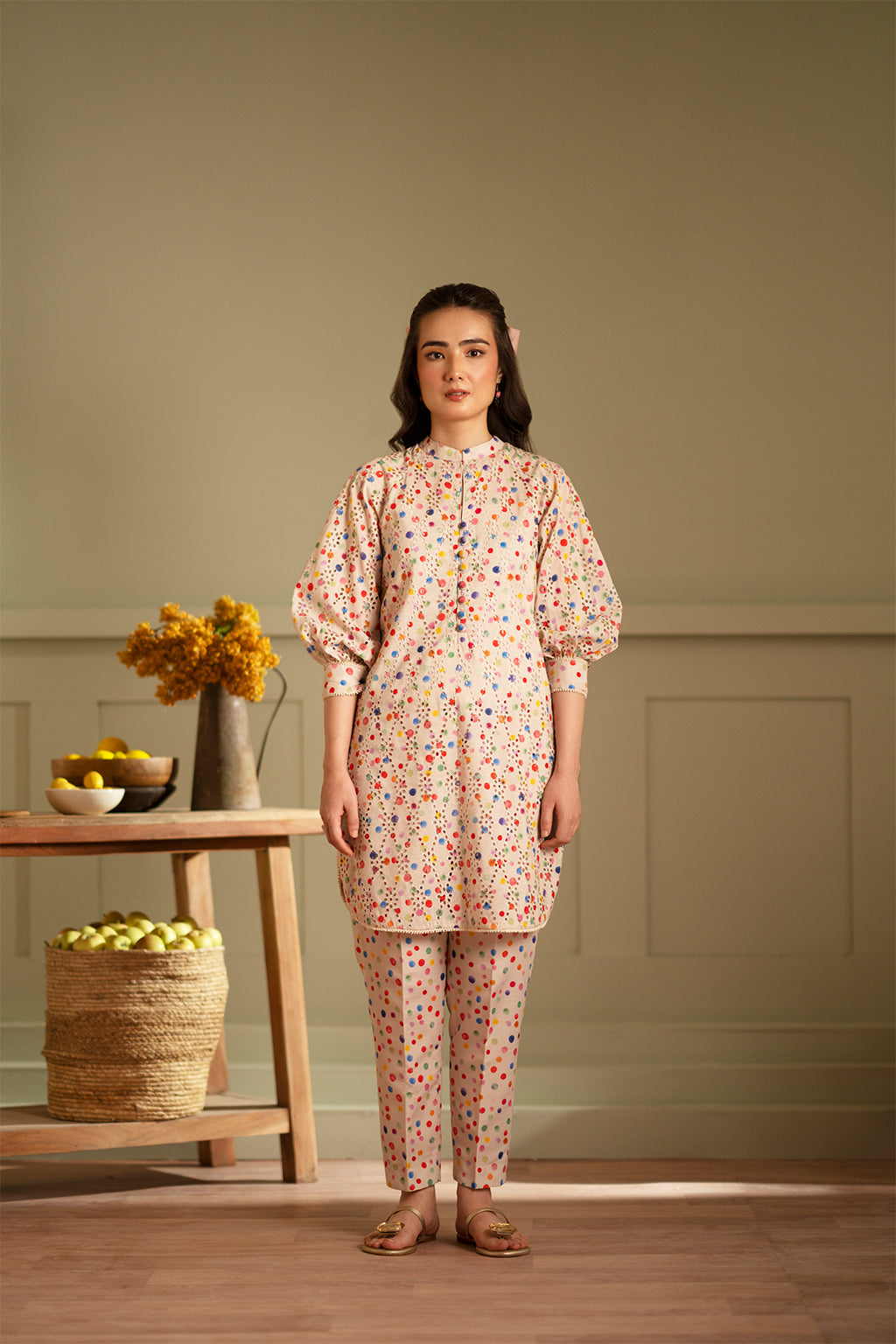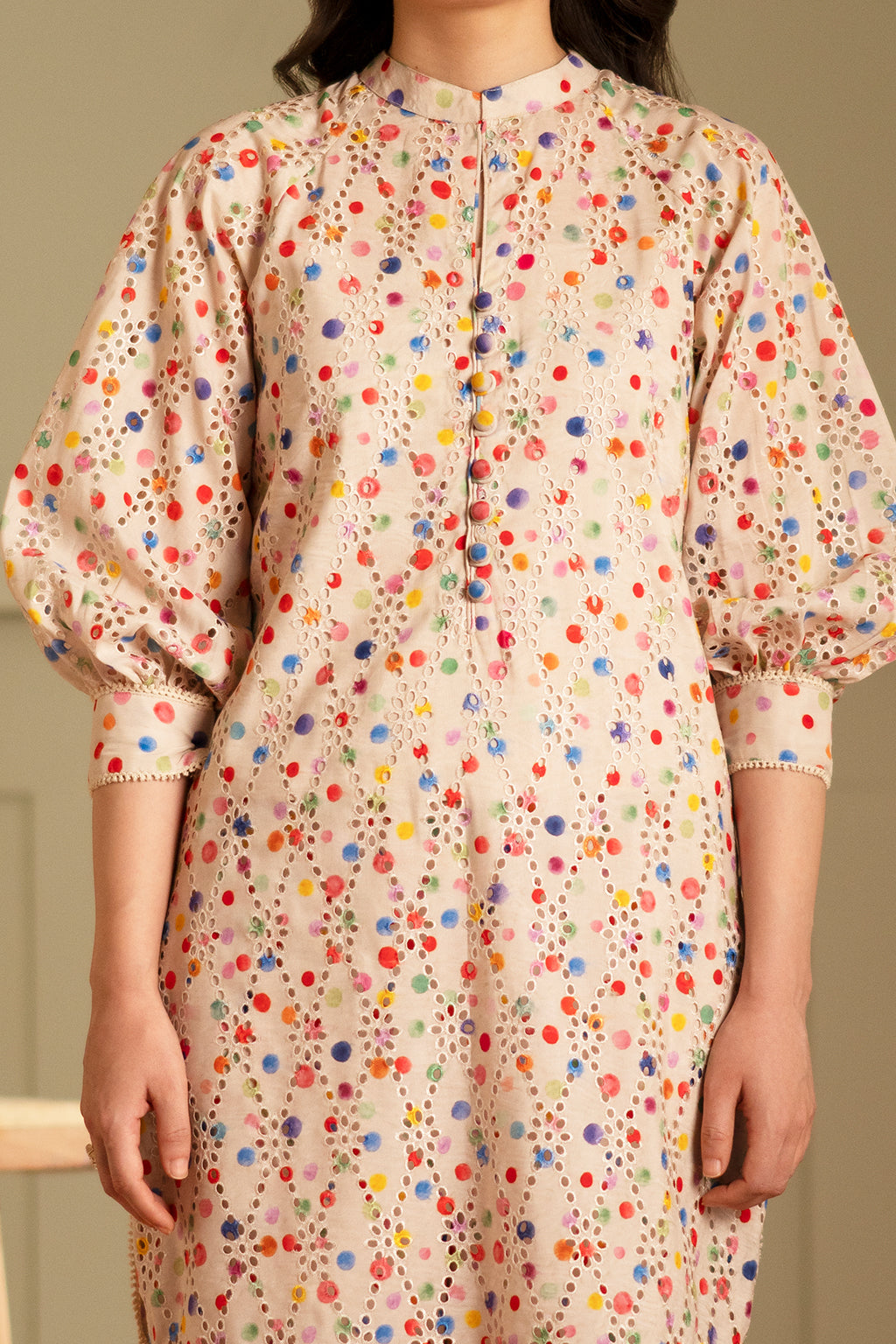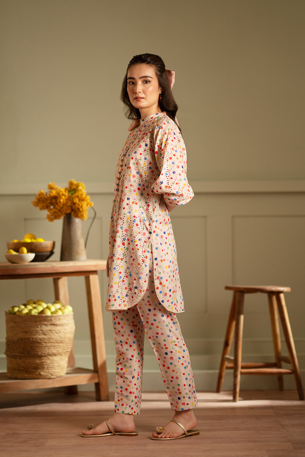Embroidered and printed chickenkari round hem shirt with buttons and lace detailing, paired with straight pants.