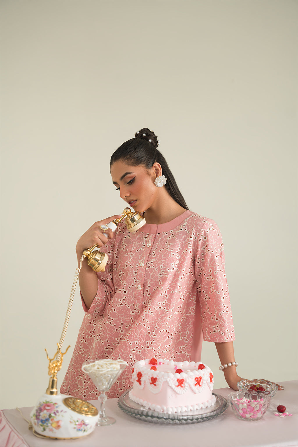 A pink schiffli embroidered shirt with elegant neckline details made from premium cotton, paired with shalwar and separate inner