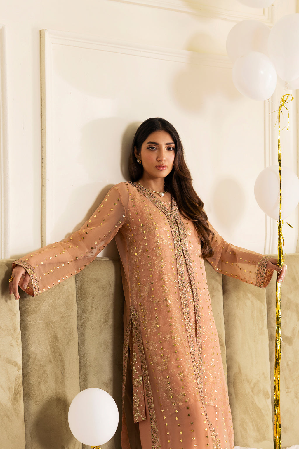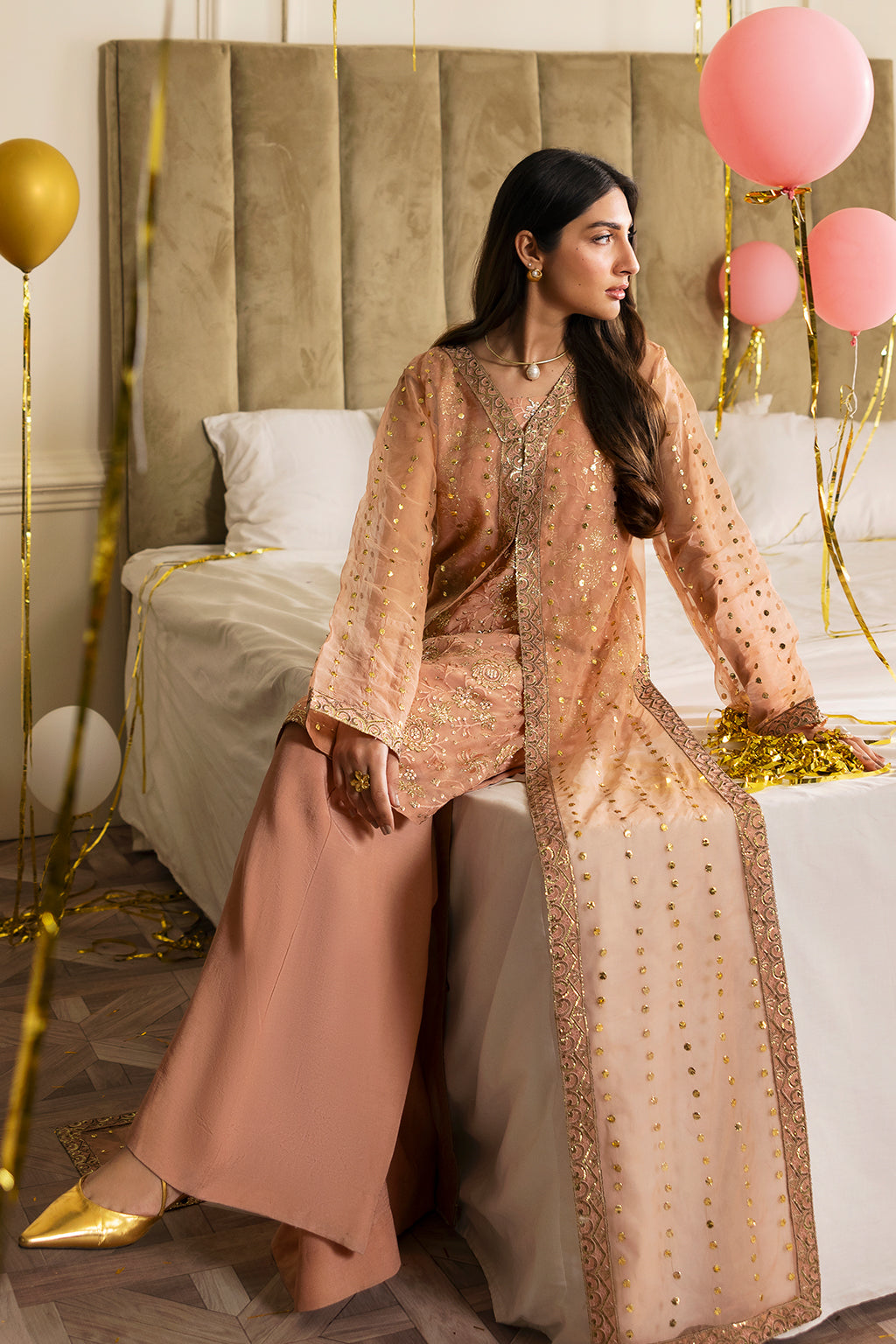 A peach embroidered and mukaish work organza long open jacket with fancy embroidered chiffon inner tunic, paired with wide-legged silk trousers