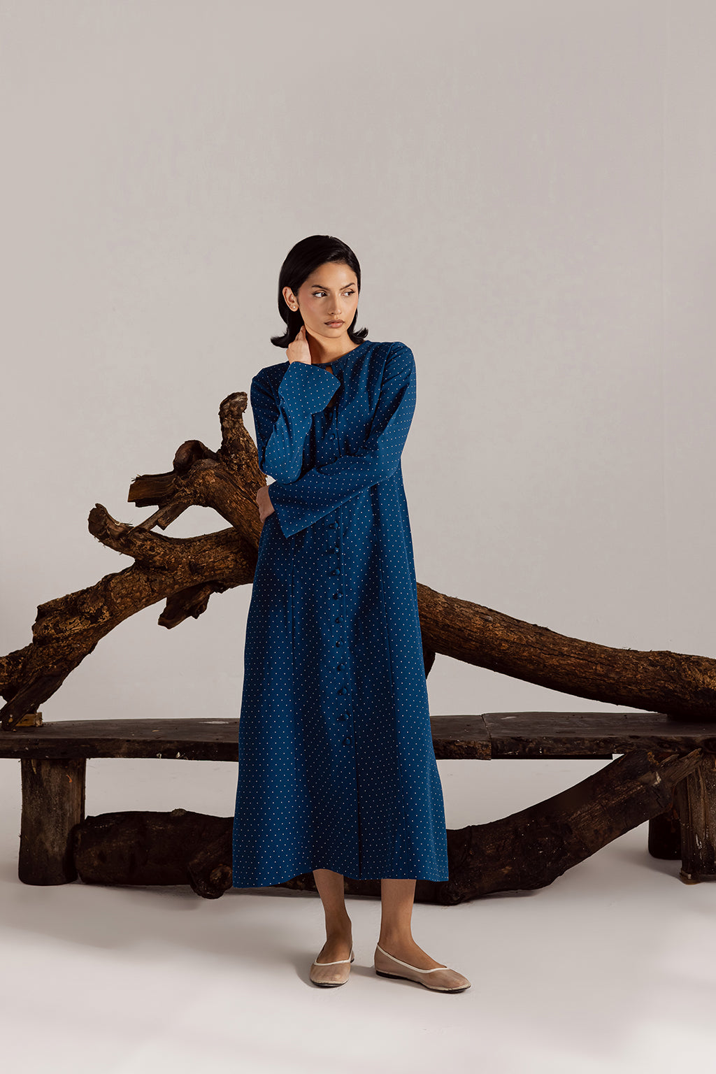Chic blue long dress in georgette, detailed with subtle polka dots, front button-down style, and a keyhole neckline for a refined, graceful look