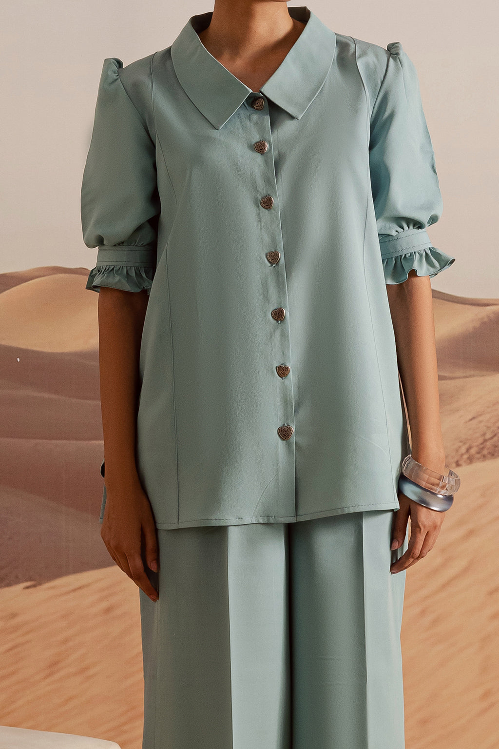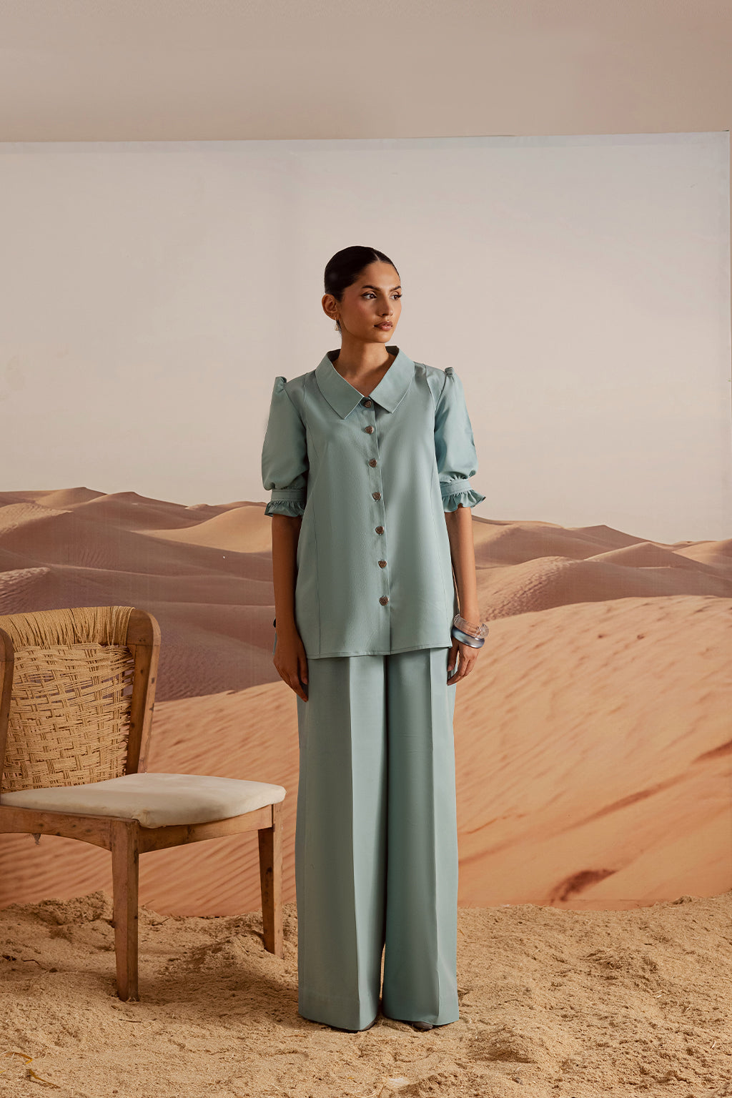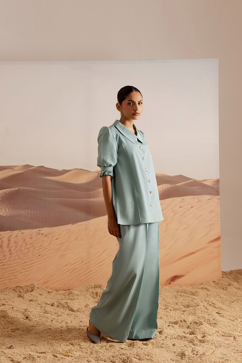 Powder blue grip co-ord set with a collared button-down top, puff sleeves with ruffle cuffs, and wide-leg trousers. Accented with heart-shaped buttons for a chic, playful touch.