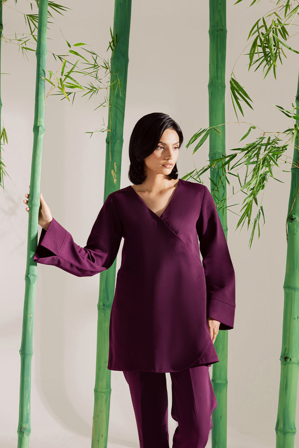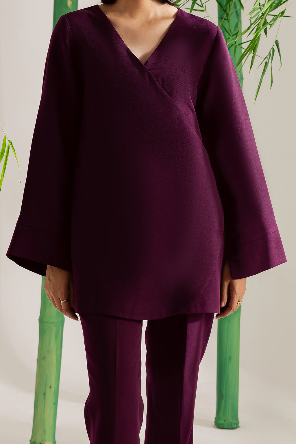 Elegant plum co-ord set in soft georgette, featuring a wrap-style top with flared sleeves and straight pants for a sleek, modern look