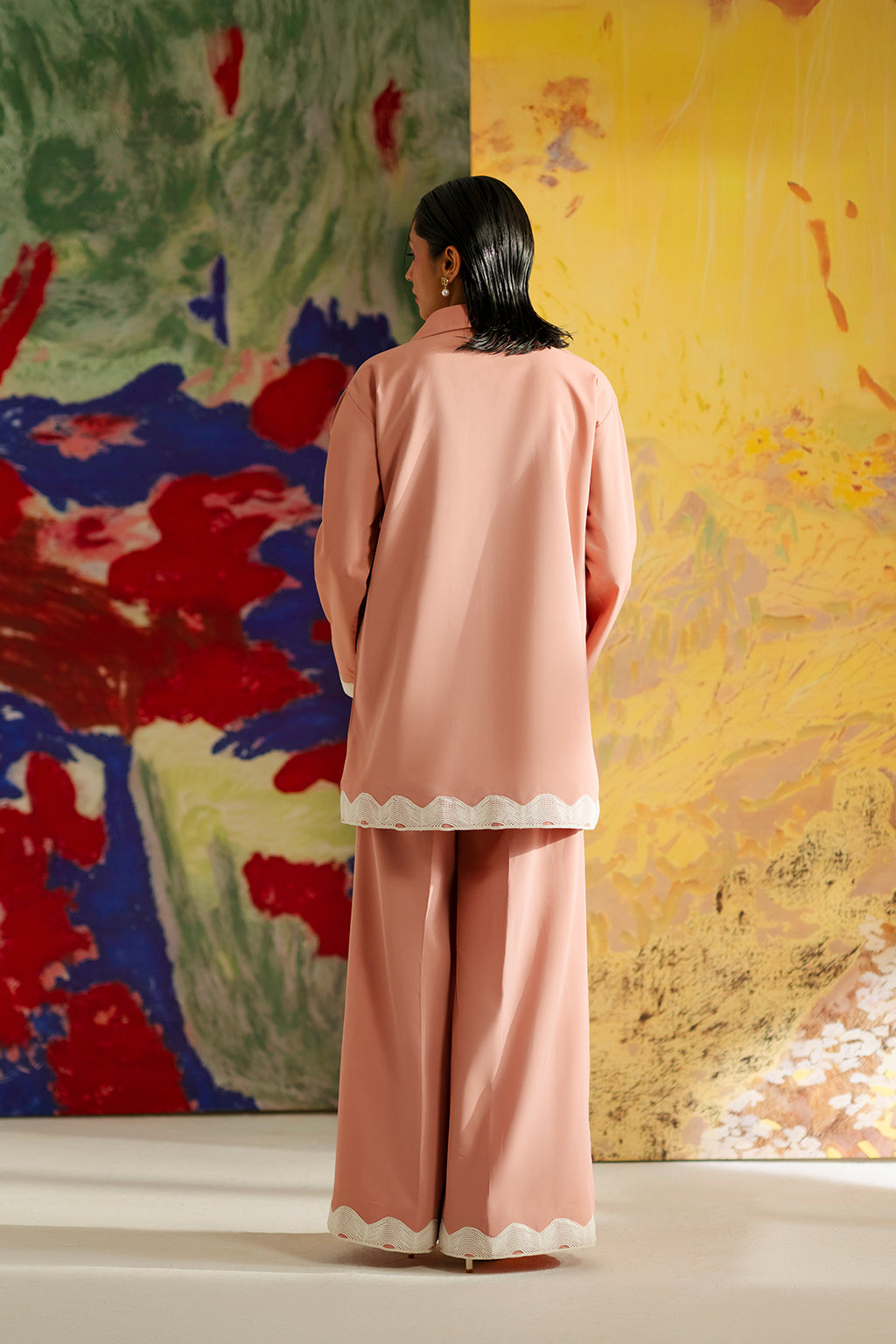 A blush pink georgette CO-ORD set featuring a structured top with contrast collar and placket detailing, paired with sleek boot cut trousers