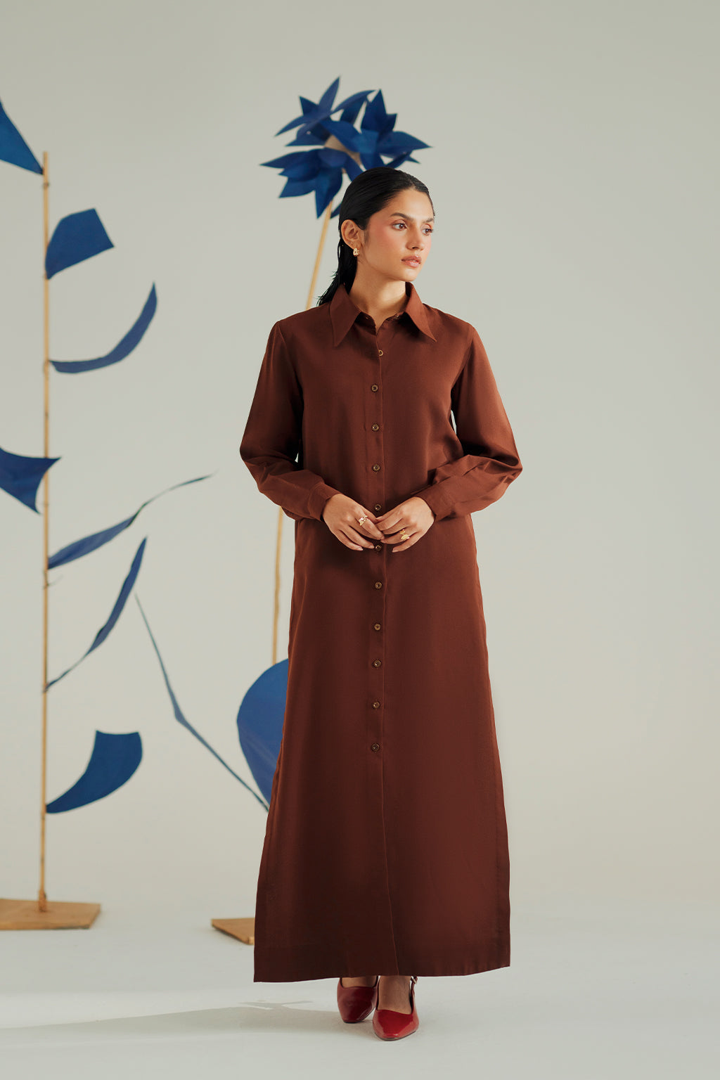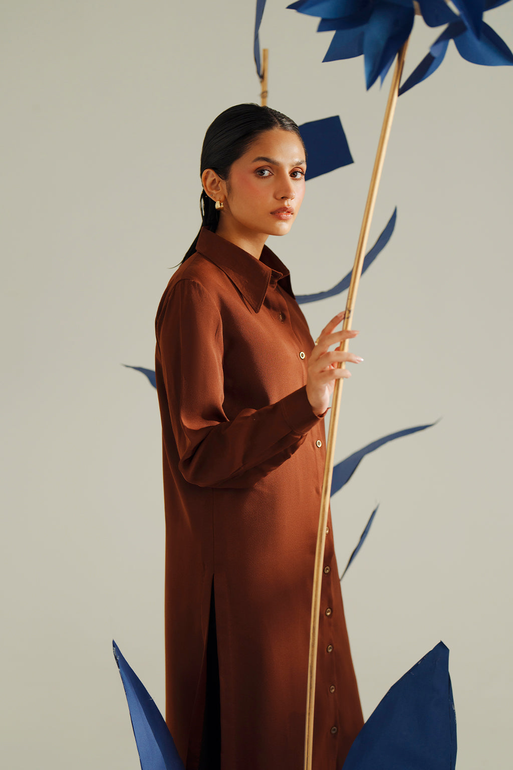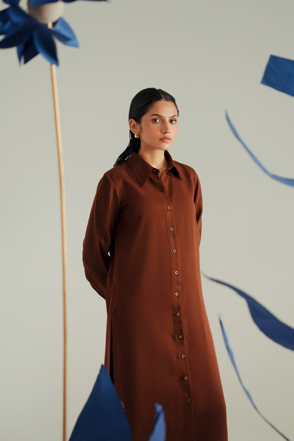 A long dark brown georgette button-down shirt featuring a classic collar, cuffed sleeves, and side slits for added movement and style