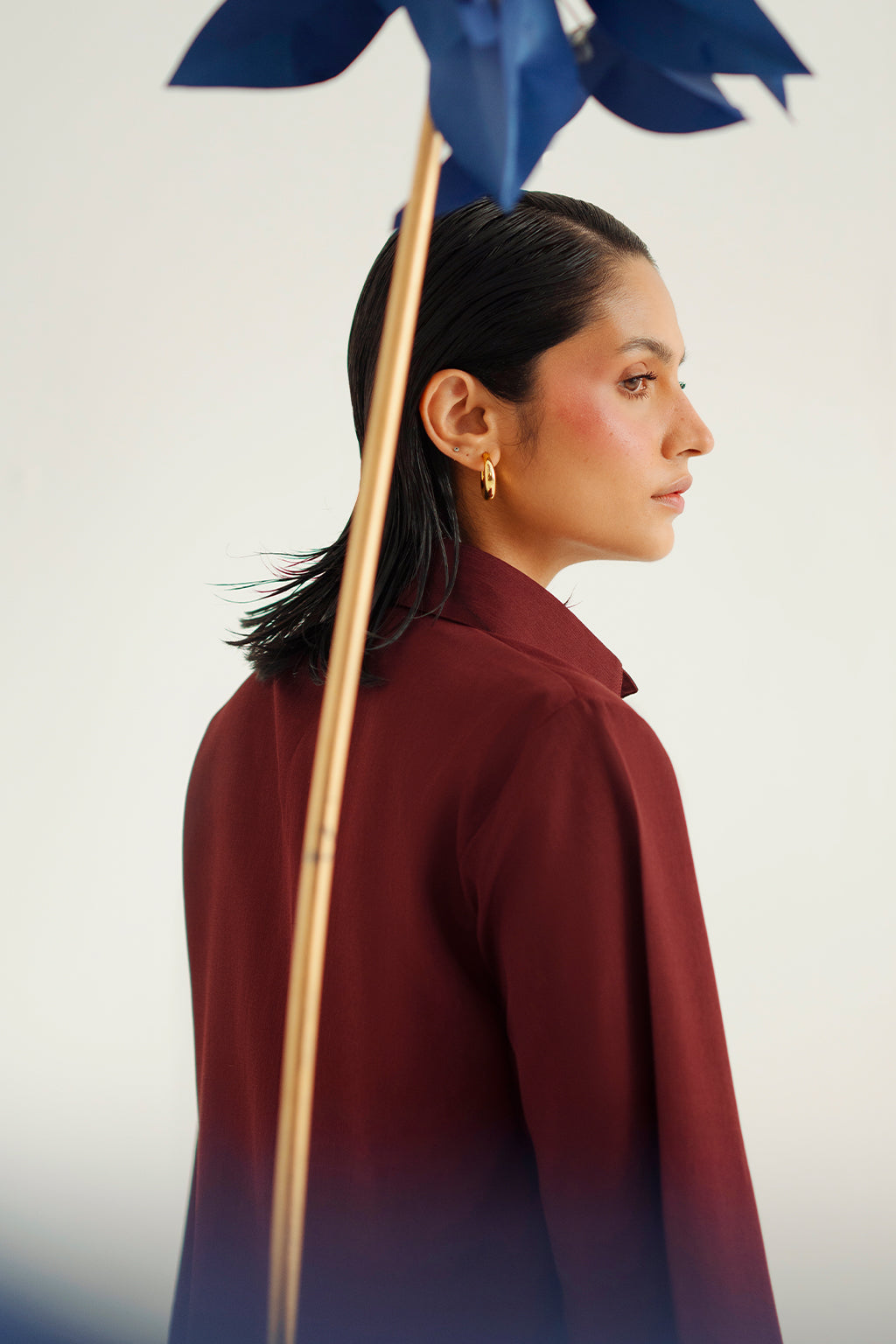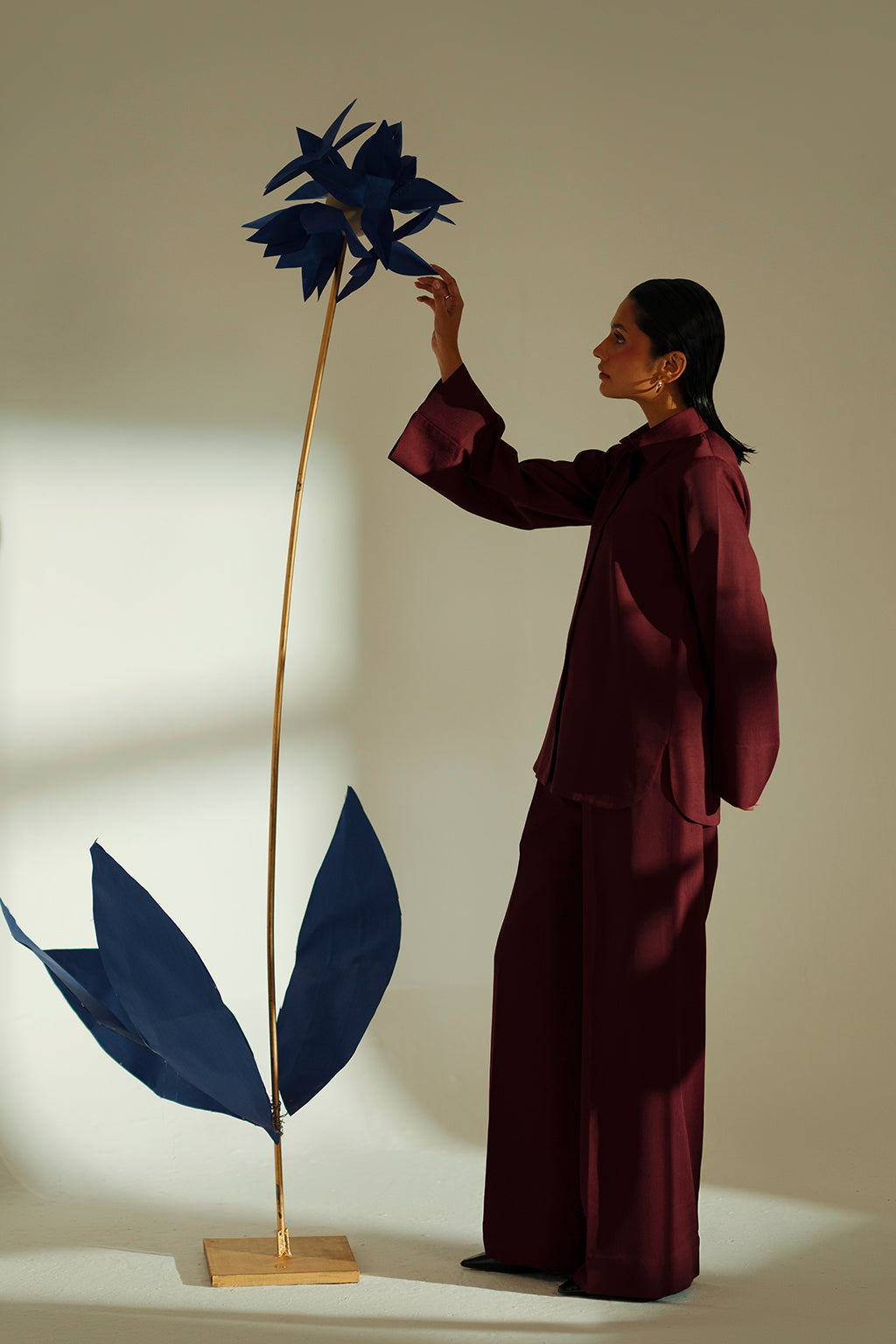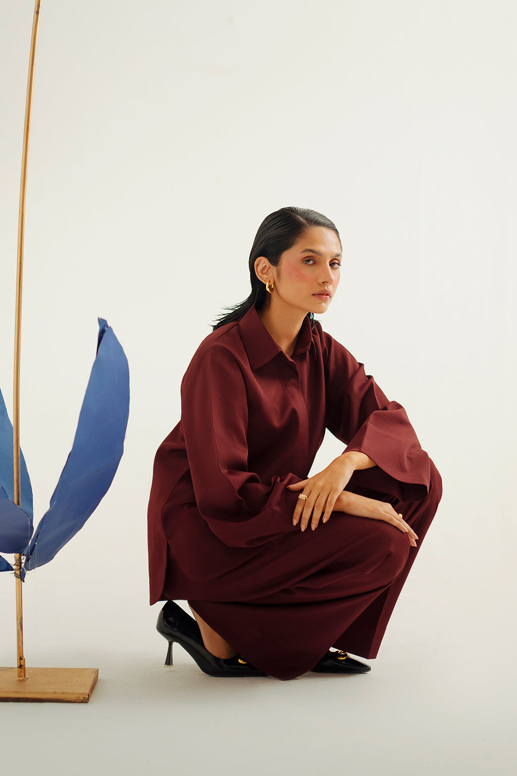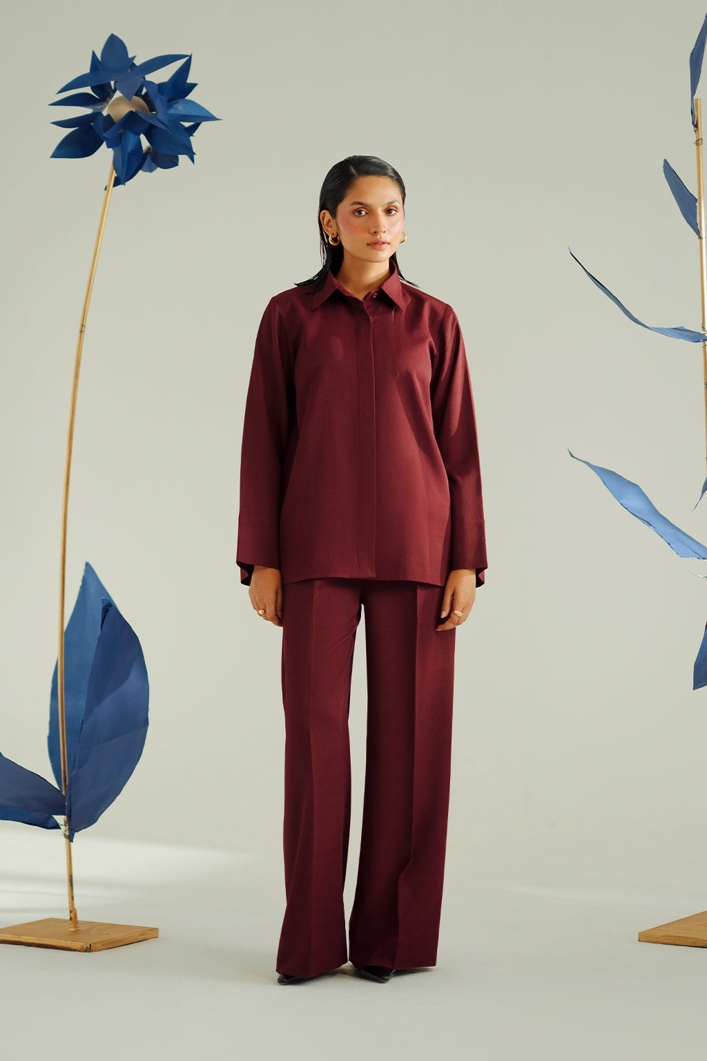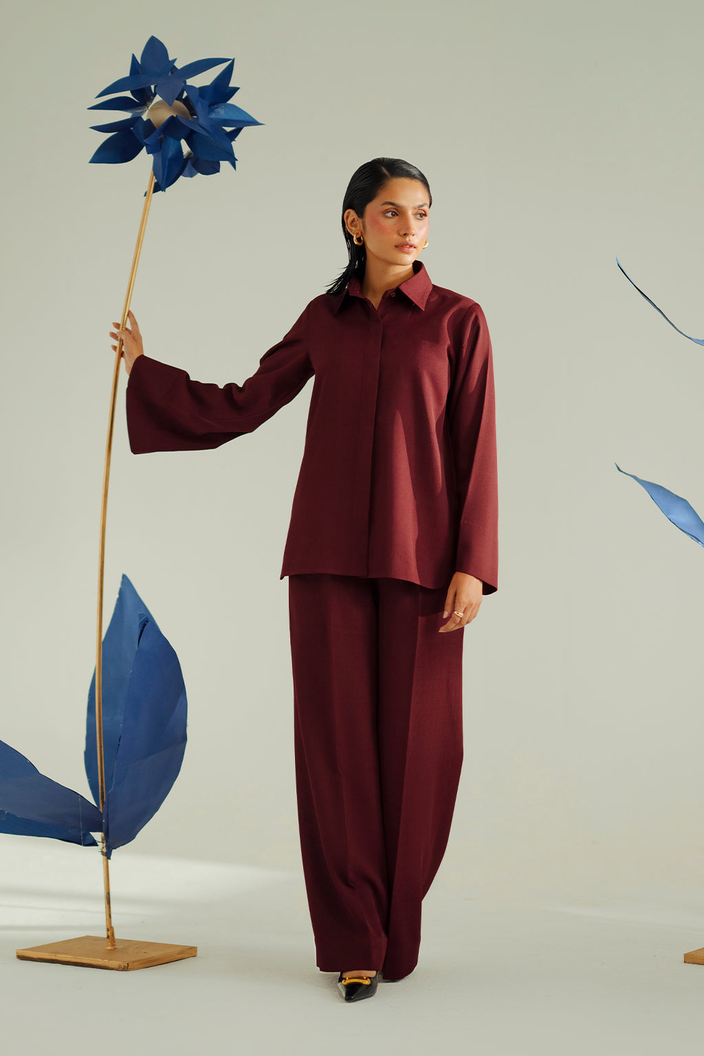 CO-ORD set in a soft georgette, featuring collared button down shirt with tailored wide leg pants