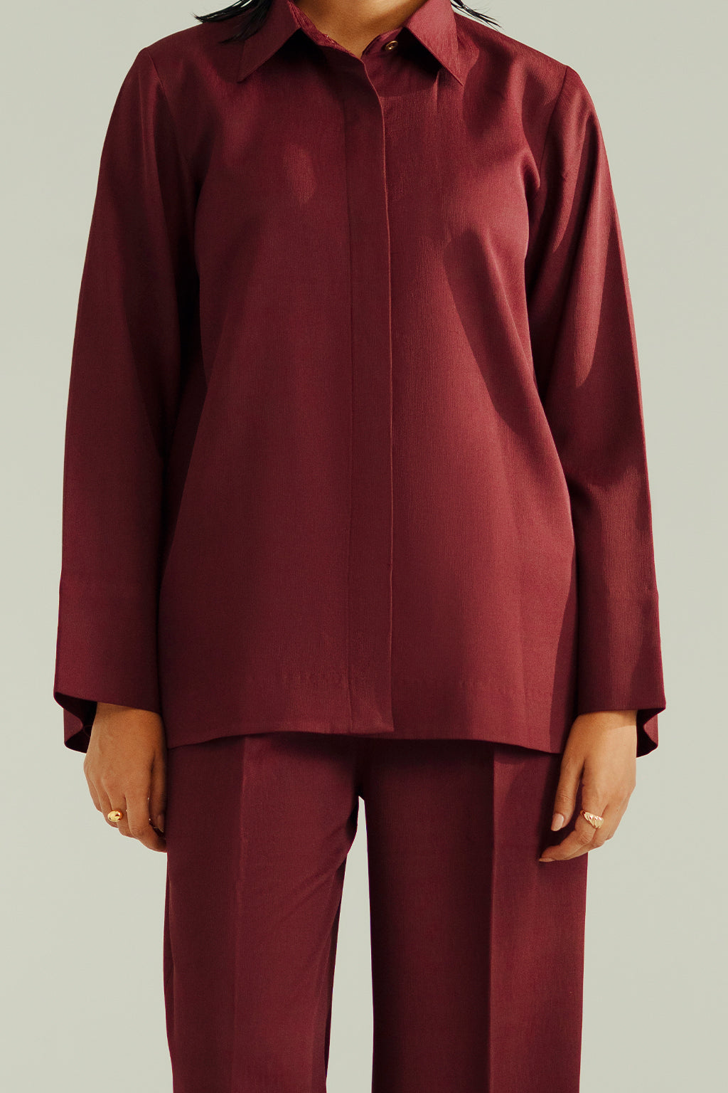 CO-ORD set in a soft georgette, featuring collared button down shirt with tailored wide leg pants