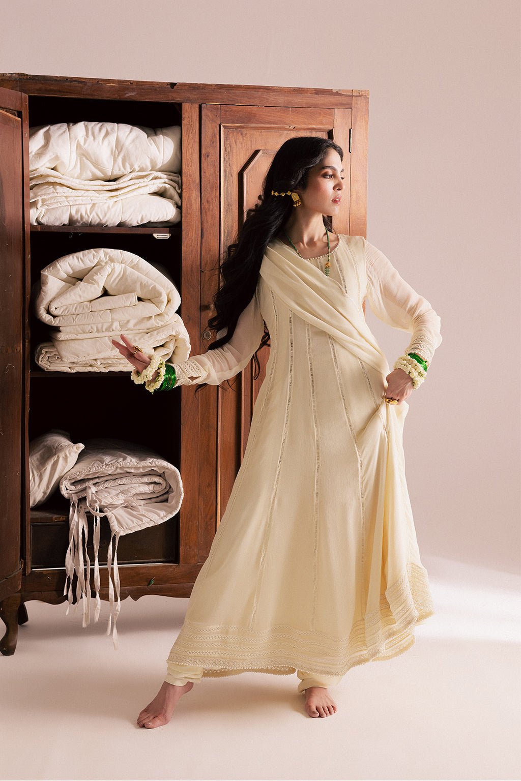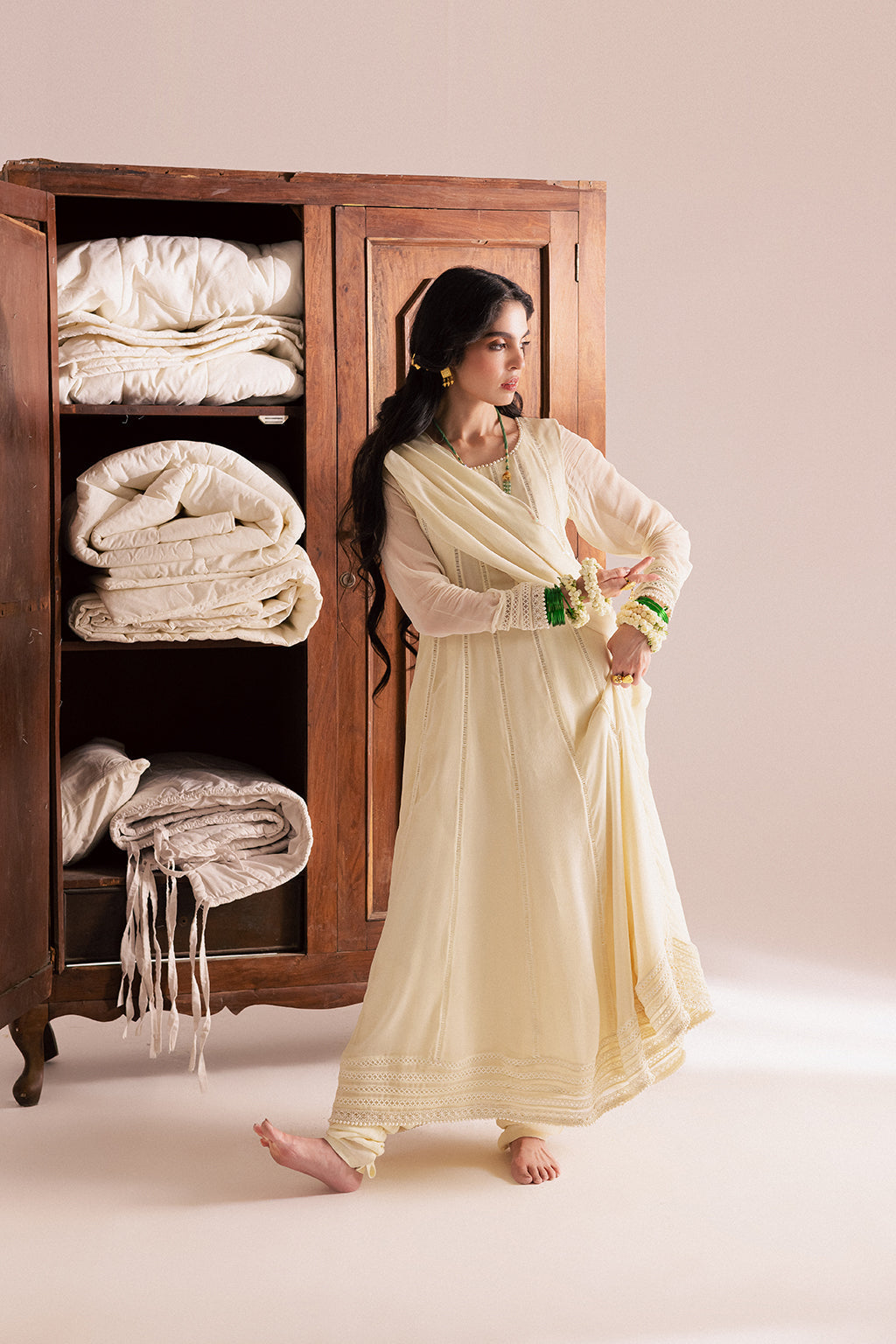 Plain white chiffon Anarkali adorned with lace and pearl detailing, paired with embroidered chiffon dupatta and raw silk churidar
