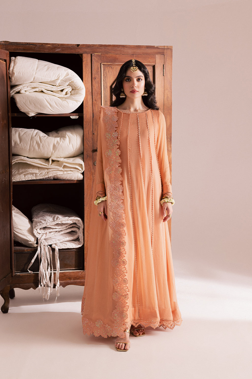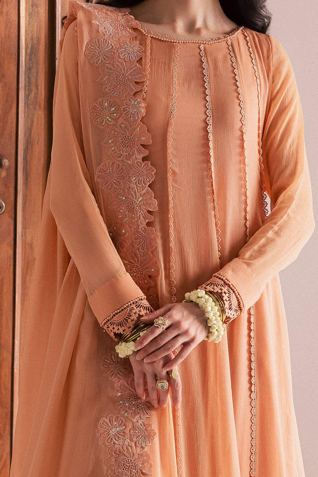 Peach chiffon Anarkali with lace and pearl detailing, paired with an embroidered chiffon dupatta and raw silk cigarette pants
