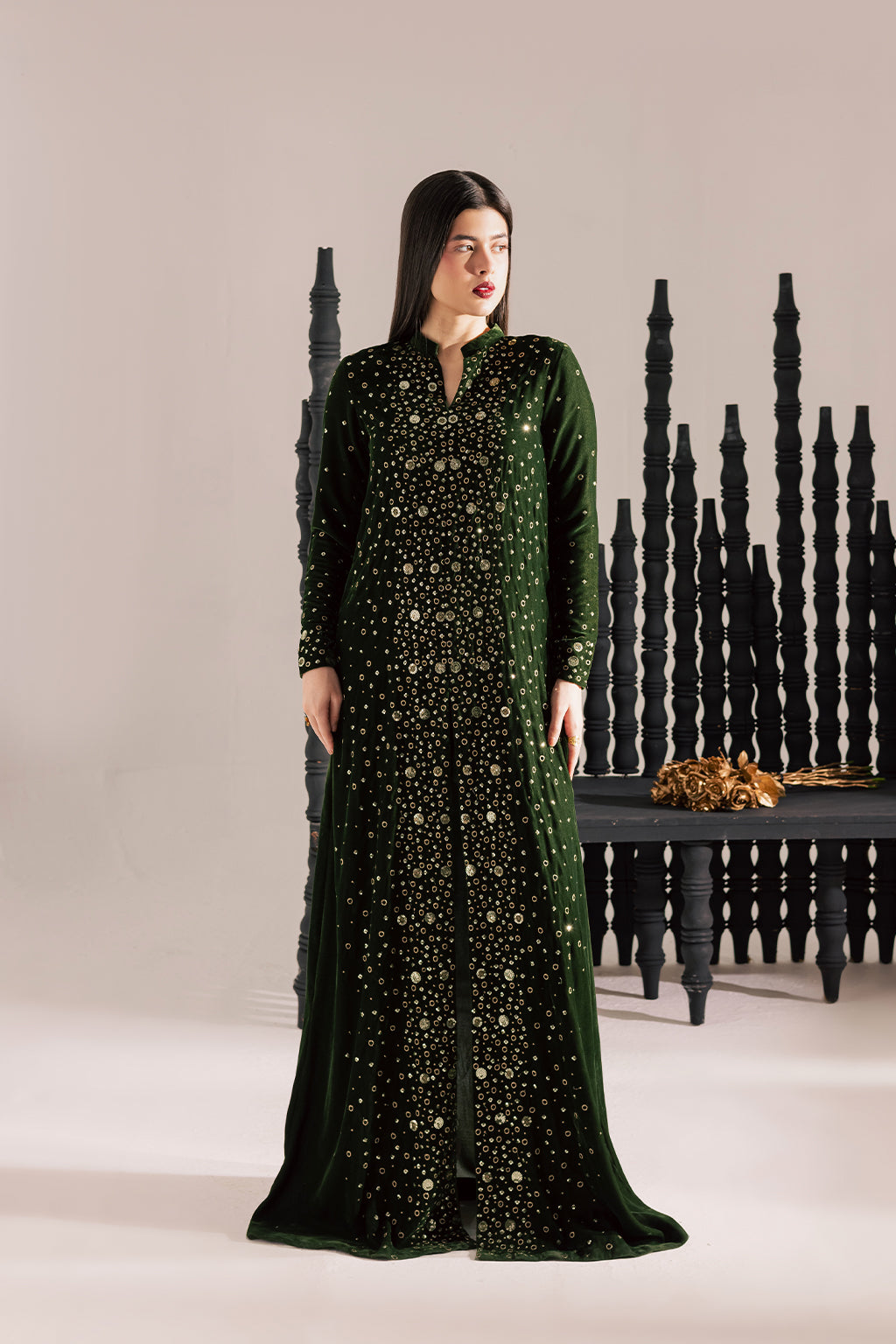 A luxurious emerald green velvet long shirt, beautifully adorned with intricate embroidery, paired with sleek raw silk pants.