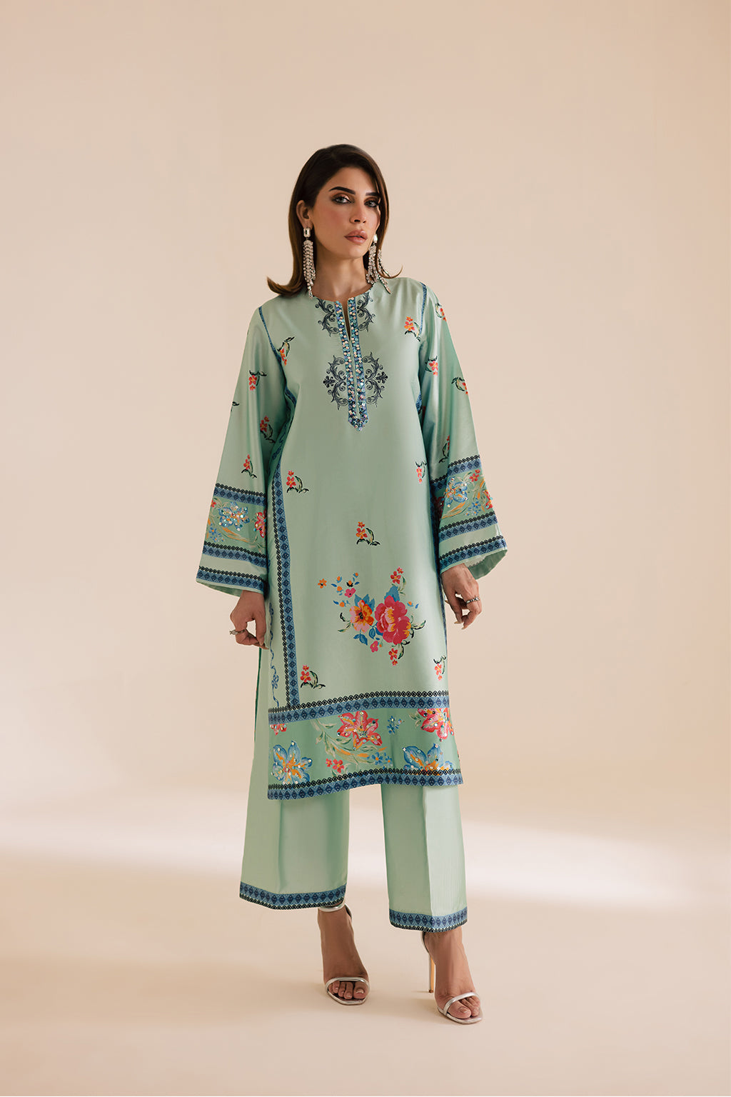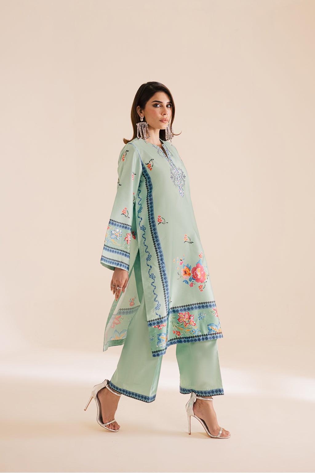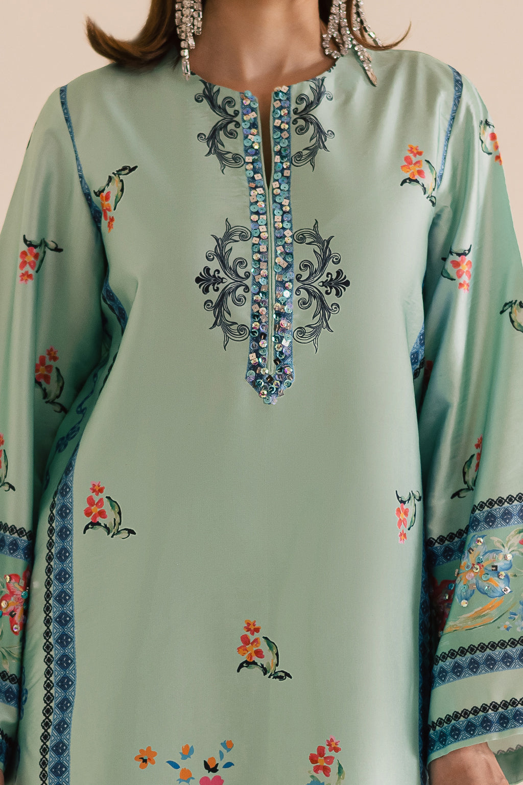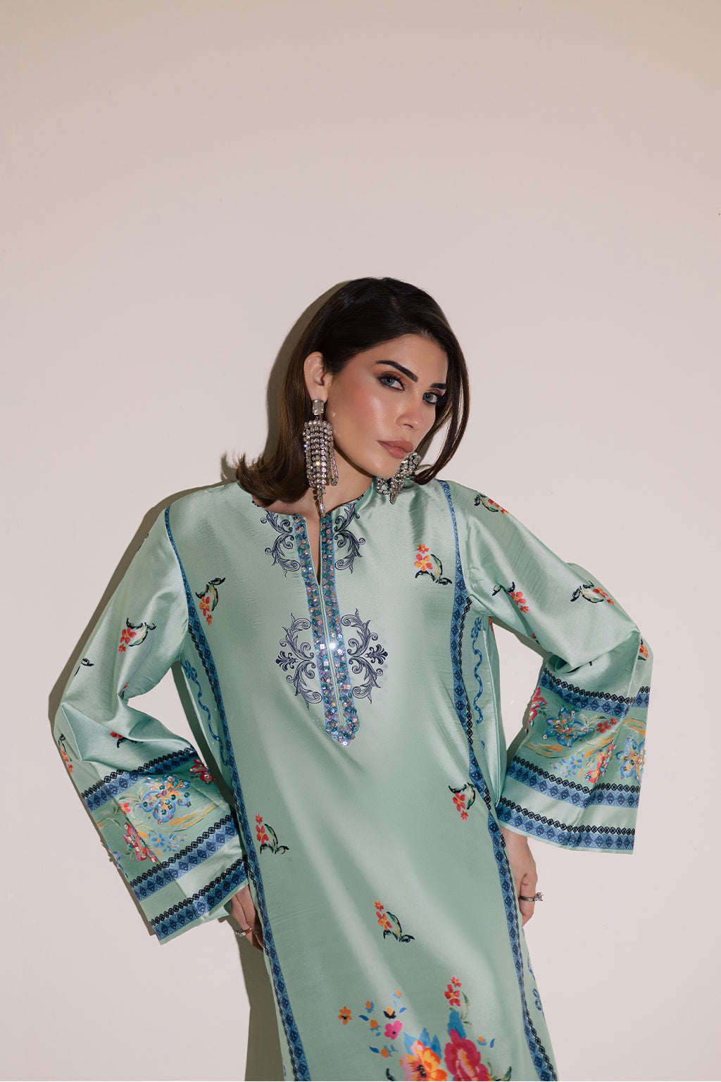 Printed silk shirt featuring intricate embellished details on the neckline, daman, and sleeves, paired with silk printed straight