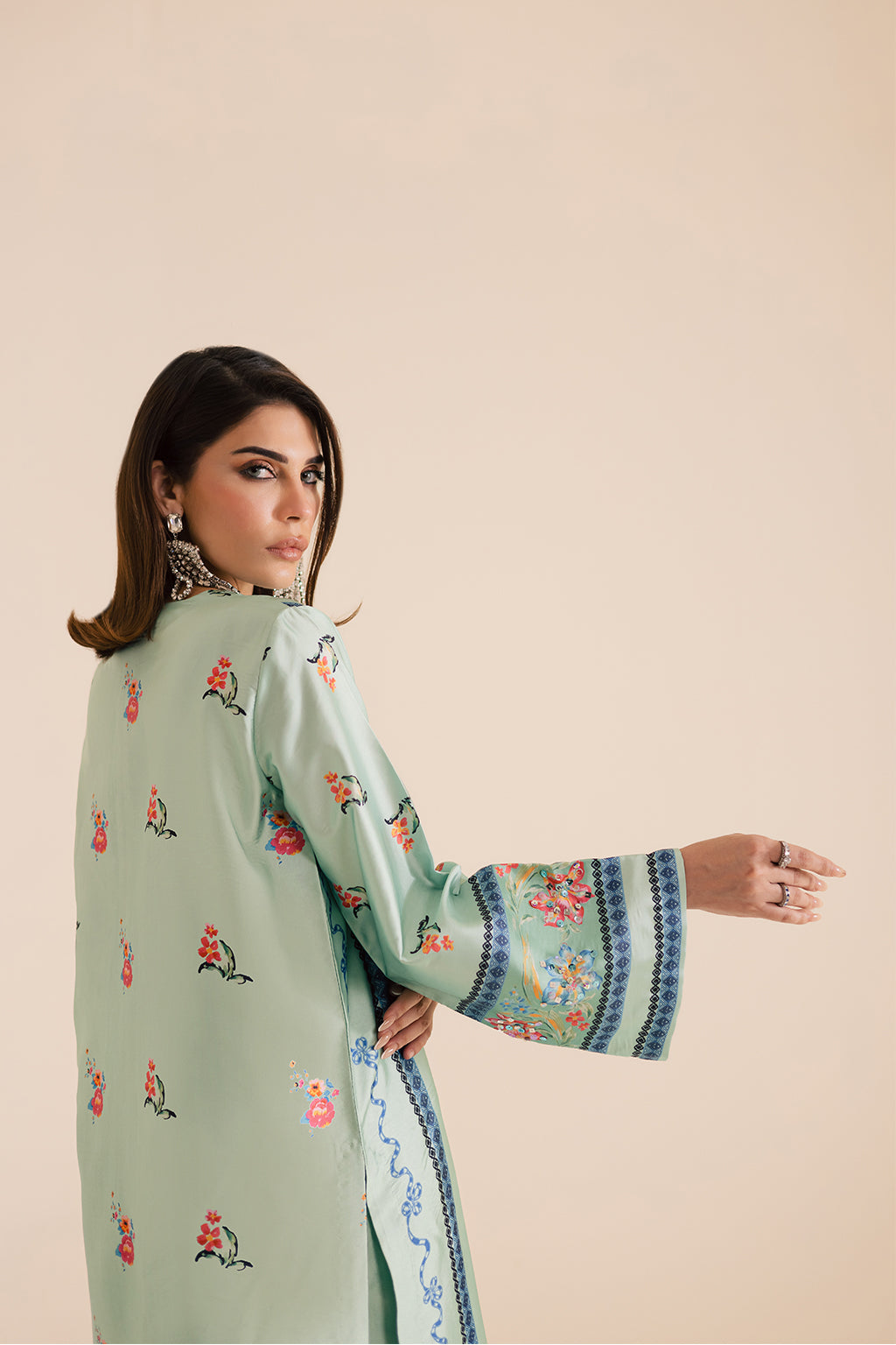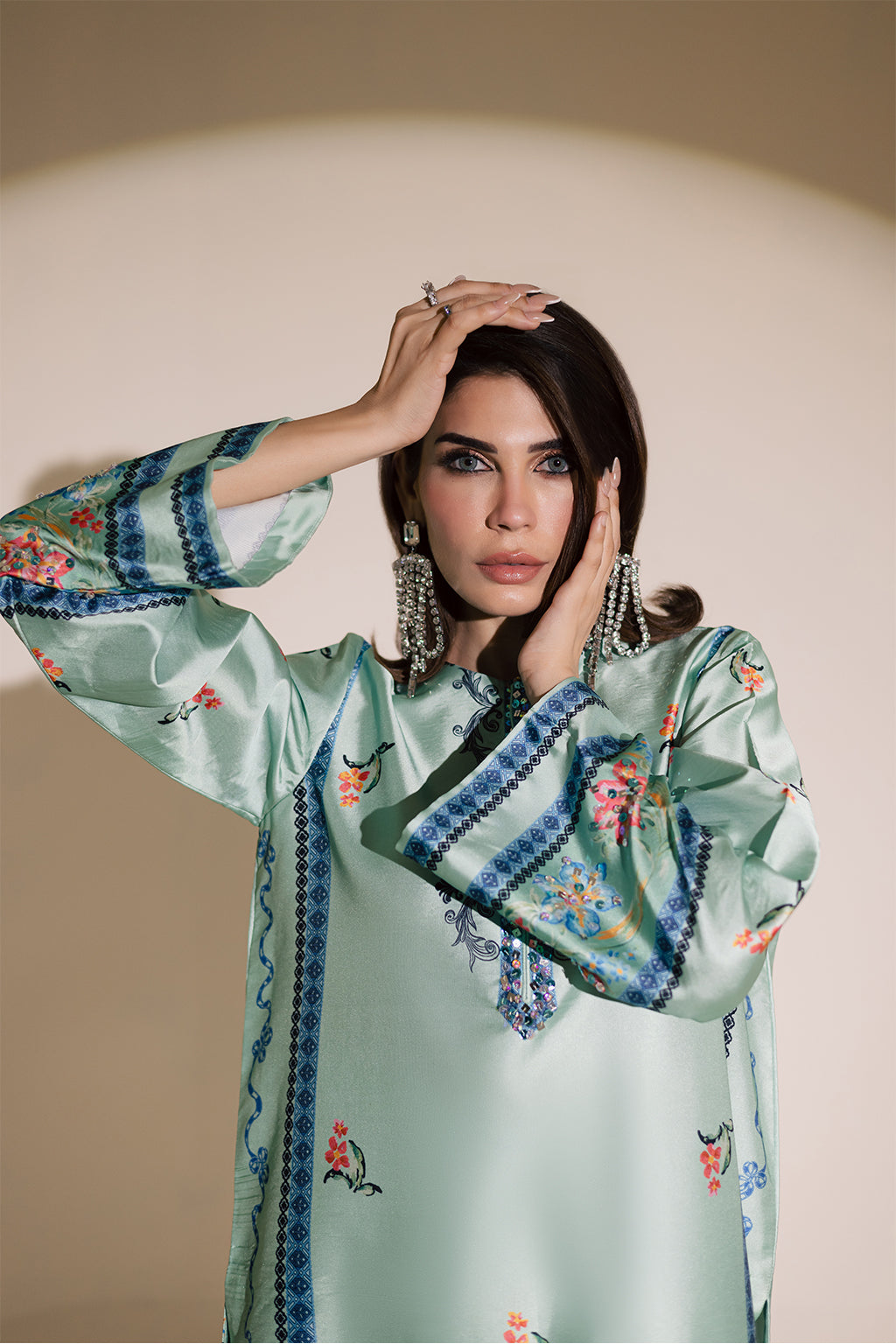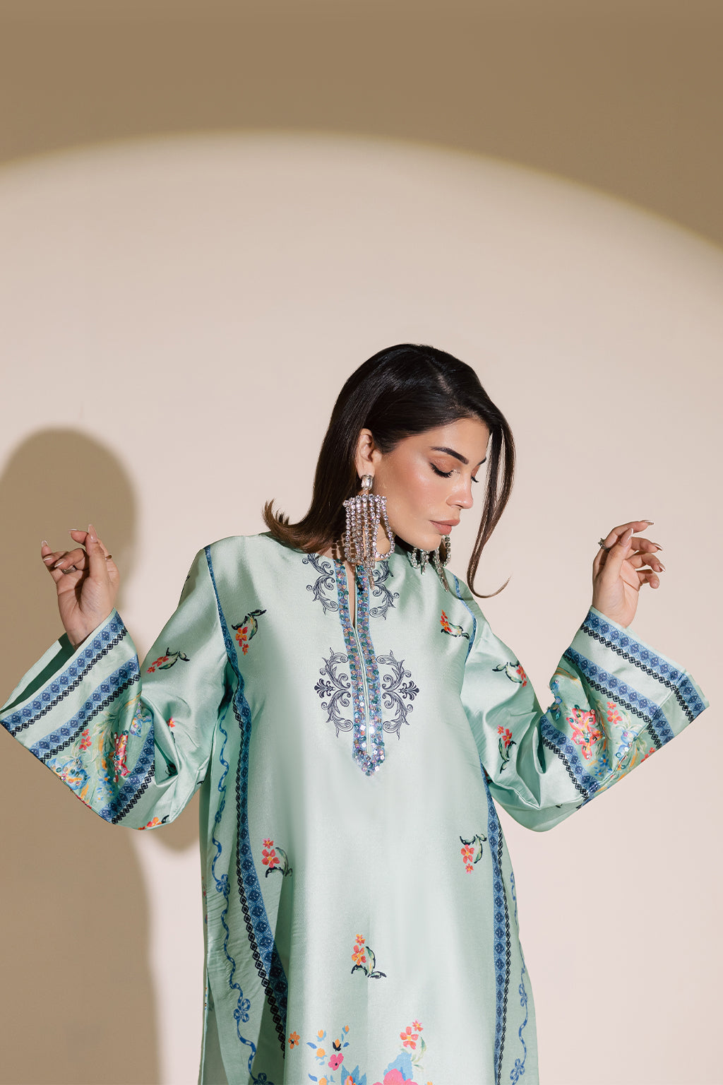 Printed silk shirt featuring intricate embellished details on the neckline, daman, and sleeves, paired with silk printed straight