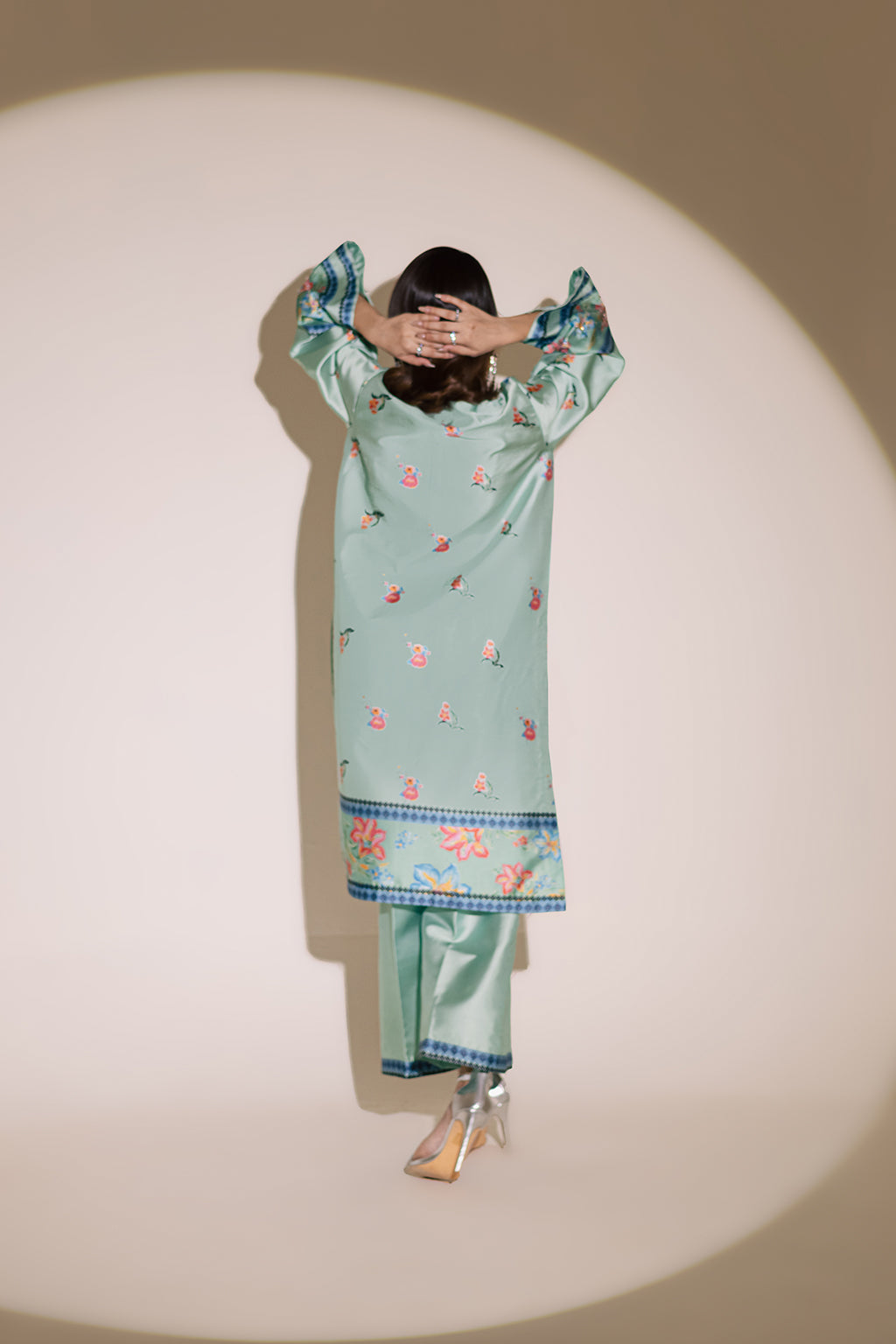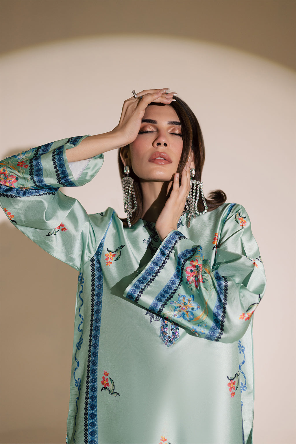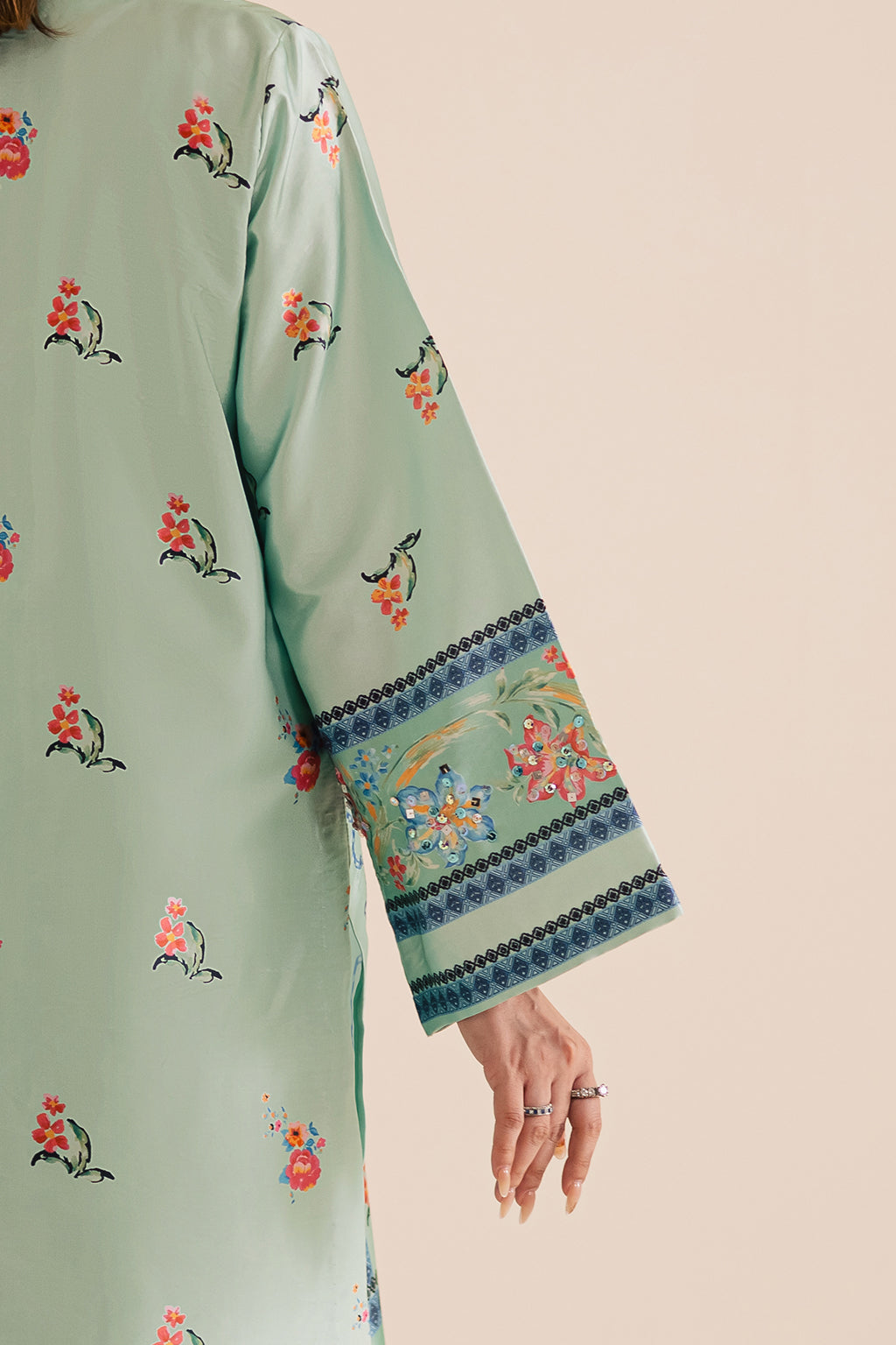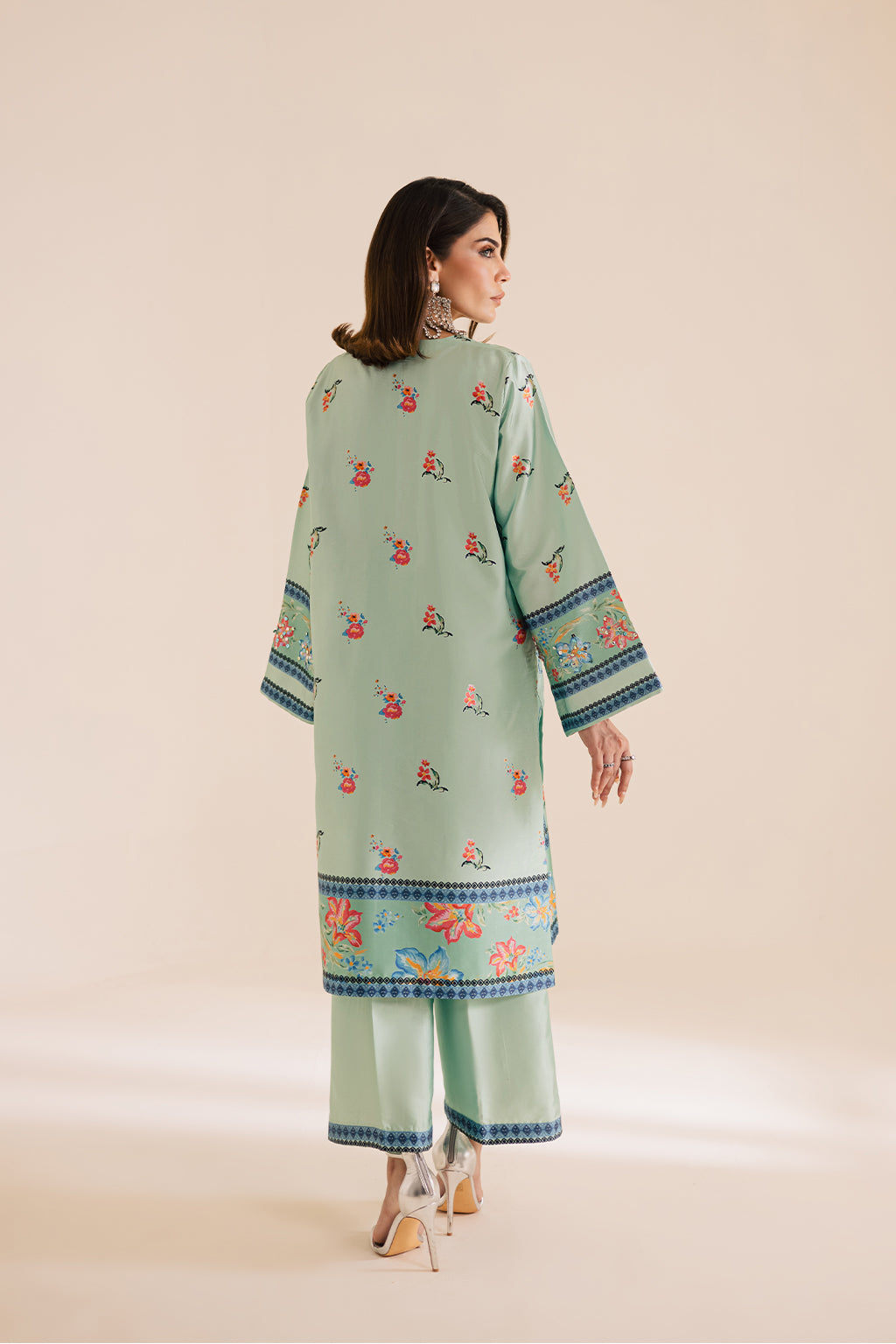 Printed silk shirt featuring intricate embellished details on the neckline, daman, and sleeves, paired with silk printed straight