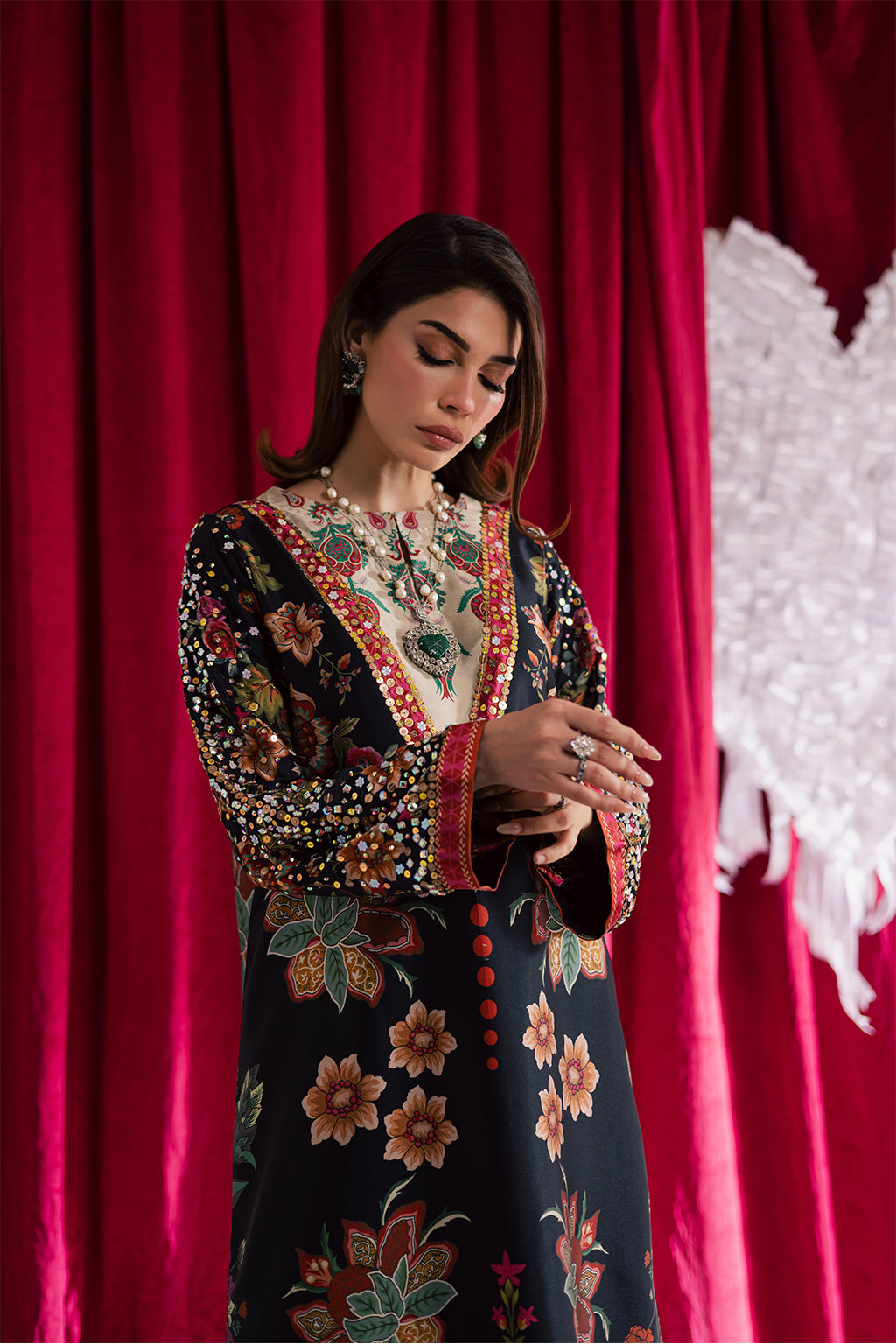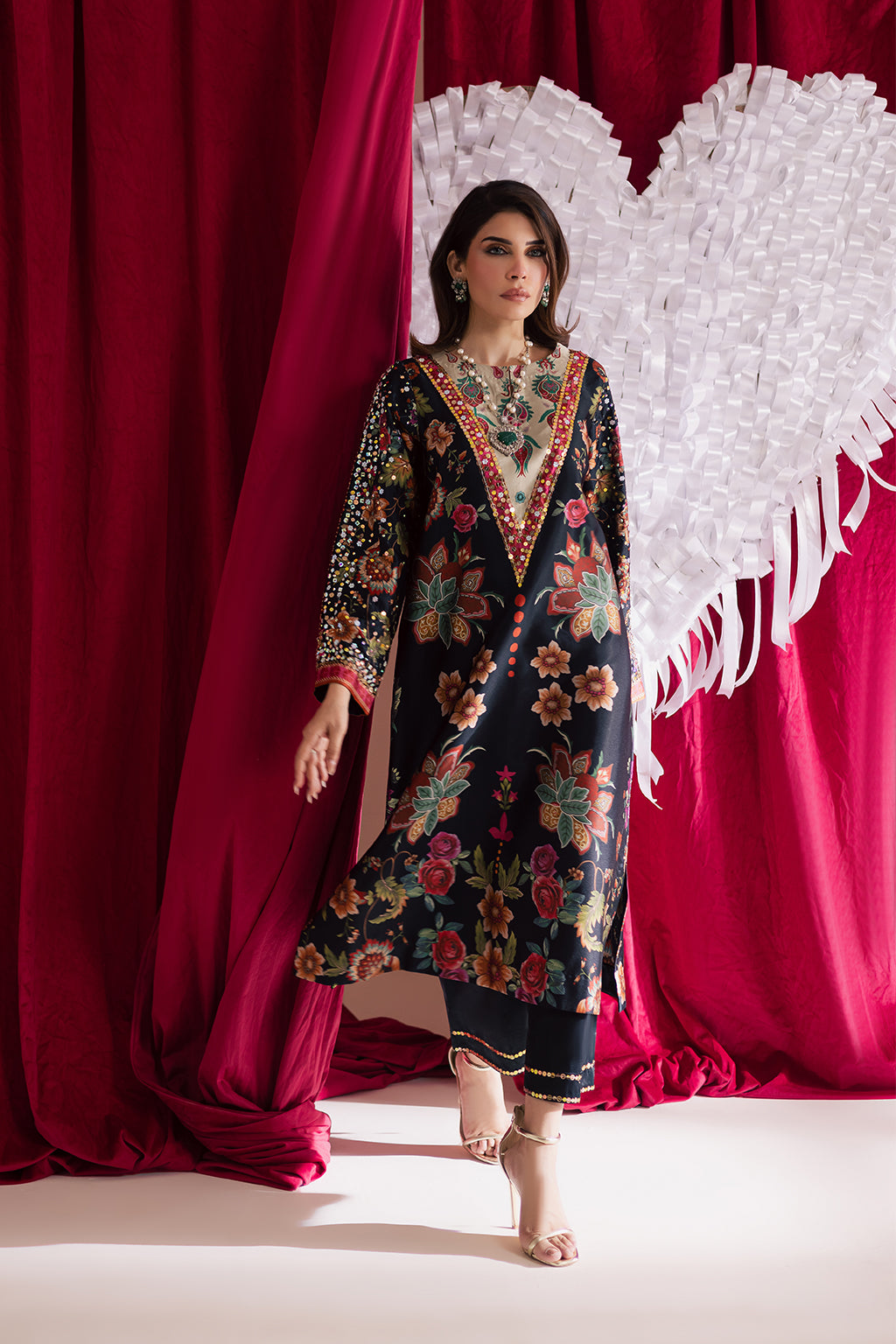 Printed silk shirt with intricate embellishments on the sleeves and neckline, paired with silk embellished straight pants for a refined and stylish ensemble.