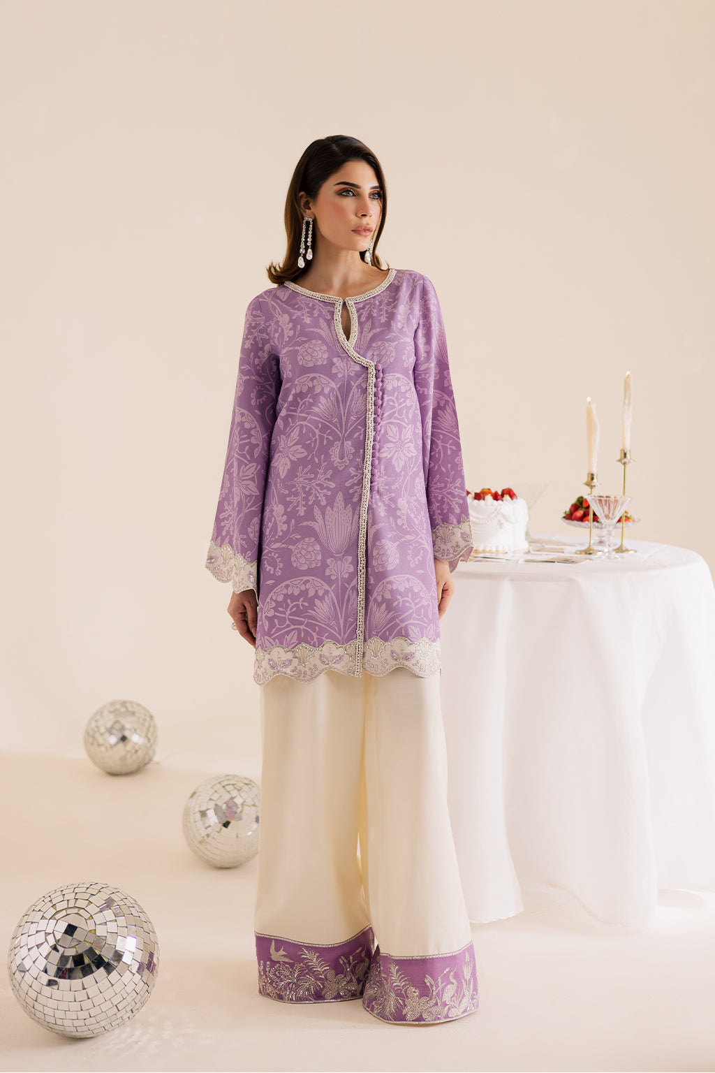 A lilac lawn silk printed shirt with embroidery and embellishments, paired with off-white flared trousers