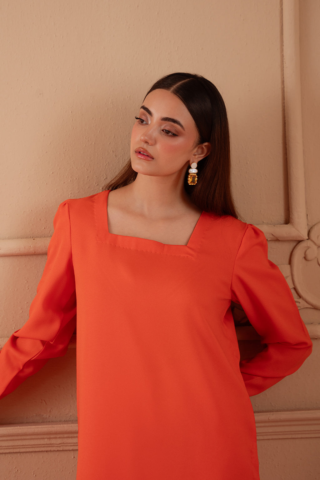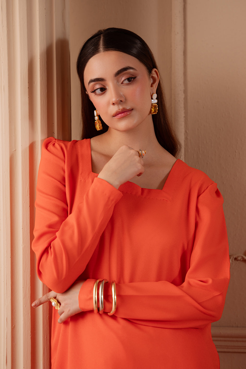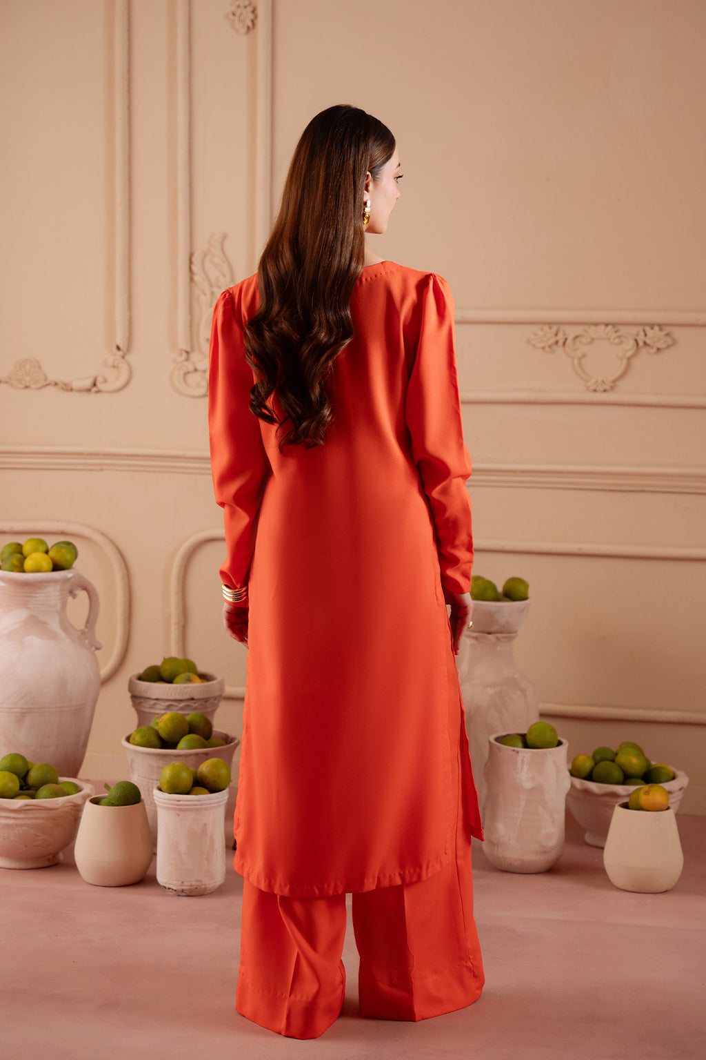 Beautiful bright orange georgette long shirt paired with georgette pants