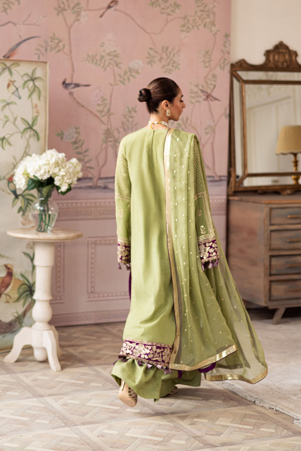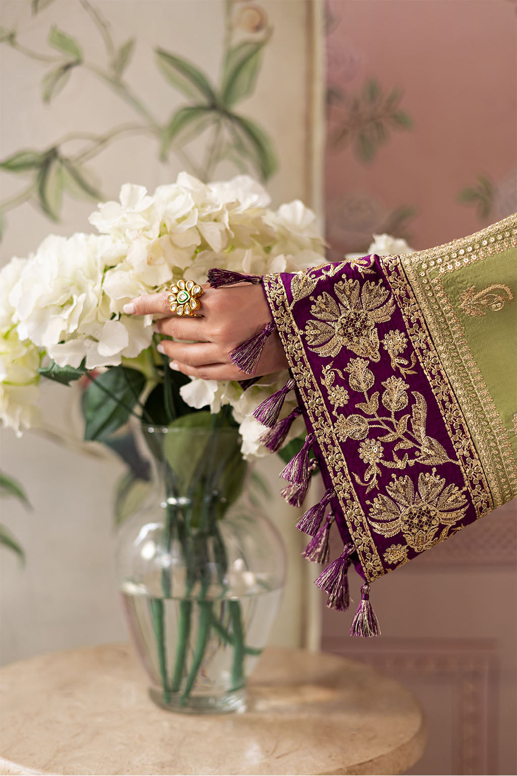 A sage gree front open shirt with dubka buttons on the front and tassel on the sleeves, featuring color-block detailing, paired with flaired pants and chiffon dupatta with a four sided embroidered border