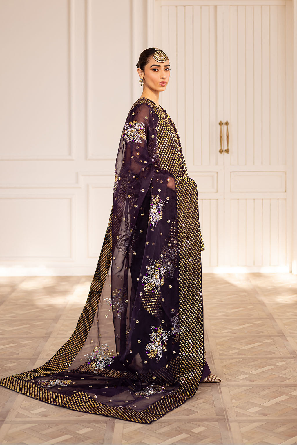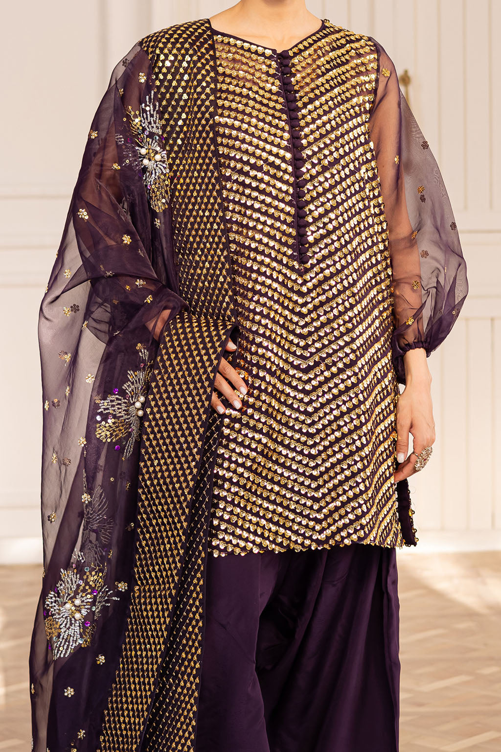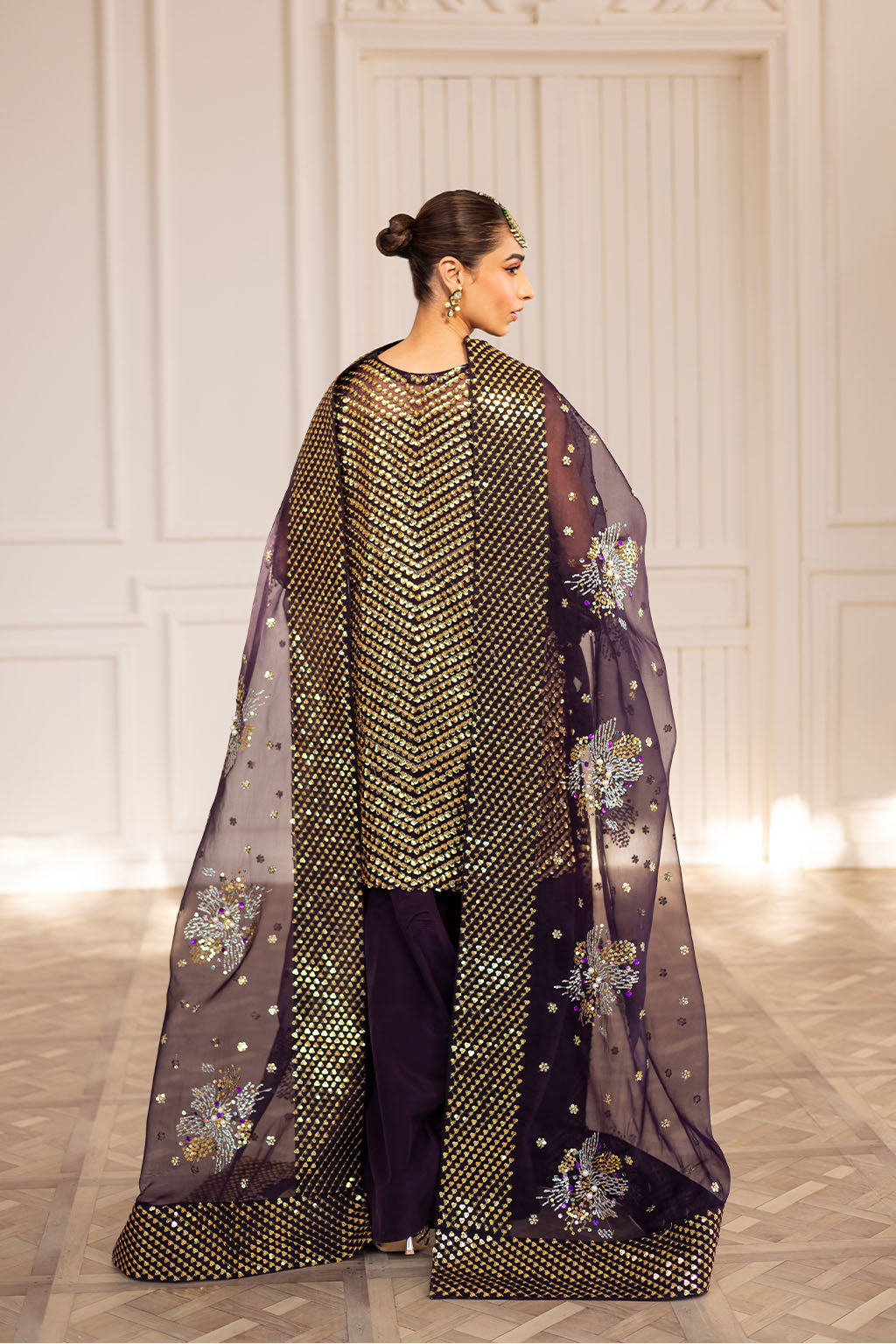 A plum sequin organza short shirt with puffed sleeves, paired with farshi shalwar and embroidered organza dupatta with embellishments