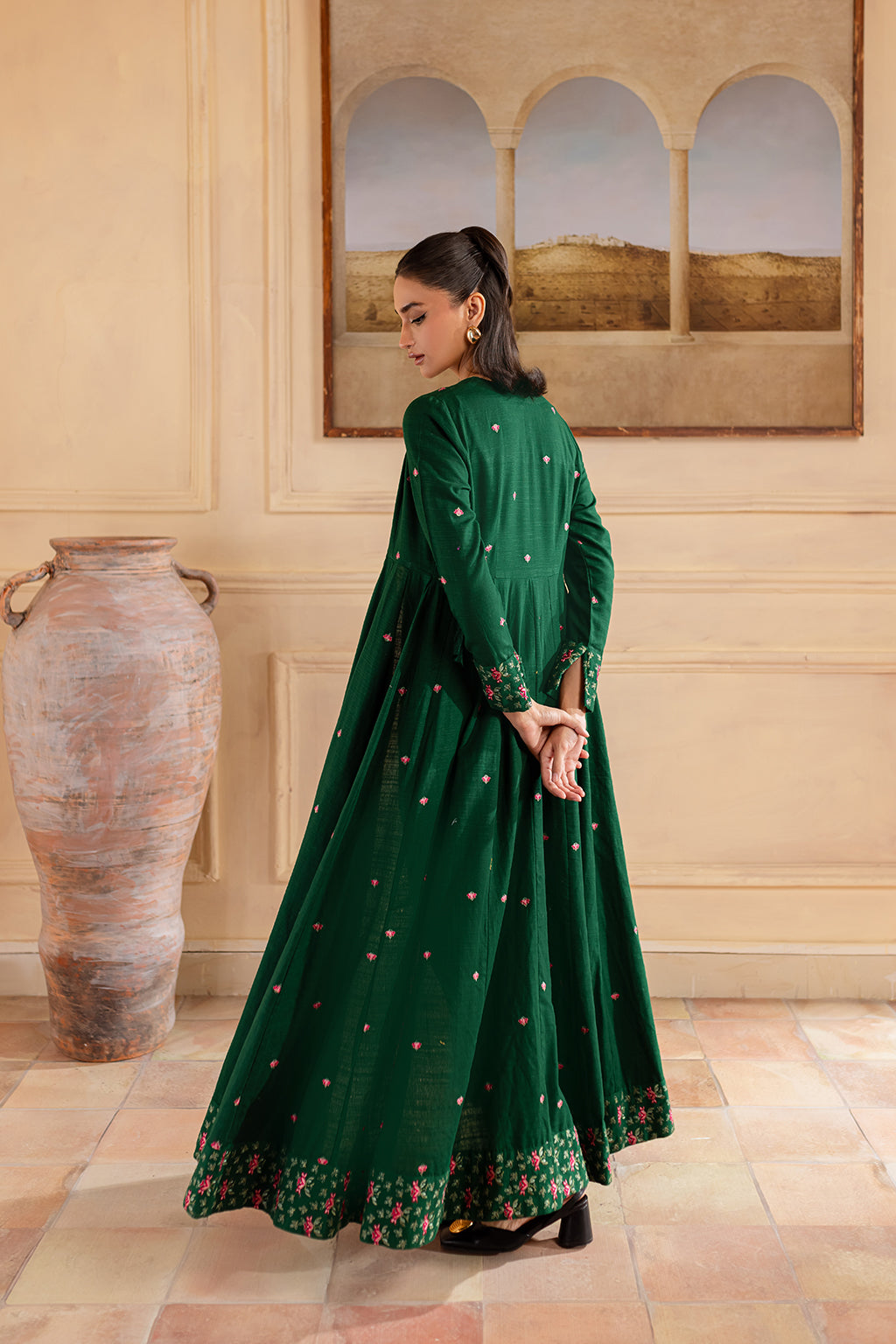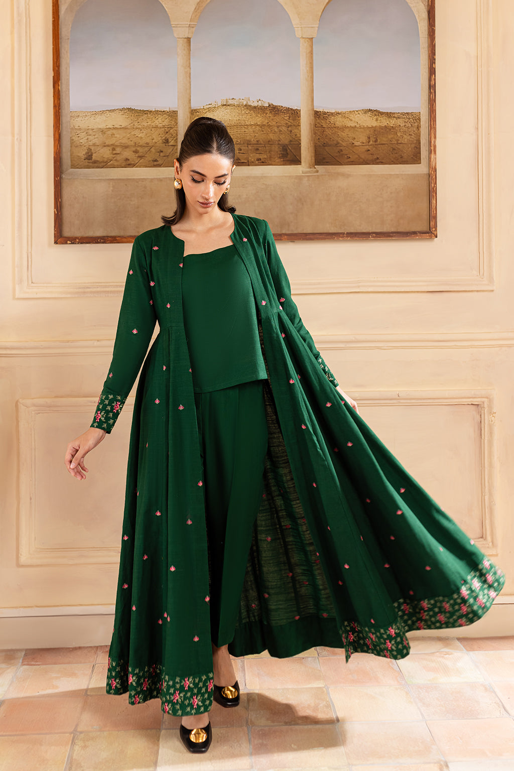 Green flared front open embroidered jacket, paired with straight trousers