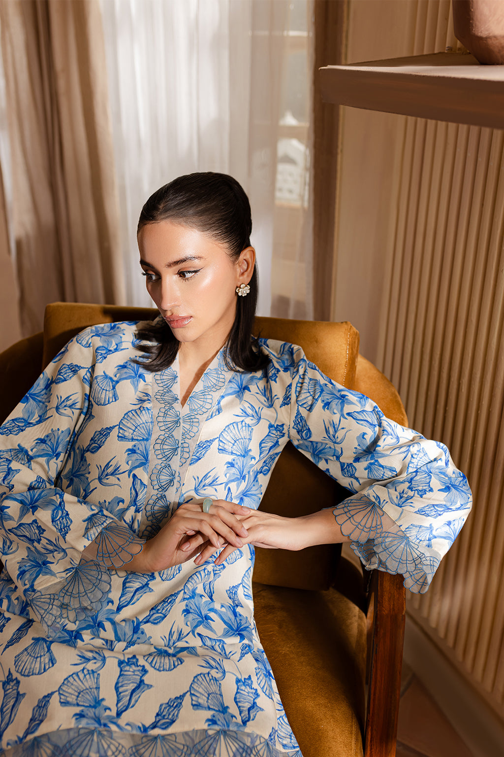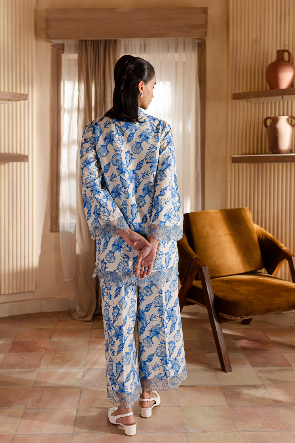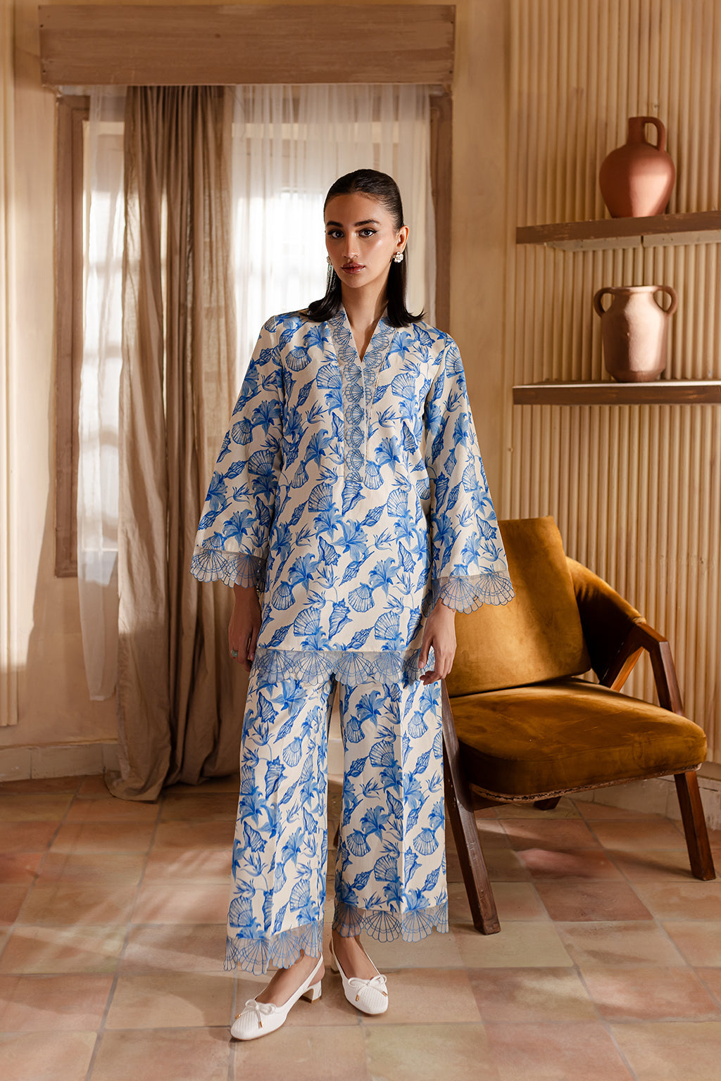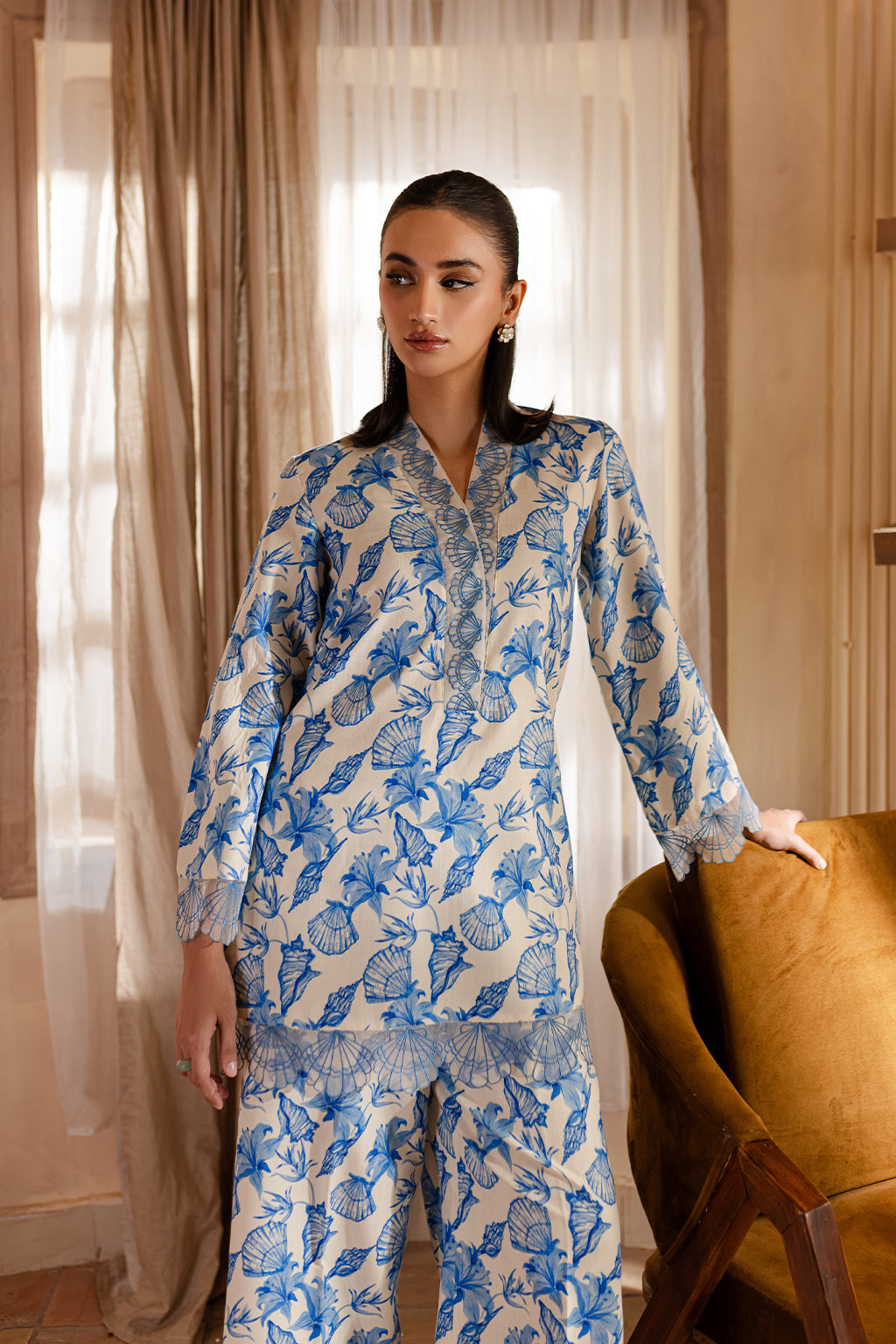 Floral print shirt with embroidered neck, cuffs & Daman, paired with wide legged trousers