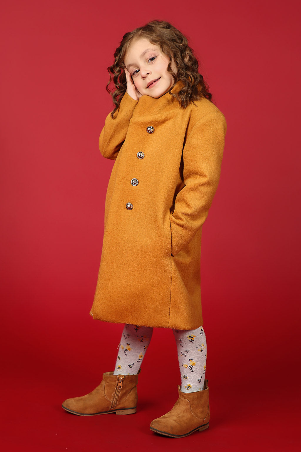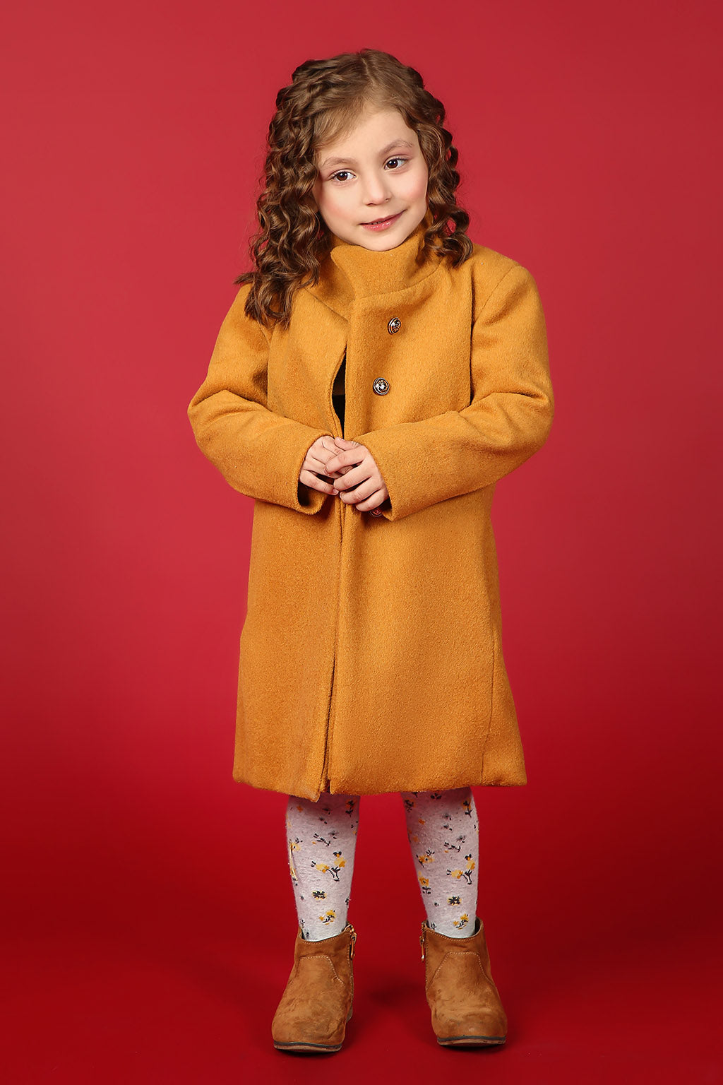 One-piece coat made of wool fabric, featuring front opening with silver buttons.